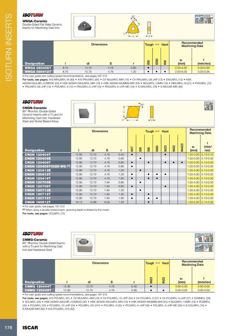 80° 95º 95° WNGA-Ceramic l 95° Double-Sided Flat Rake Ceramic Inserts for Machining Cast Iron r di S Recommended Dimensions Tough 1 Hard Machining Data a p f Designation l di S r IS8 IS80 IS6 (mm) (mm/rev) WNGA 080408T 8.70 12.70 4.76 0.80 • 2.00-4.00 0.20-0.60 WNGA 080412T 8.70 12.70 4.76 1.20 • • • 2.00-5.00 0.03-0.95 • For user guide and cutting speed recommendations, see pages 197-212 ISOTURN INSERTS For tools, see pages: A/S-MWLNR/L-W (83) • A/S-PWLNR/L (84) • C#-MULNR/L-MW (19) • C#-PWLNR/L-08-JHP (13) • DWLNR/L (13) • HSK A63WH-MULNR-J12MWX2 (20) • HSK A63WH-MULNR/L-MW (19) • HSK A63WH-MUMNN-MW (20) • MULNR/L-12MW (18) • MWLNR/L-W (21) • PWLNR/L (12) • PWLNR/L-08-JHP (13) • PWLNR/L-X (14) • PWLNR/L-X-JHP (15) • PWLNR/L-X-JHP-MC (16) • S-DWLNR/L (78) • S-MULNR-MW (85) 80° 95° CNGN-Ceramic 95° 80° Rhombic Double-Sided d Ceramic Inserts with a T-Land for Machining Cast Iron, Hardened r Steel and Nickel Based Alloys l S Recommended Dimensions Tough 1 Hard Machining Data f a p (mm/ Designation l di S r IW7 IS9 IS8 IS80 IN23 IN22 IN420 (mm) rev) CNGN 120404T 12.90 12.70 4.76 0.40 • • 1.00-3.00 0.10-0.43 CNGN 120408E 12.90 12.70 4.76 0.80 • 1.00-3.00 0.10-0.50 CNGN 120408T 12.90 12.70 4.76 0.80 • • • • • 1.00-3.00 0.10-0.50 CNGN 120408T0225-WG (1) 12.90 12.70 4.76 0.80 • 1.00-3.00 0.10-0.50 CNGN 120412E 12.90 12.70 4.76 1.20 • 1.00-5.00 0.10-0.50 CNGN 120412T 12.90 12.70 4.76 1.20 • • • • 1.00-4.00 0.10-0.50 CNGN 120416T 12.90 12.70 4.76 1.60 • • • 1.00-5.00 0.10-0.50 CNGN 120708E 12.90 12.70 7.94 0.80 • 1.00-4.00 0.10-0.50 CNGN 120708T 12.90 12.70 7.94 0.80 • • 1.00-4.00 0.10-0.50 CNGN 120712E 12.90 12.70 7.94 1.20 • 1.00-5.00 0.10-0.50 CNGN 120712T 12.90 12.70 7.94 1.20 • • 1.00-4.00 0.10-0.50 CNGN 120716T 12.90 12.70 7.94 1.60 • • • 1.00-5.00 0.10-0.50 CNGN 160612T 16.12 15.88 6.35 1.20 • 1.00-5.00 0.10-0.50 • For user guide, see pages 197-212 (1) When using a double-ended insert, grooving depth is limited by the insert. For tools, see pages: CCLNR/L (73) 75° 95° CNMG-Ceramic 95° 80° Rhombic Double-Sided Inserts with a T-Land for Machining Cast 95º 75° Iron and Hardened Steel Recommended Dimensions Tough 1 Hard Machining Data a p f Designation l di S r IN23 IN22 (mm) (mm/rev) CNMG 120404T 12.90 12.70 4.76 0.40 • 0.00-0.00 0.00-0.00 CNMG 120408T 12.90 12.70 4.76 0.80 • • 0.00-0.00 0.00-0.00 • For user guide and cutting speed recommendations, see pages 197-212 For tools, see pages: A/S-PCLNR/L (81) • C#-MULNR/L-MW (19) • C#-PCLNR/L-12-JHP (24) • C#-PCLNR/L-X (27) • C#-PCLNR/L-X-JHP (27) • DCBNR/L (28) • DCLNR/L (28) • HSK A63WH-MULNR-J12MWX2 (20) • HSK A63WH-MULNR/L-MW (19) • HSK A63WH-MUMNN-MW (20) • MULNR/L-12MW (18) • PCBNR/L (25) • PCLNR/L (23) • PCLNR/L-12-JHP (24) • PCLNR/L-CA (101) • PCLNR/L-X (25) • PCLNR/L-X-JHP (26) • PCLNR/L-X-JHP-MC (26) • S-DCLNR/L (79) • S-MULNR-MW (85) • A/S-PCLNR/L-X/G (82) 178 ISCAR