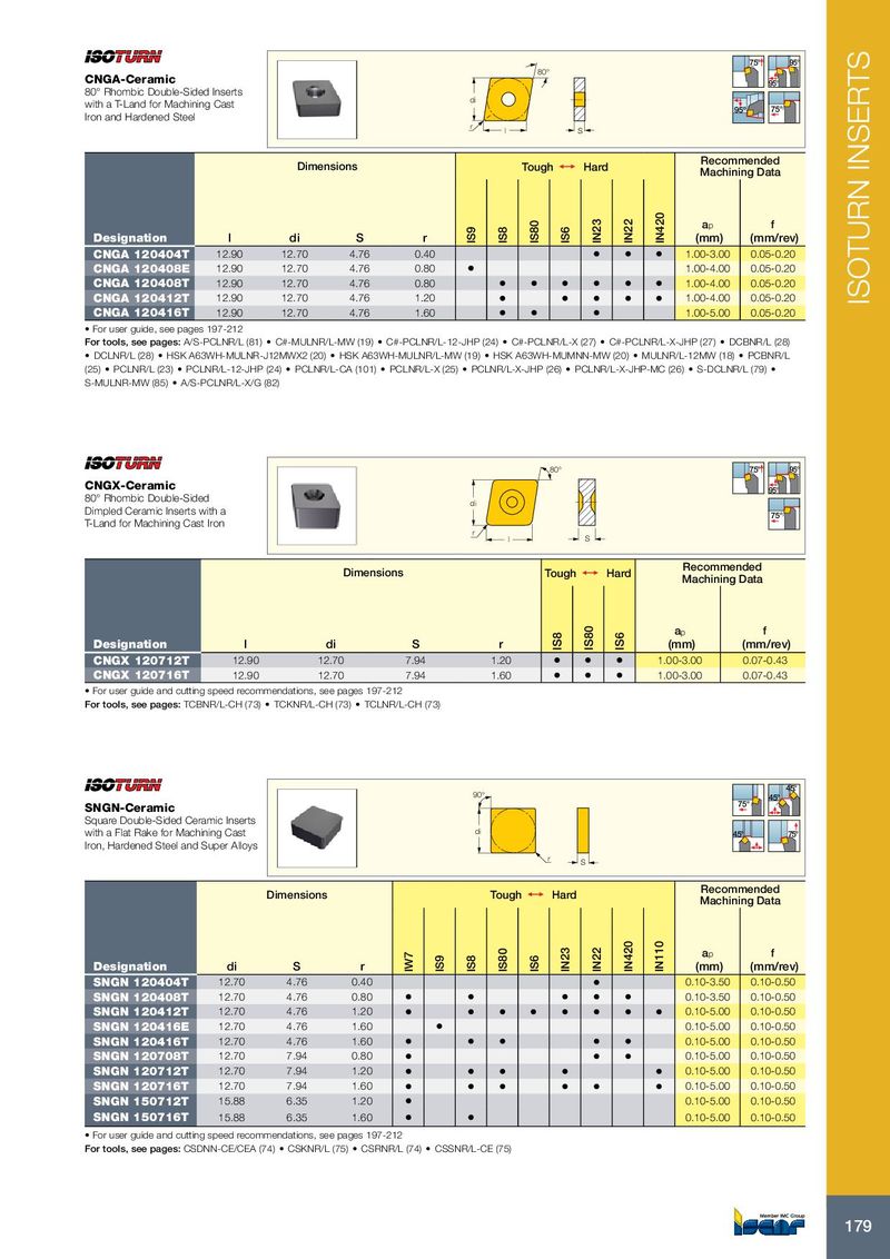 75° 95° 80° CNGA-Ceramic 95° 80° Rhombic Double-Sided Inserts di with a T-Land for Machining Cast 95º 75° Iron and Hardened Steel r l S Recommended Dimensions Tough 1 Hard Machining Data a p f Designation l di S r IS9 IS8 IS80 IS6 IN23 IN22 IN420 (mm) (mm/rev) CNGA 120404T 12.90 12.70 4.76 0.40 • • • 1.00-3.00 0.05-0.20 CNGA 120408E 12.90 12.70 4.76 0.80 • 1.00-4.00 0.05-0.20 CNGA 120408T 12.90 12.70 4.76 0.80 • • • • • • 1.00-4.00 0.05-0.20 CNGA 120412T 12.90 12.70 4.76 1.20 • • • • • 1.00-4.00 0.05-0.20 ISOTURN INSERTS CNGA 120416T 12.90 12.70 4.76 1.60 • • • 1.00-5.00 0.05-0.20 • For user guide, see pages 197-212 For tools, see pages: A/S-PCLNR/L (81) • C#-MULNR/L-MW (19) • C#-PCLNR/L-12-JHP (24) • C#-PCLNR/L-X (27) • C#-PCLNR/L-X-JHP (27) • DCBNR/L (28) • DCLNR/L (28) • HSK A63WH-MULNR-J12MWX2 (20) • HSK A63WH-MULNR/L-MW (19) • HSK A63WH-MUMNN-MW (20) • MULNR/L-12MW (18) • PCBNR/L (25) • PCLNR/L (23) • PCLNR/L-12-JHP (24) • PCLNR/L-CA (101) • PCLNR/L-X (25) • PCLNR/L-X-JHP (26) • PCLNR/L-X-JHP-MC (26) • S-DCLNR/L (79) • S-MULNR-MW (85) • A/S-PCLNR/L-X/G (82) 80° 75° 95° CNGX-Ceramic 95° 80° Rhombic Double-Sided di Dimpled Ceramic Inserts with a 75° T-Land for Machining Cast Iron r l S Recommended Dimensions Tough 1 Hard Machining Data a p f Designation l di S r IS8 IS80 IS6 (mm) (mm/rev) CNGX 120712T 12.90 12.70 7.94 1.20 • • • 1.00-3.00 0.07-0.43 CNGX 120716T 12.90 12.70 7.94 1.60 • • • 1.00-3.00 0.07-0.43 • For user guide and cutting speed recommendations, see pages 197-212 For tools, see pages: TCBNR/L-CH (73) • TCKNR/L-CH (73) • TCLNR/L-CH (73) 45° 90° 45° 75° SNGN-Ceramic Square Double-Sided Ceramic Inserts with a Flat Rake for Machining Cast di 45° 75° Iron, Hardened Steel and Super Alloys r S Recommended Dimensions Tough 1 Hard Machining Data a p f Designation di S r IW7 IS9 IS8 IS80 IS6 IN23 IN22 IN420 IN110 (mm) (mm/rev) SNGN 120404T 12.70 4.76 0.40 • 0.10-3.50 0.10-0.50 SNGN 120408T 12.70 4.76 0.80 • • • • • 0.10-3.50 0.10-0.50 SNGN 120412T 12.70 4.76 1.20 • • • • • • • • 0.10-5.00 0.10-0.50 SNGN 120416E 12.70 4.76 1.60 • 0.10-5.00 0.10-0.50 SNGN 120416T 12.70 4.76 1.60 • • • • • 0.10-5.00 0.10-0.50 SNGN 120708T 12.70 7.94 0.80 • • • 0.10-5.00 0.10-0.50 SNGN 120712T 12.70 7.94 1.20 • • • • • 0.10-5.00 0.10-0.50 SNGN 120716T 12.70 7.94 1.60 • • • • • • 0.10-5.00 0.10-0.50 SNGN 150712T 15.88 6.35 1.20 • 0.10-5.00 0.10-0.50 SNGN 150716T 15.88 6.35 1.60 • • 0.10-5.00 0.10-0.50 • For user guide and cutting speed recommendations, see pages 197-212 For tools, see pages: CSDNN-CE/CEA (74) • CSKNR/L (75) • CSRNR/L (74) • CSSNR/L-CE (75) 179