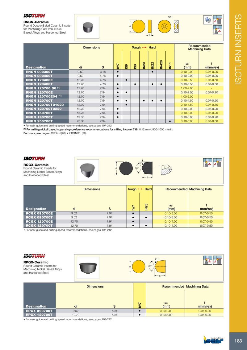 CH RNGN-Ceramic Round Double-Sided Ceramic Inserts di for Machining Cast Iron, Nickel Based Alloys and Hardened Steel S Recommended Dimensions Tough 1 Hard Machining Data a p f Designation di S IW7 IS9 IS8 IN23 IN22 IN420 IN11 (mm) (mm/rev) RNGN 090300T 9.52 3.18 • • 0.10-2.00 0.07-0.20 RNGN 090400T 9.52 4.76 • 0.10-2.00 0.07-0.20 RNGN 120400E 12.70 4.76 • 0.10-3.50 0.07-0.50 RNGN 120400T 12.70 4.76 • • • • 0.10-3.50 0.07-0.50 ISOTURN INSERTS RNGN 120700 S6 (1) 12.70 7.94 • 1.00-2.00 - RNGN 120700E 12.70 7.94 • • 0.10-2.00 0.07-0.20 RNGN 120700E04 (1) 12.70 7.94 • 1.00-2.00 - RNGN 120700T 12.70 7.94 • • • • • 0.10-4.50 0.07-0.50 RNGN 120700T01020 12.70 7.94 • 0.10-4.50 0.07-0.50 RNGN 120700T0220 12.70 7.94 • 0.10-2.00 0.07-0.20 RNGN 150700T 15.76 7.94 • 0.10-3.00 0.07-0.20 RNGN 190700T 19.05 7.94 • 0.10-3.00 0.07-0.20 RNGN 250700T 25.00 7.94 • 0.10-5.00 0.07-0.50 • For user guide and cutting speed recommendations, see pages 197-212 (1) For milling nickel based superalloys; reference recommendations for milling Inconel 718: 0.12 mm/t 900-1000 m/min. For tools, see pages: CRDNN (76) • CRGNR/L (76) 7° RCGX-Ceramic T Round Ceramic Inserts for di 120° a° Machining Nickel Based Alloys and Hardened Steel S Dimensions Tough 1 Hard Recommended Machining Data a p f Designation di S IW7 IN23 (mm) (mm/rev) RCGX 090700E 9.52 7.94 • 0.10-3.00 0.07-0.50 RCGX 090700T 9.52 7.94 • • 0.10-3.00 0.07-0.50 RCGX 120700E 12.70 7.94 • 0.10-4.00 0.07-0.50 RCGX 120700T 12.70 7.94 • • 0.10-4.00 0.07-0.50 • For user guide and cutting speed recommendations, see pages 197-212 11° RPGX-Ceramic Round Ceramic Inserts for di 120° Machining Nickel Based Alloys and Hardened Steel S Dimensions Recommended Machining Data a p f Designation di S IW7 (mm) (mm/rev) RPGX 090700T 9.52 7.94 • 0.10-2.00 0.07-0.20 RPGX 120700T 12.70 7.94 • 0.10-3.00 0.07-0.20 • For user guide and cutting speed recommendations, see pages 197-212 183