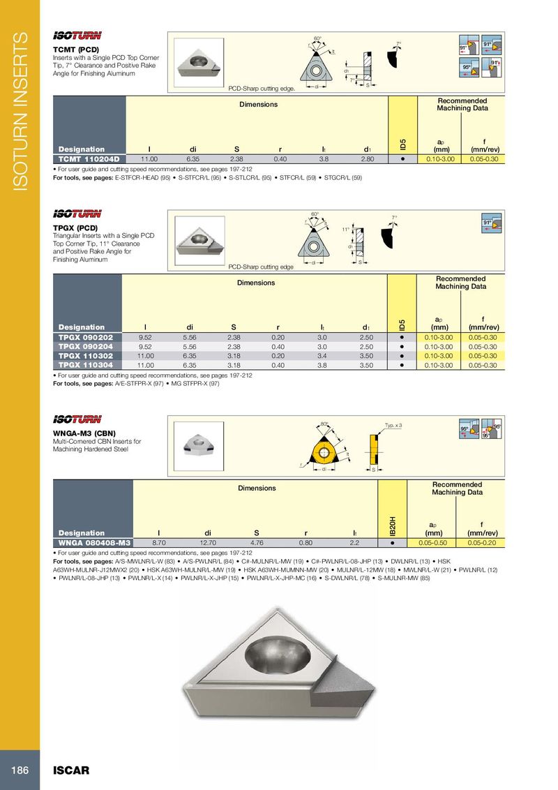 60 ° r 7 ° 91º 91° TCMT (PCD) lt Inserts with a Single PCD Top Corner 91° Tip, 7° Clearance and Positive Rake 95º d1 Angle for Finishing Aluminum 7° PCD-Sharp cutting edge. di S Recommended Dimensions Machining Data a p f Designation l di S r l t d 1 ID5 (mm) (mm/rev) TCMT 110204D 11.00 6.35 2.38 0.40 3.8 2.80 • 0.10-3.00 0.05-0.30 • For user guide and cutting speed recommendations, see pages 197-212 For tools, see pages: E-STFCR-HEAD (95) • S-STFCR/L (95) • S-STLCR/L (95) • STFCR/L (59) • STGCR/L (59) ISOTURN INSERTS 60 ° 7 ° r lt 91º TPGX (PCD) 11 ° Triangular Inserts with a Single PCD Top Corner Tip, 11° Clearance d1 and Positive Rake Angle for Finishing Aluminum di S PCD-Sharp cutting edge Recommended Dimensions Machining Data a p f Designation l di S r l t d 1 ID5 (mm) (mm/rev) TPGX 090202 9.52 5.56 2.38 0.20 3.0 2.50 • 0.10-3.00 0.05-0.30 TPGX 090204 9.52 5.56 2.38 0.40 3.0 2.50 • 0.10-3.00 0.05-0.30 TPGX 110302 11.00 6.35 3.18 0.20 3.4 3.50 • 0.10-3.00 0.05-0.30 TPGX 110304 11.00 6.35 3.18 0.40 3.8 3.50 • 0.10-3.00 0.05-0.30 • For user guide and cutting speed recommendations, see pages 197-212 For tools, see pages: A/E-STFPR-X (97) • MG STFPR-X (97) 80º Typ. x 3 95º 95° WNGA-M3 (CBN) l 95° Multi-Cornered CBN Inserts for Machining Hardened Steel lt r di S Recommended Dimensions Machining Data a p f Designation l di S r l t IB20H (mm) (mm/rev) WNGA 080408-M3 8.70 12.70 4.76 0.80 2.2 • 0.05-0.50 0.05-0.20 • For user guide and cutting speed recommendations, see pages 197-212 For tools, see pages: A/S-MWLNR/L-W (83) • A/S-PWLNR/L (84) • C#-MULNR/L-MW (19) • C#-PWLNR/L-08-JHP (13) • DWLNR/L (13) • HSK A63WH-MULNR-J12MWX2 (20) • HSK A63WH-MULNR/L-MW (19) • HSK A63WH-MUMNN-MW (20) • MULNR/L-12MW (18) • MWLNR/L-W (21) • PWLNR/L (12) • PWLNR/L-08-JHP (13) • PWLNR/L-X (14) • PWLNR/L-X-JHP (15) • PWLNR/L-X-JHP-MC (16) • S-DWLNR/L (78) • S-MULNR-MW (85) 186 ISCAR