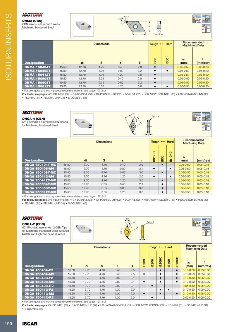 lt 55° 62.5° DNMA (CBN) 93º CBN Inserts with a Flat Rake for r di Machining Hardened Steel 93° l S Recommended Dimensions Tough 1 Hard Machining Data a p f Designation l di S r l t IB55 IB50 (mm) (mm/rev) DNMA 150404T 15.50 12.70 4.76 0.40 2.8 • 0.05-0.50 0.05-0.20 DNMA 150408T 15.50 12.70 4.76 0.80 3.2 • • 0.05-0.50 0.05-0.20 DNMA 150412T 15.50 12.70 4.76 1.20 3.0 • 0.05-0.50 0.05-0.20 ISOTURN INSERTS DNMA 150604T 15.50 12.70 6.35 0.40 2.8 • 0.05-0.50 0.05-0.20 DNMA 150608T 15.50 12.70 6.35 0.80 3.2 • 0.05-0.50 0.05-0.20 DNMA 150612T 15.50 12.70 6.35 1.20 3.0 • • 0.05-0.50 0.05-0.20 • For user guide and cutting speed recommendations, see pages 197-212 For tools, see pages: A/S-PDUNR/L (86) • C#-DDJNR/L (33) • C#-PDJNR/L-JHP (32) • DDJNR/L (32) • HSK A63WH-DDJNR/L (33) • HSK A63WH-DDNNN (33) • PDJNR/L (31) • PDJNR/L-JHP (31) • S-DDUNR/L (86) 55º di Typ. x 4 62.5° DNGA-4 (CBN) lt l 93º 55° Rhombic 4-Cornered CBN Inserts for Machining Hardened Steel 93° r S Recommended Dimensions Tough 1 Hard Machining Data a p f Designation l di S r l t IB25HC IB55 IB10HC (mm) (mm/rev) DNGA 150404T-MC 15.50 12.70 4.76 0.40 2.9 • 0.05-0.50 0.05-0.18 DNGA 150408-M4 15.50 12.70 4.76 0.80 2.1 • • 0.05-0.50 0.05-0.18 DNGA 150408T-MC 15.50 12.70 4.76 0.80 3.0 • 0.05-0.50 0.05-0.18 DNGA 150412-M4 15.50 12.70 4.76 1.20 2.0 • • 0.05-0.50 0.05-0.18 DNGA 150412T-MC 15.50 12.70 4.76 1.20 3.0 • 0.05-0.50 0.05-0.18 DNGA 150604T-MC 15.50 12.70 6.35 0.40 2.9 • 0.05-0.50 0.05-0.18 DNGA 150608T-MC 15.50 12.70 6.35 0.80 3.0 • 0.05-0.50 0.05-0.18 DNGA 150612T-MC 15.50 12.70 6.35 1.20 3.0 • 0.05-0.50 0.05-0.18 • For user guide and cutting speed recommendations, see pages 197-212 For tools, see pages: A/S-PDUNR/L (86) • C#-DDJNR/L (33) • C#-PDJNR/L-JHP (32) • DDJNR/L (32) • HSK A63WH-DDJNR/L (33) • HSK A63WH-DDNNN (33) • PDJNR/L (31) • PDJNR/L-JHP (31) • S-DDUNR/L (86) 55º Typ. x 2 62.5° DNGA-2 (CBN) lt l 93º 55° Rhombic Inserts with 2 CBN Tips for Machining Hardened Steel, Sintered di 93° Metals and High Temperature Alloys r S Recommended Dimensions Tough 1 Hard Machining Data a p f Designation l di S r l t IB10S IB20H IB20HC IB10H IB10HC (mm) (mm/rev) DNGA 150404-F2 15.50 12.70 4.76 0.40 2.5 • • 0.10-0.50 0.05-0.30 DNGA 150404-M2 15.50 12.70 4.76 0.40 2.5 • • • 0.10-0.50 0.05-0.30 DNGA 150408-F2 15.50 12.70 4.76 0.80 2.1 • • 0.10-0.50 0.05-0.30 DNGA 150408-M2 15.50 12.70 4.76 0.80 2.1 • • • 0.10-0.50 0.05-0.30 DNGA 150408-R2 15.50 12.70 4.76 0.80 2.1 • 0.05-0.50 0.05-0.20 DNGA 150412-F2 15.50 12.70 4.76 1.20 2.0 • • 0.10-0.50 0.05-0.30 DNGA 150412-M2 15.50 12.70 4.76 1.20 2.0 • • • 0.10-0.50 0.05-0.30 DNGA 150412-R2 15.50 12.70 4.76 1.20 2.0 • 0.05-0.50 0.05-0.20 • For user guide and cutting speed recommendations, see pages 197-212 For tools, see pages: C#-DDJNR/L (33) • C#-PDJNR/L-JHP (32) • HSK A63WH-DDJNR/L (33) • HSK A63WH-DDNNN (33) • PDJNR/L (31) • PDJNR/L-JHP (31) • S-DDUNR/L (86) 190 ISCAR