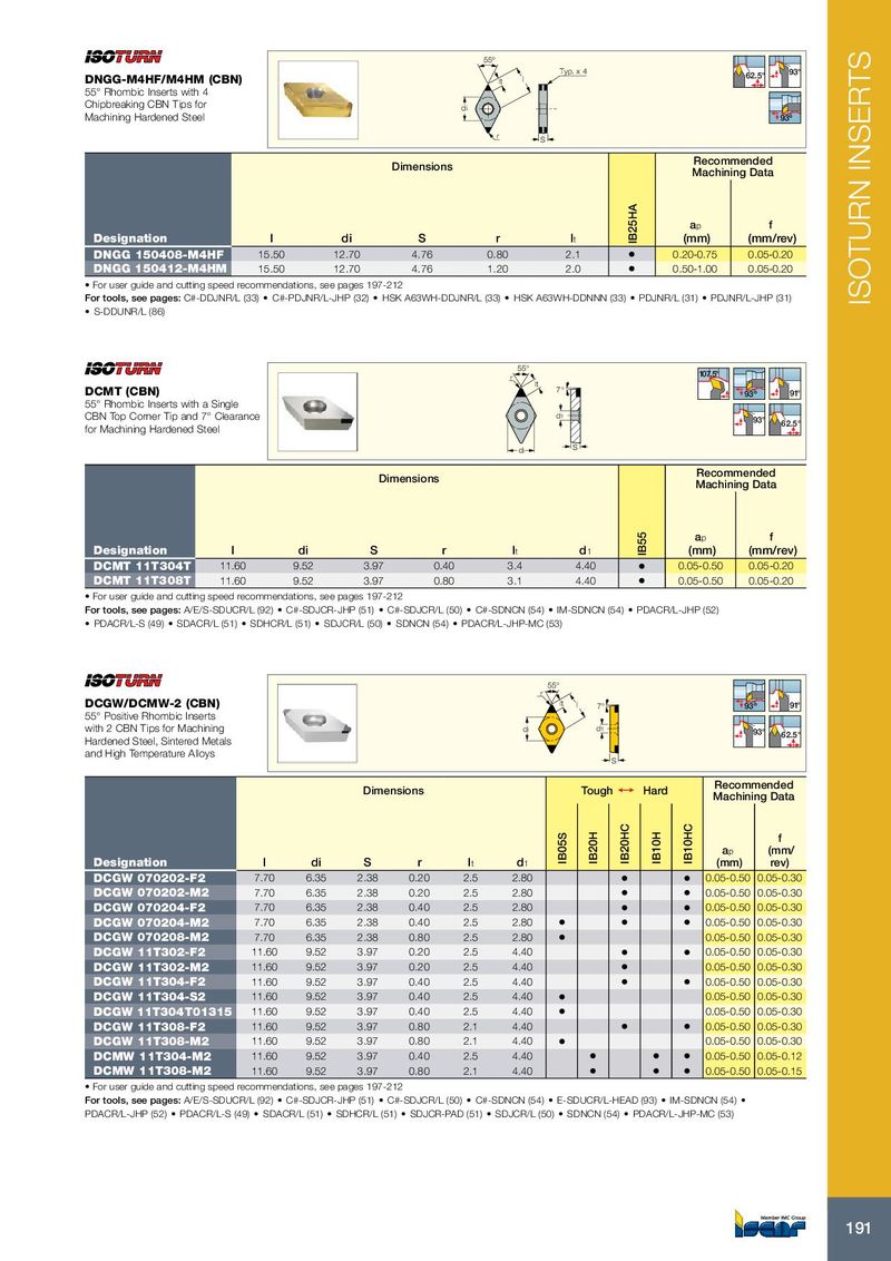 55º Typ. x 4 62.5° 93° DNGG-M4HF/M4HM (CBN) lt l 55° Rhombic Inserts with 4 Chipbreaking CBN Tips for di Machining Hardened Steel 93º r S Recommended Dimensions Machining Data a p f Designation l di S r l t IB25HA (mm) (mm/rev) DNGG 150408-M4HF 15.50 12.70 4.76 0.80 2.1 • 0.20-0.75 0.05-0.20 DNGG 150412-M4HM 15.50 12.70 4.76 1.20 2.0 • 0.50-1.00 0.05-0.20 • For user guide and cutting speed recommendations, see pages 197-212 For tools, see pages: C#-DDJNR/L (33) • C#-PDJNR/L-JHP (32) • HSK A63WH-DDJNR/L (33) • HSK A63WH-DDNNN (33) • PDJNR/L (31) • PDJNR/L-JHP (31) ISOTURN INSERTS • S-DDUNR/L (86) 55 ° r 107.5° lt DCMT (CBN) 7 ° 93º 91° 55° Rhombic Inserts with a Single CBN Top Corner Tip and 7° Clearance d1 93° 62.5° for Machining Hardened Steel di S Recommended Dimensions Machining Data a p f Designation l di S r l t d 1 IB55 (mm) (mm/rev) DCMT 11T304T 11.60 9.52 3.97 0.40 3.4 4.40 • 0.05-0.50 0.05-0.20 DCMT 11T308T 11.60 9.52 3.97 0.80 3.1 4.40 • 0.05-0.50 0.05-0.20 • For user guide and cutting speed recommendations, see pages 197-212 For tools, see pages: A/E/S-SDUCR/L (92) • C#-SDJCR-JHP (51) • C#-SDJCR/L (50) • C#-SDNCN (54) • IM-SDNCN (54) • PDACR/L-JHP (52) • PDACR/L-S (49) • SDACR/L (51) • SDHCR/L (51) • SDJCR/L (50) • SDNCN (54) • PDACR/L-JHP-MC (53) 55 ° r DCGW/DCMW-2 (CBN) lt l 7 ° 93º 91° 55° Positive Rhombic Inserts with 2 CBN Tips for Machining di d1 93° 62.5° Hardened Steel, Sintered Metals and High Temperature Alloys S Recommended Dimensions Tough 1 Hard Machining Data f a p (mm/ Designation l di S r l t d 1 IB05S IB20H IB20HC IB10H IB10HC (mm) rev) DCGW 070202-F2 7.70 6.35 2.38 0.20 2.5 2.80 • • 0.05-0.50 0.05-0.30 DCGW 070202-M2 7.70 6.35 2.38 0.20 2.5 2.80 • • 0.05-0.50 0.05-0.30 DCGW 070204-F2 7.70 6.35 2.38 0.40 2.5 2.80 • • 0.05-0.50 0.05-0.30 DCGW 070204-M2 7.70 6.35 2.38 0.40 2.5 2.80 • • • 0.05-0.50 0.05-0.30 DCGW 070208-M2 7.70 6.35 2.38 0.80 2.5 2.80 • 0.05-0.50 0.05-0.30 DCGW 11T302-F2 11.60 9.52 3.97 0.20 2.5 4.40 • • 0.05-0.50 0.05-0.30 DCGW 11T302-M2 11.60 9.52 3.97 0.20 2.5 4.40 • 0.05-0.50 0.05-0.30 DCGW 11T304-F2 11.60 9.52 3.97 0.40 2.5 4.40 • • 0.05-0.50 0.05-0.30 DCGW 11T304-S2 11.60 9.52 3.97 0.40 2.5 4.40 • 0.05-0.50 0.05-0.30 DCGW 11T304T01315 11.60 9.52 3.97 0.40 2.5 4.40 • 0.05-0.50 0.05-0.30 DCGW 11T308-F2 11.60 9.52 3.97 0.80 2.1 4.40 • • 0.05-0.50 0.05-0.30 DCGW 11T308-M2 11.60 9.52 3.97 0.80 2.1 4.40 • 0.05-0.50 0.05-0.30 DCMW 11T304-M2 11.60 9.52 3.97 0.40 2.5 4.40 • • • 0.05-0.50 0.05-0.12 DCMW 11T308-M2 11.60 9.52 3.97 0.80 2.1 4.40 • • • 0.05-0.50 0.05-0.15 • For user guide and cutting speed recommendations, see pages 197-212 For tools, see pages: A/E/S-SDUCR/L (92) • C#-SDJCR-JHP (51) • C#-SDJCR/L (50) • C#-SDNCN (54) • E-SDUCR/L-HEAD (93) • IM-SDNCN (54) • PDACR/L-JHP (52) • PDACR/L-S (49) • SDACR/L (51) • SDHCR/L (51) • SDJCR-PAD (51) • SDJCR/L (50) • SDNCN (54) • PDACR/L-JHP-MC (53) 191