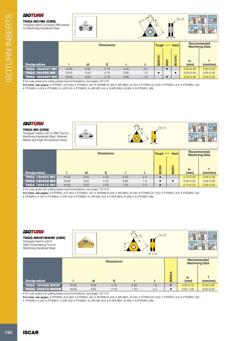 60º di Typ. x 6 91º 91° TNGA-MC/M6 (CBN) lt 93° Triangular Multi-Cornered CBN Inserts l 91° for Machining Hardened Steel 95º 60° r S Recommended Dimensions Tough 1 Hard Machining Data a p f Designation l di S r l t IB25HC IB55 IB10HC (mm) (mm/rev) TNGA 160404T-MC 16.50 9.52 4.76 0.40 3.2 • 0.05-0.50 0.05-0.20 TNGA 160408-M6 16.50 9.52 4.76 0.80 1.9 • • 0.05-0.50 0.05-0.20 TNGA 160408T-MC 16.50 9.52 4.76 0.80 1.9 • 0.05-0.50 0.05-0.20 ISOTURN INSERTS • For user guide and cutting speed recommendations, see pages 197-212 For tools, see pages: A-PTFNR/L-X/G (88) • DTGNR/L (42) • MTENN-W (45) • MTJNR/L-W (45) • PTFNR-CA (102) • PTFNR/L (44) • PTGNR/L (42) • PTGNR/L-X (43) • PTGNR/L-X-JHP (43) • PTGNR/L-X-JHP-MC (44) • S-MTLNR/L-W (89) • S-PTFNR/L (88) 60º Typ. x 3 91º 91° TNGA-M3 (CBN) lt 93° Triangular Inserts with 3 CBN Tips for l 91° Machining Hardened Steel, Sintered 95º di 60° Metals and High Temperature Alloys S Recommended Dimensions Tough 1 Hard Machining Data a p f Designation l di S r l t IB10S IB20H (mm) (mm/rev) TNGA 160404-M3 16.50 9.52 4.76 0.40 2.2 • 0.10-0.50 0.05-0.30 TNGA 160408-M3 16.50 9.52 4.76 0.80 1.9 • • 0.05-0.50 0.05-0.30 TNGA 160412-M3 16.50 9.52 4.76 1.20 2.4 • 0.10-0.50 0.05-0.30 • For user guide and cutting speed recommendations, see pages 197-212 For tools, see pages: A-PTFNR/L-X/G (88) • DTGNR/L (42) • MTENN-W (45) • MTJNR/L-W (45) • PTFNR-CA (102) • PTFNR/L (44) • PTGNR/L (42) • PTGNR/L-X (43) • PTGNR/L-X-JHP (43) • PTGNR/L-X-JHP-MC (44) • S-MTLNR/L-W (89) • S-PTFNR/L (88) 60º Typ. x 6 91º 91° TNGG-M6HF/M6HM (CBN) lt 93° Triangular Inserts with 6 l 91° CBN Chipbreaking Tips for 95º di 60° Machining Hardened Steel S Recommended Dimensions Machining Data a p f Designation l di S r l t IB25HA (mm) (mm/rev) TNGG 160408-M6HF 16.50 9.52 4.76 0.80 1.9 • 0.20-0.75 0.05-0.20 TNGG 160412-M6HM 16.50 9.52 4.76 1.20 2.4 • 0.50-1.00 0.05-0.20 • For user guide and cutting speed recommendations, see pages 197-212 For tools, see pages: A-PTFNR/L-X/G (88) • DTGNR/L (42) • MTENN-W (45) • MTJNR/L-W (45) • PTFNR-CA (102) • PTFNR/L (44) • PTGNR/L (42) • PTGNR/L-X (43) • PTGNR/L-X-JHP (43) • PTGNR/L-X-JHP-MC (44) • S-MTLNR/L-W (89) • S-PTFNR/L (88) 194 ISCAR
