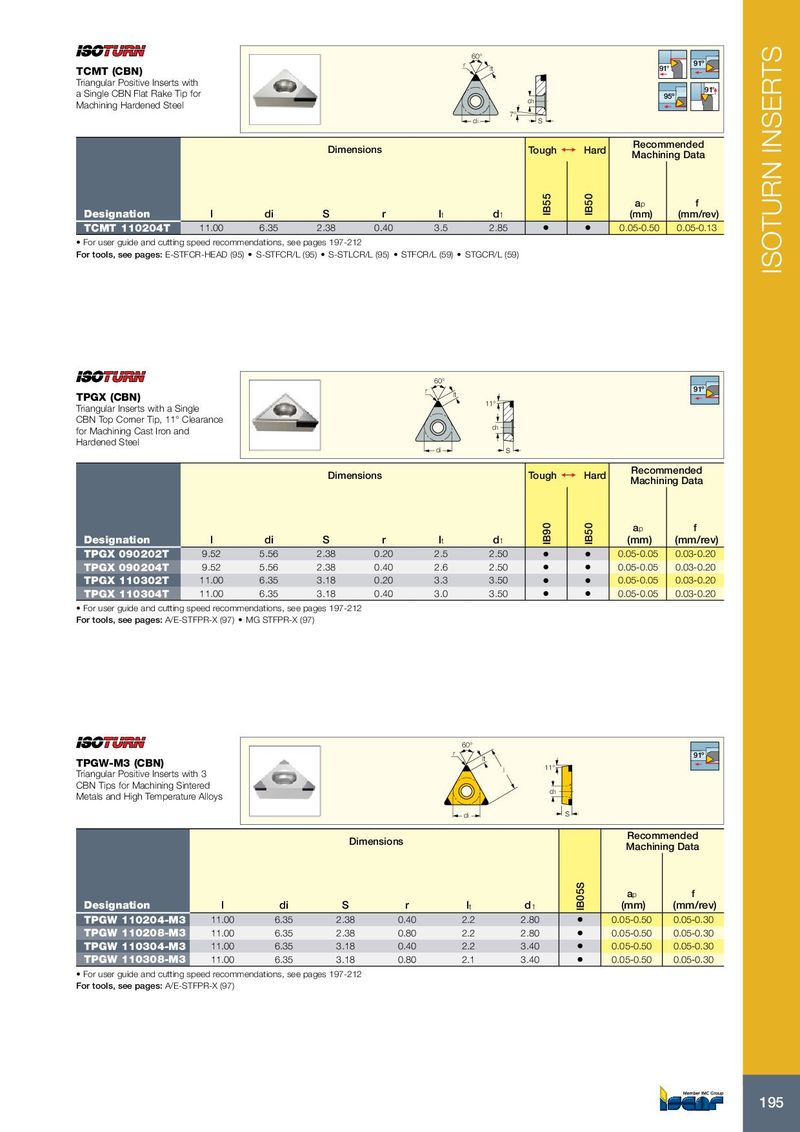 60 ° r 91º TCMT (CBN) lt 91° Triangular Positive Inserts with 91° a Single CBN Flat Rake Tip for 95º d1 Machining Hardened Steel 7° di S Recommended Dimensions Tough 1 Hard Machining Data a p f Designation l di S r l t d 1 IB55 IB50 (mm) (mm/rev) TCMT 110204T 11.00 6.35 2.38 0.40 3.5 2.85 • • 0.05-0.50 0.05-0.13 • For user guide and cutting speed recommendations, see pages 197-212 For tools, see pages: E-STFCR-HEAD (95) • S-STFCR/L (95) • S-STLCR/L (95) • STFCR/L (59) • STGCR/L (59) ISOTURN INSERTS 60 ° r 91º TPGX (CBN) lt 11 ° Triangular Inserts with a Single CBN Top Corner Tip, 11° Clearance d1 for Machining Cast Iron and Hardened Steel di S Recommended Dimensions Tough 1 Hard Machining Data a p f Designation l di S r l t d 1 IB90 IB50 (mm) (mm/rev) TPGX 090202T 9.52 5.56 2.38 0.20 2.5 2.50 • • 0.05-0.05 0.03-0.20 TPGX 090204T 9.52 5.56 2.38 0.40 2.6 2.50 • • 0.05-0.05 0.03-0.20 TPGX 110302T 11.00 6.35 3.18 0.20 3.3 3.50 • • 0.05-0.05 0.03-0.20 TPGX 110304T 11.00 6.35 3.18 0.40 3.0 3.50 • • 0.05-0.05 0.03-0.20 • For user guide and cutting speed recommendations, see pages 197-212 For tools, see pages: A/E-STFPR-X (97) • MG STFPR-X (97) 60 ° r lt 91º TPGW-M3 (CBN) l 11 ° Triangular Positive Inserts with 3 CBN Tips for Machining Sintered d1 Metals and High Temperature Alloys di S Recommended Dimensions Machining Data a p f Designation l di S r l t d 1 IB05S (mm) (mm/rev) TPGW 110204-M3 11.00 6.35 2.38 0.40 2.2 2.80 • 0.05-0.50 0.05-0.30 TPGW 110208-M3 11.00 6.35 2.38 0.80 2.2 2.80 • 0.05-0.50 0.05-0.30 TPGW 110304-M3 11.00 6.35 3.18 0.40 2.2 3.40 • 0.05-0.50 0.05-0.30 TPGW 110308-M3 11.00 6.35 3.18 0.80 2.1 3.40 • 0.05-0.50 0.05-0.30 • For user guide and cutting speed recommendations, see pages 197-212 For tools, see pages: A/E-STFPR-X (97) 195