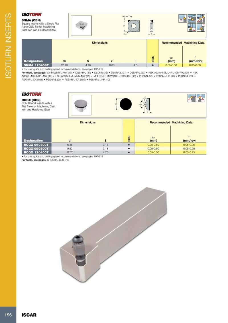 45° 90 ° lt 45° 75° SNMA (CBN) 75º Square Inserts with a Single Flat di Rake CBN Tip for Machining 45° 75° Cast Iron and Hardened Steel r S Dimensions Recommended Machining Data a p f Designation di S r l t IB55 (mm) (mm/rev) SNMA 120408T 12.70 4.76 0.80 4.5 • 0.05-0.50 0.05-0.30 • For user guide and cutting speed recommendations, see pages 197-212 For tools, see pages: C#-MULNR/L-MW (19) • DSBNR/L (37) • DSDNN (36) • DSKNR/L (37) • DSSNR/L (37) • HSK A63WH-MULNR-J12MWX2 (20) • HSK A63WH-MULNR/L-MW (19) • HSK A63WH-MUMNN-MW (20) • MULNR/L-12MW (18) • PSBNR/L (41) • PSDNN (38) • PSDNN-JHP (39) • PSKNR/L (39) • ISOTURN INSERTS PSKNR/L-CA (101) • PSSNR/L (39) • PSSNR/L-CA (102) • PSSNR/L-JHP (40) 7° RCGX (CBN) CBN Round Inserts with a di 140° Flat Rake for Machining Cast Iron and Hardened Steel S Dimensions Recommended Machining Data a p f Designation di S IB90 (mm) (mm/rev) RCGX 060300T 6.35 3.18 • 0.05-0.50 0.05-0.25 RCGX 090300T 9.52 3.18 • 0.05-0.50 0.05-0.25 RCGX 120400T 12.70 4.76 • 0.05-0.50 0.05-0.25 • For user guide and cutting speed recommendations, see pages 197-212 For tools, see pages: CRGCR/L-CEB (76) 196 ISCAR