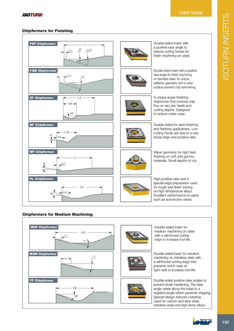 USER GUIDE Chipformers for Finishing F3P Chipformer Double-sided insert with 1.7 a positive rack angle to 0.1 6° 12.5° reduce cutting forces for finish machining on steel. F3M Chipformer Double-sided insert with a positive 0.15 rake angle for finish machining 15° on stainless steel. Its unique ISOTURN INSERTS deflector geometry with a wavy surface prevents chip hammering. SF Chipformer 1.5 A unique super-finishing chipformer that controls chip 0.6 flow at very low feeds and cutting depths. Designed 18˚ to reduce crater wear. NF Chipformer Double-sided for semi-finishing and finishing applications. Low 1.42 cutting forces are due to a very 4º 0.4 sharp edge and positive rake. WF Chipformer Wiper geometry for high feed finishing on soft and gummy 1.7 materials. Small depths of cut. 8˚ 0.1 VL Chipformer High positive rake and a special edge preparation used 3.3 for rough and finish turning on high temperature alloys. 16° 0.47 Excellent performance on parts such as automotive valves. Chipformers for Medium Machining M3P Chipformer Double-sided insert for .053 medium machining on steel 0.1 with a reinforced cutting edge to increase tool life. 11° M3M Chipformer Double-sided insert for medium 11° 0.2 machining on stainless steel with a reinforced cutting edge that prevents notch wear at tight radii to increase tool life. TF Chipformer Double-sided positive rake angles to prevent strain hardening. The rake angle varies along the edge to a negative angle which prevents chipping. Special design reduces cratering. Used for carbon and alloy steel, stainless steel and high-temp alloys. 197 197