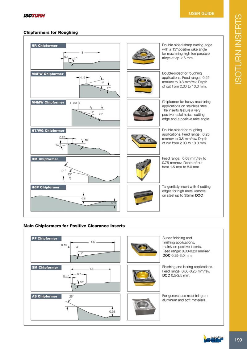 USER GUIDE Chipformers for Roughing NR Chipformer Double-sided sharp cutting edge with a 13º positive rake angle 3 for machining high temperature 0.4 11˚ alloys at ap < 6 mm. M4PW Chipformer Double-sided for roughing 0.19 applications. Feed range: 0.25 14º mm/rev to 0.8 mm/rev. Depth ISOTURN INSERTS of cut from 2.00 to 10.0 mm. 17º M4MW Chipformer 0.3 Chipformer for heavy machining applications on stainless steel. 13º The inserts feature a very 21º positive radial helical cutting edge and a positive rake angle. HT/WG Chipformer Double-sided for roughing applications. Feed range: 0.25 0.25 mm/rev to 0.8 mm/rev. Depth 16˚ of cut from 2.00 to 10.0 mm. 14˚ HM Chipformer Feed range: 0.08 mm/rev to 0.75 mm/rev. Depth of cut from 1.5 mm to 8.0 mm. 21 ˚ 13 ˚ H6P Chipformer Tangentially insert with 4 cutting edges for high metal removal on steel up to 35mm DOC 0.31 0.24 Main Chipformers for Positive Clearance Inserts PF Chipformer Super finishing and 1.6 finishing applications, 0.15 mainly on positive inserts. Feed range: 0.03-0.20 mm/rev. 7˚ DOC 0.25-3.0 mm. SM Chipformer Finishing and boring applications. 1.8 Feed range: 0.06-0.25 mm/rev. 0.7 0.07 DOC 0.5-2.5 mm. 18˚ AS Chipformer 26˚ For general use machining on aluminum and soft materials. 0.65 199 199
