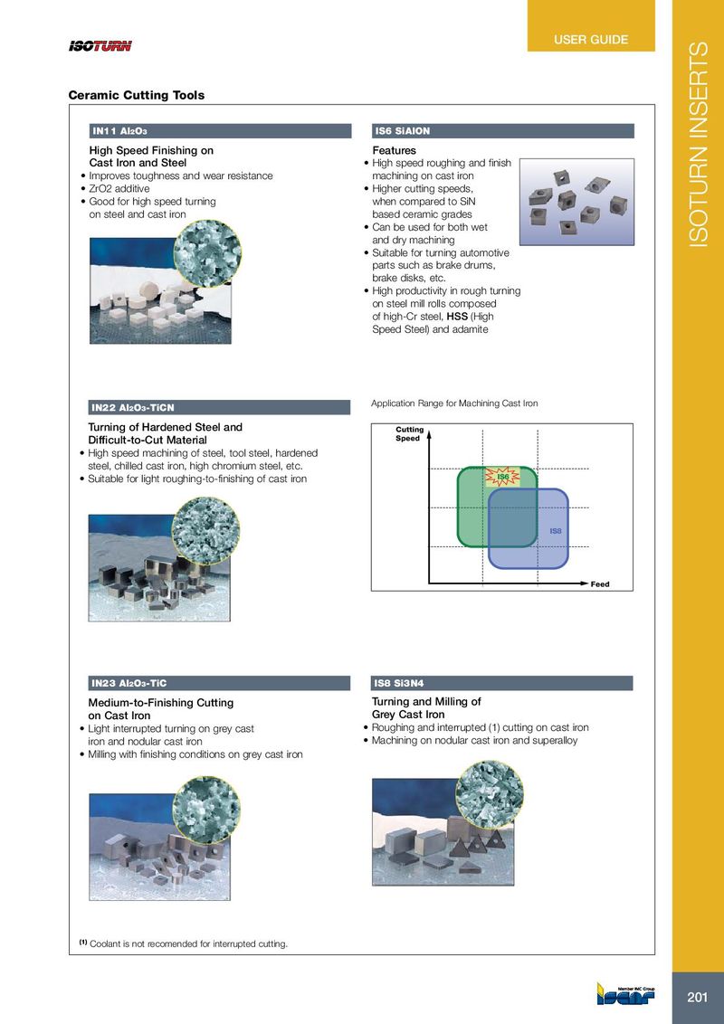 USER GUIDE Ceramic Cutting Tools IN11 Al 2 O 3 IS6 SiAlON High Speed Finishing on Features Cast Iron and Steel • High speed roughing and finish • Improves toughness and wear resistance machining on cast iron • ZrO2 additive • Higher cutting speeds, • Good for high speed turning when compared to SiN on steel and cast iron based ceramic grades • Can be used for both wet and dry machining ISOTURN INSERTS • Suitable for turning automotive parts such as brake drums, brake disks, etc. • High productivity in rough turning on steel mill rolls composed of high-Cr steel, HSS (High Speed Steel) and adamite Application Range for Machining Cast Iron IN22 Al 2 O 3 -TiCN Turning of Hardened Steel and Cutting Difficult-to-Cut Material Speed • High speed machining of steel, tool steel, hardened steel, chilled cast iron, high chromium steel, etc. • Suitable for light roughing-to-finishing of cast iron IS6 IS8 Feed IN23 Al 2 O 3 -TiC IS8 Si3N4 Medium-to-Finishing Cutting Turning and Milling of on Cast Iron Grey Cast Iron • Light interrupted turning on grey cast • Roughing and interrupted (1) cutting on cast iron iron and nodular cast iron • Machining on nodular cast iron and superalloy • Milling with finishing conditions on grey cast iron (1) Coolant is not recomended for interrupted cutting. 201 201