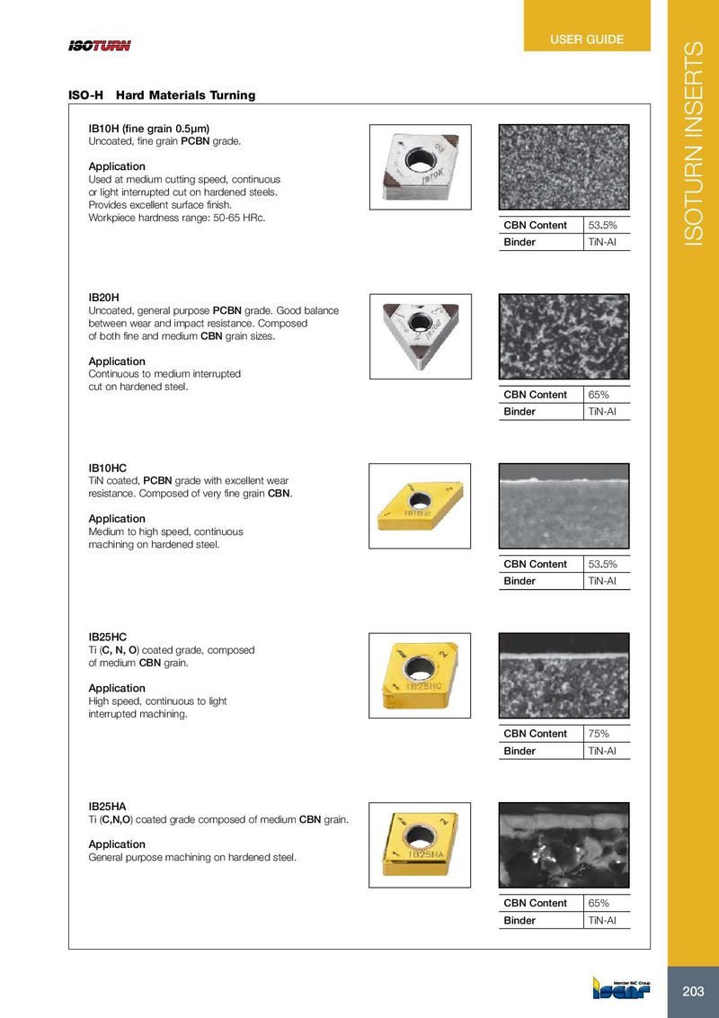 USER GUIDE ISO-H Hard Materials Turning IB10H (fine grain 0.5µm) Uncoated, fine grain PCBN grade. Application Used at medium cutting speed, continuous or light interrupted cut on hardened steels. Provides excellent surface finish. Workpiece hardness range: 50-65 HRc. CBN Content 53.5% Binder TiN-Al ISOTURN INSERTS IB20H Uncoated, general purpose PCBN grade. Good balance between wear and impact resistance. Composed of both fine and medium CBN grain sizes. Application Continuous to medium interrupted cut on hardened steel. CBN Content 65% Binder TiN-Al IB10HC TiN coated, PCBN grade with excellent wear resistance. Composed of very fine grain CBN. Application Medium to high speed, continuous machining on hardened steel. CBN Content 53.5% Binder TiN-Al IB25HC Ti (C, N, O) coated grade, composed of medium CBN grain. Application High speed, continuous to light interrupted machining. CBN Content 75% Binder TiN-Al IB25HA Ti (C,N,O) coated grade composed of medium CBN grain. Application General purpose machining on hardened steel. CBN Content 65% Binder TiN-Al 203 203