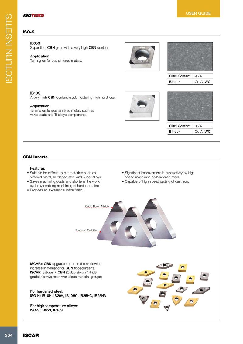 USER GUIDE ISO-S IB05S Super fine, CBN grain with a very high CBN content. Application Turning on ferrous sintered metals. CBN Content 95% ISOTURN INSERTS Binder Co-Al-WC IB10S A very high CBN content grade, featuring high hardness. Application Turning on ferrous sintered metals such as valve seats and Ti alloys components. CBN Content 95% Binder Co-Al-WC CBN Inserts Features • Suitable for difficult-to-cut materials such as • Significant improvement in productivity by high sintered metal, hardened steel and super alloys. speed machining on hardened steel. • Saves machining costs and shortens the work • Capable of high speed cutting of cast iron. cycle by enabling machining of hardened steel. • Provides an excellent surface finish. Cubic Boron Nitride Tungsten Carbide ISCAR’s CBN upgrade supports the worldwide increase in demand for CBN tipped inserts. ISCAR features 7 CBN (Cubic Boron Nitride) grades for two main workpiece material groups: For hardened steel: ISO-H: IB10H, IB20H, IB10HC, IB25HC, IB25HA For high temperature alloys: ISO-S: IB05S, IB10S 204 204 ISCAR ISCAR