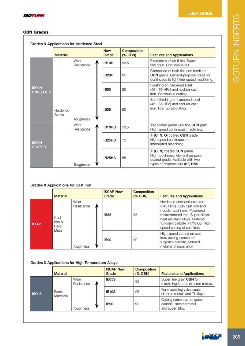 USER GUIDE CBN Grades Grades & Applications for Hardened Steel New Composition Material Grade (% CBN) Features and Applications Wear Excellent surface finish. Super IB10H 53.5 Resistance fine grain. Continuous cut. Composed of both fine and medium IB20H 65 CBN grains. General-purpose grade for continuous to light interrupted machining. ISOTURN INSERTS Finishing on hardened steel ISO-H IB50 50 (45 - 65 HRc) and nodular cast UNCOATED iron. Continuous cutting. Semi-finishing on hardened steel (45 - 65 HRc) and nodular cast Hardened IB55 60 iron. Interrupted cutting. Steels Toughness Wear TiN coated grade very fine CBN grain. IB10HC 53.5 Resistance High speed continuous machining. Ti (C, N, O) coated CBN grade. IB25HC 75 High speed continuous to ISO-H interrupted machining. COATED Ti (C, N) coated CBN grade. High toughness. General purpose IB25HA 65 coated grade. Available with two Toughness types of chipbreakers (HF, HM). Grades & Applications for Cast Iron ISCAR New Composition Material Grade (% CBN) Features and Applications Wear Hardened steel and cast iron Resistance (>45 HRc). Grey cast iron and nodular cast irons. Powdered IB85 85 metal/sintered iron. Super alloys/ Cast heat resistant alloys. Sintered Iron & ISO-K tungsten carbide >17% Co. High Hard speed cutting of cast iron. Metal High speed cutting on cast iron, cutting cemented IB90 90 tungsten carbide, sintered Toughness metal and super alloy. Grades & Applications for High Temperature Alloys ISCAR New Composition Material Grade (% CBN) Features and Applications Wear IB05S Super fine grain CBN for 95 Resistance machining ferrous sintered metals. For machining valve seats, Exotic IB10S 95 ISO-S sintered metals and Ti alloys. Materials Cutting cemented tungsten IB90 90 carbide, sintered metal Toughness and super alloy. 205 205