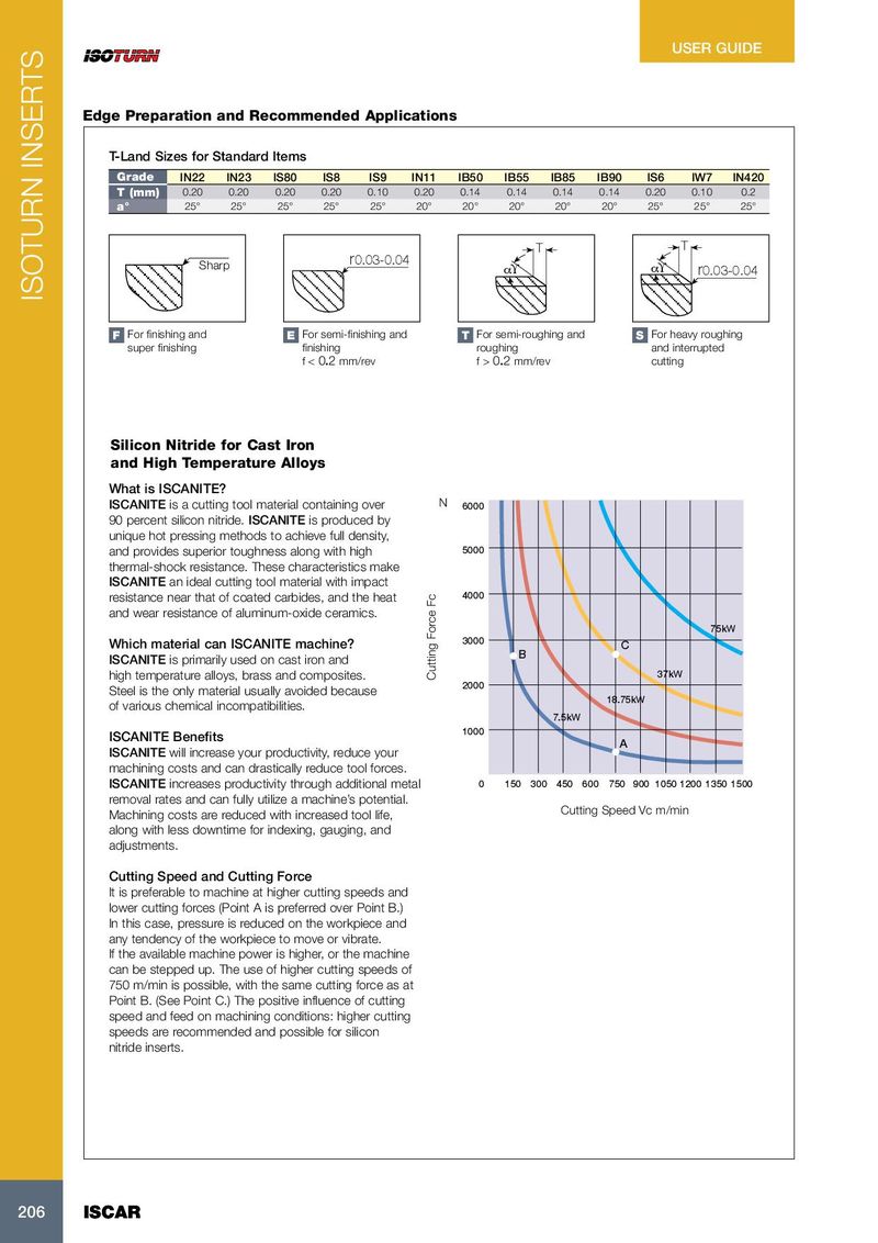 USER GUIDE Edge Preparation and Recommended Applications T-Land Sizes for Standard Items Grade IN22 IN23 IS80 IS8 IS9 IN11 IB50 IB55 IB85 IB90 IS6 IW7 IN420 T (mm) 0.20 0.20 0.20 0.20 0.10 0.20 0.14 0.14 0.14 0.14 0.20 0.10 0.2 a° 25° 25° 25° 25° 25° 20° 20° 20° 20° 20° 25° 25° 25° T T r0.03-0.04 Sharp αϒ αϒ r0.03-0.04 ISOTURN INSERTS F • For finishing and E • For semi-finishing and T • For semi-roughing and S • For heavy roughing super finishing finishing roughing and interrupted f < 0.2 mm/rev f > 0.2 mm/rev cutting Silicon Nitride for Cast Iron and High Temperature Alloys What is ISCANITE? ISCANITE is a cutting tool material containing over N 6000 90 percent silicon nitride. ISCANITE is produced by unique hot pressing methods to achieve full density, and provides superior toughness along with high 5000 thermal-shock resistance. These characteristics make ISCANITE an ideal cutting tool material with impact resistance near that of coated carbides, and the heat 4000 and wear resistance of aluminum-oxide ceramics. 75kW Which material can ISCANITE machine? 3000 C B ISCANITE is primarily used on cast iron and high temperature alloys, brass and composites. Cutting Force Fc 37kW 2000 Steel is the only material usually avoided because 18.75kW of various chemical incompatibilities. 7.5kW 1000 ISCANITE Benefits A ISCANITE will increase your productivity, reduce your machining costs and can drastically reduce tool forces. ISCANITE increases productivity through additional metal 0 150 300 450 600 750 900 1050 1200 1350 1500 removal rates and can fully utilize a machine’s potential. Cutting Speed Vc m/min Machining costs are reduced with increased tool life, along with less downtime for indexing, gauging, and adjustments. Cutting Speed and Cutting Force It is preferable to machine at higher cutting speeds and lower cutting forces (Point A is preferred over Point B.) In this case, pressure is reduced on the workpiece and any tendency of the workpiece to move or vibrate. If the available machine power is higher, or the machine can be stepped up. The use of higher cutting speeds of 750 m/min is possible, with the same cutting force as at Point B. (See Point C.) The positive influence of cutting speed and feed on machining conditions: higher cutting speeds are recommended and possible for silicon nitride inserts. 206 206 ISCAR ISCAR