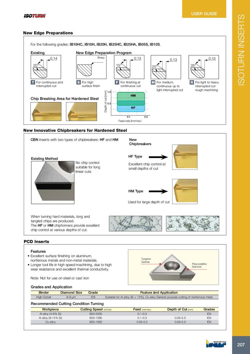 USER GUIDE New Edge Preparations For the following grades: IB10HC, IB10H, IB20H, IB25HC, IB25HA, IB05S, IB10S. Existing New Edge Preparation Program 0.14 Sharp 0.13 0.13 0.13 20° 15° 35° 25° T • For continuous and S • For high F • For finishing at M • For medium, R • For light to heavy ISOTURN INSERTS interrupted cut surface finish continuous cut continuous up to interrupted cut- light interrupted cut rough machining 1.0 HM Chip Breaking Area for Hardened Steel 0.5 HF Depth of cut [mm] 0.1 0.2 Feed rate [mm/rev] New Innovative Chipbreakers for Hardened Steel CBN inserts with two types of chipbreakers: HF and HM New Chipbreakers HF Type Existing Method No chip control Excellent chip control at suitable for long small depths of cut linear cuts HM Type Used for large depth of cut When turning hard materials, long and tangled chips are produced. The HF or HM chipformers provide excellent chip control at various depths of cut. PCD Inserts Features • Excellent surface finishing on aluminum, Tungsten nonferrous metals and non-metal materials. Carbide Polycrystalline • Longer tool life in high speed machining, due to high Diamond wear resistance and excellent thermal conductivity. Note: Not for use on steel or cast iron Grades and Application Binder Diamond Size Grade Feature and Application High Cobalt 8-9 µm ID5 Suitable for Al alloy (Si < 12%), Cu alloy General purpose cutting of nonferrous metal Recommended Cutting Condition Turning Workpiece Cutting Speed (m/min) Feed (mm/rev) Depth of Cut (mm) Grades Al alloy (4-9% Si) 800-2500 0.1-0.3 ID5 Al alloy (9-14% Si) 600-1280 0.1-0.3 0.05-3.0 ID5 Cu alloy 600-1000 0.05-0.2 0.05-3.0 ID5 207 207