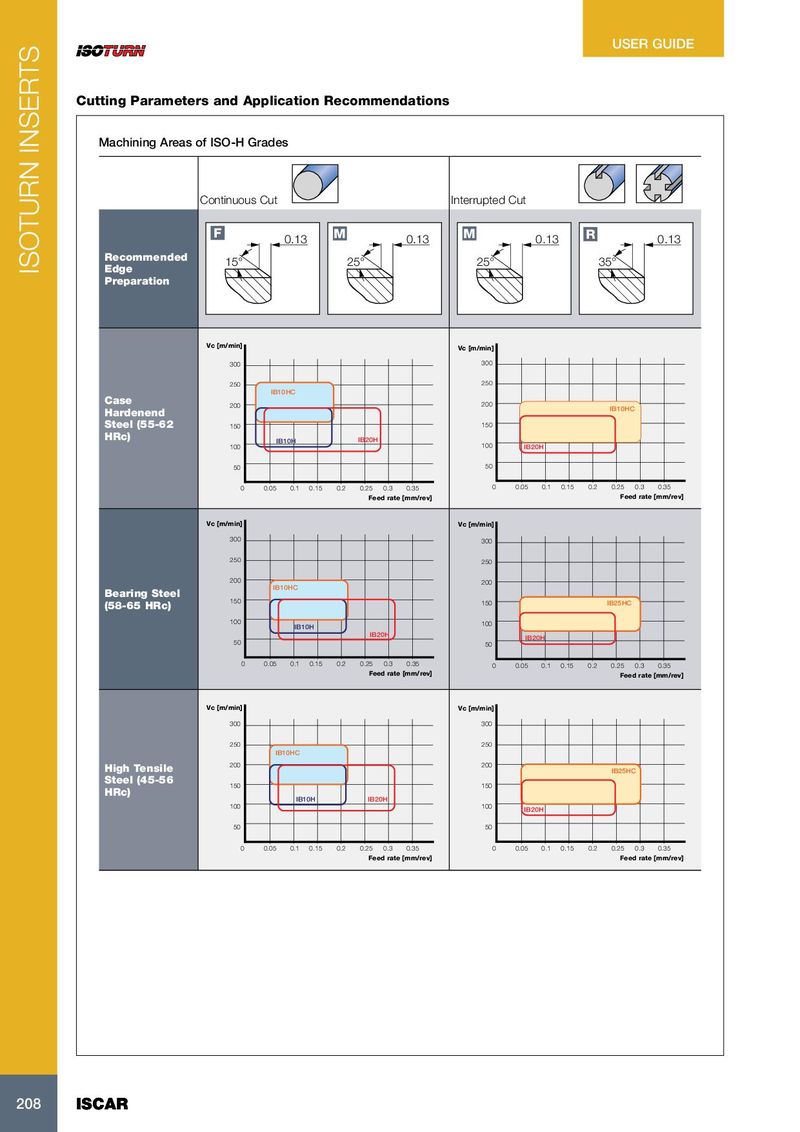 USER GUIDE Cutting Parameters and Application Recommendations Machining Areas of ISO-H Grades Continuous Cut Interrupted Cut F M M R 0.13 0.13 0.13 0.13 Recommended 15° 25° 25° 35° ISOTURN INSERTS Edge Preparation Vc [m/min] Vc [m/min] 300 300 250 250 IB10HC Case 200 200 IB10HC Hardenend Steel (55-62 150 150 HRc) IB10H IB20H 100 100 IB20H 50 50 0 0.05 0.1 0.15 0.2 0.25 0.3 0.35 0 0.05 0.1 0.15 0.2 0.25 0.3 0.35 Feed rate [mm/rev] Feed rate [mm/rev] Vc [m/min] Vc [m/min] 300 300 250 250 200 200 IB10HC Bearing Steel 150 (58-65 HRc) 150 IB25HC 100 IB10H 100 IB20H IB20H 50 50 0 0.05 0.1 0.15 0.2 0.25 0.3 0.35 0 0.05 0.1 0.15 0.2 0.25 0.3 0.35 Feed rate [mm/rev] Feed rate [mm/rev] Vc [m/min] Vc [m/min] 300 300 250 250 IB10HC High Tensile 200 200 IB25HC Steel (45-56 150 150 HRc) IB10H IB20H 100 100 IB20H 50 50 0 0.05 0.1 0.15 0.2 0.25 0.3 0.35 0 0.05 0.1 0.15 0.2 0.25 0.3 0.35 Feed rate [mm/rev] Feed rate [mm/rev] 208 208 ISCAR ISCAR