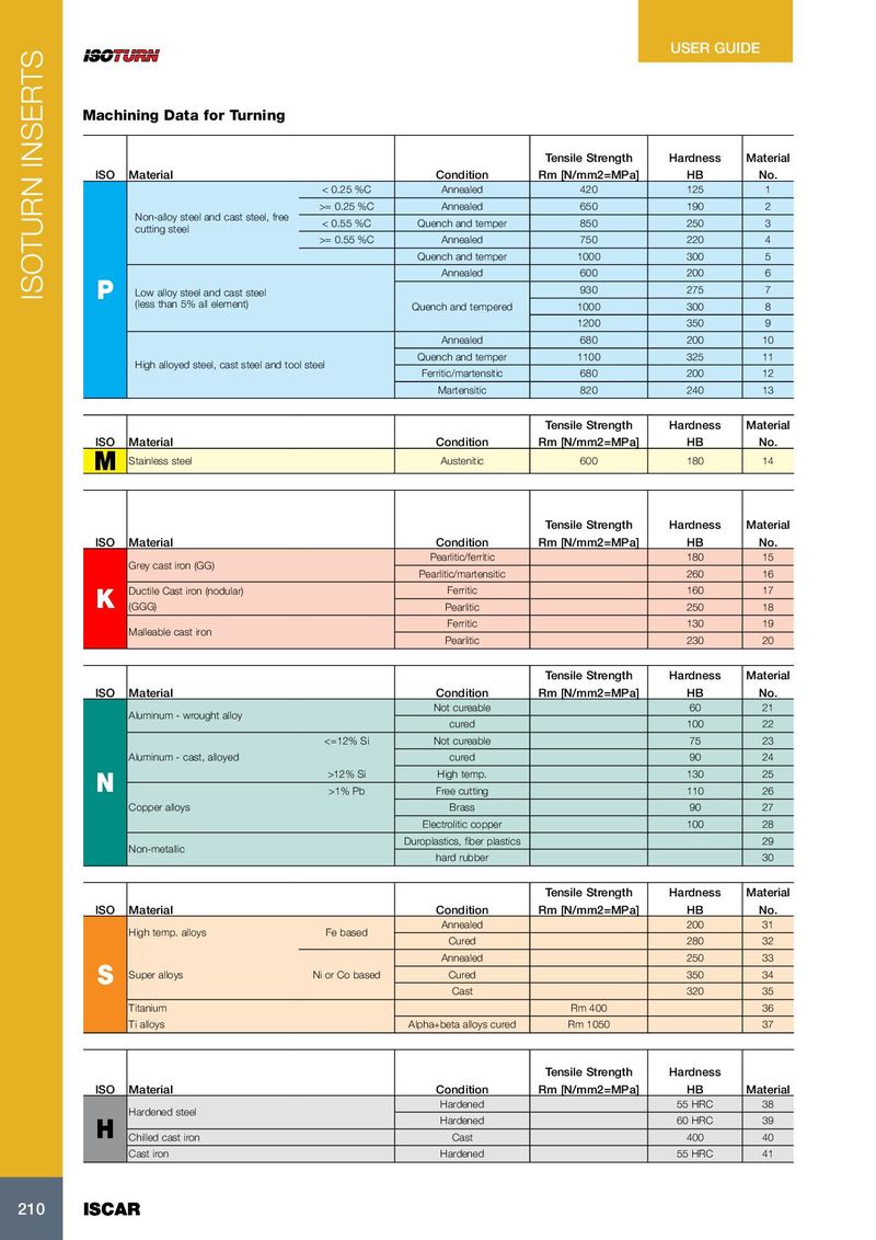 USER GUIDE Machining Data for Turning Carbide Tensile Strength Hardness Material Cermet Cermet+PVD +PVD Carbide+CVD ISO Material Condition Rm [N/mm2=MPa] HB No. IC20N IC30N IC520N IC530N IC3028/830 IC8250 IC8150 IC5005/428 < 0.25 %C Annealed 420 125 1 250-400 230-380 250-420 230-400 120-200 230-380 280-420 300-450 >= 0.25 %C Annealed 650 190 2 220-350 200-330 220-380 200-350 100-170 200-340 240-380 260-400 Non-alloy steel and cast steel, free < 0.55 %C Quench and temper 850 250 3 180-320 160-300 180-350 160-320 80-150 170-300 200-340 220-360 cutting steel >= 0.55 %C Annealed 750 220 4 210-340 190-320 210-370 190-340 90-160 190-320 220-360 240-380 Quench and temper 1000 300 5 160-300 140-280 160-330 140-300 80-130 160-280 180-320 200-340 Annealed 600 200 6 180-320 160-300 180-350 160-320 80-150 170-300 200-340 220-360 ISOTURN INSERTS P Low alloy steel and cast steel 930 275 7 170-300 150-280 170-330 150-300 70-130 160-280 200-320 220-340 (less than 5% all element) Quench and tempered 1000 300 8 160-250 140-230 160-280 140-250 60-120 140-250 190-300 210-320 1200 350 9 150-220 130-200 150-250 130-230 50-100 120-220 180-280 200-300 Annealed 680 200 10 180-300 160-280 180-330 160-300 80-130 170-280 200-320 220-340 Quench and temper 1100 325 11 150-220 130-200 150-250 130-230 50-100 120-220 180-280 200-300 High alloyed steel, cast steel and tool steel Ferritic/martensitic 680 200 12 210-340 190-320 210-370 190-340 90-160 190-320 220-360 240-380 Martensitic 820 240 13 180-320 160-300 180-350 160-320 80-150 170-300 240-380 260-400 Tensile Strength Hardness Material Cermet+PVD Carbide+PVD Carbide+CVD ISO Material Condition Rm [N/mm2=MPa] HB No. IC520N IC530N IC807/907 IC808/908 IC3028 IC6015 IC6025 Stainless steel Austenitic 600 180 14 150-280 140-250 100-200 90-200 50-120 140-250 120-180 M Ceramics Carbide+CVD Ceramics +CVD CBN Tensile Strength Hardness Material IC5005/ IC5010/ ISO Material Condition Rm [N/mm2=MPa] HB No. 428 4028 IC8150 IN11 IN23 IS6 IS8 IS80 IB90/85 IB50 Pearlitic/ferritic 180 15 160-300 160-300 140-280 150-400 500-900 80-300 200-400 Grey cast iron (GG) Pearlitic/martensitic 260 16 140-280 140-280 120-240 100-350 500-900 50-250 150-350 Ductile Cast iron (nodular) Ferritic 160 17 350-700 300-600 250-350 300-800 300-600 500-1200 300-1000 400-1000 500-12000 K (GGG) Pearlitic 250 18 300-600 250-500 200-300 200-600 200-500 500-1200 250-800 300-800 400-1000 Ferritic 130 19 200-350 250-400 180-320 350-500 Malleable cast iron Pearlitic 230 20 180-280 200-320 150-250 150-400 Tensile Strength Hardness Material Carbide PCD ISO Material Condition Rm [N/mm2=MPa] HB No. IC20 ID5 Not cureable 60 21 1000-2500 600-2500 Aluminum - wrought alloy cured 100 22 300-1000 600-2500 <=12% Si Not cureable 75 23 300-1000 600-2500 Aluminum - cast, alloyed cured 90 24 200-600 600-2500 >12% Si High temp. 130 25 N >1% Pb Free cutting 110 26 250-600 600-1000 Copper alloys Brass 90 27 180-400 600-800 Electrolitic copper 100 28 150-300 600-800 Duroplastics, fiber plastics 29 Non-metallic hard rubber 30 Tensile Strength Hardness Material Carbide Carbide+PVD Whiskers CBN ISO Material Condition Rm [N/mm2=MPa] HB No. IC07 IC20 IC804 IC806 IC907 IC3028 IW7 IB05S IB10S IB90 IB85 Annealed 200 31 40-55 35-45 50-80 30-40 High temp. alloys Fe based Cured 280 32 30-45 25-35 40-65 20-30 Annealed 250 33 30-40 25-30 65 - 105 50-80 45-60 20-25 150-450 Super alloys Ni or Co based Cured 350 34 20-30 15-25 50 - 90 40-70 35-45 10-20 100-250 100-250 100-200 120-240 S Cast 320 35 25-35 20-30 40 - 85 30-65 30-50 15-25 Titanium Rm 400 36 100-160 80-160 150-200 130-160 Ti alloys Alpha+beta alloys cured Rm 1050 37 50-60 50-60 50-100 30-60 Carbide Tensile Strength Hardness Ceramics CBN +PVD ISO Material Condition Rm [N/mm2=MPa] HB Material IN22 IN420 IN23 IS8 IB10HC IB10H IB50/55 IB20H IB25HC IB25HA IB85/90 IC907 Hardened 55 HRC 38 50-150 60 - 170 40-120 150-350 100-220 100-140 100-220 100-220 90-200 80-140 40-100 Hardened steel Hardened 60 HRC 39 50-120 60 - 140 40-100 150-350 100-220 80-120 100-220 100-220 90-200 60-120 30-60 H Chilled cast iron Cast 400 40 30-200 30 - 230 70-150 Cast iron Hardened 55 HRC 41 80-120 60-100 100-140 210 210 ISCAR ISCAR