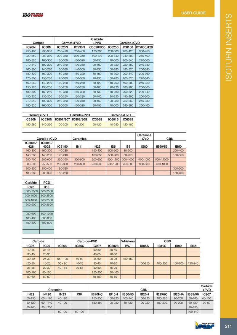USER GUIDE Carbide Tensile Strength Hardness Material Cermet Cermet+PVD +PVD Carbide+CVD ISO Material Condition Rm [N/mm2=MPa] HB No. IC20N IC30N IC520N IC530N IC3028/830 IC8250 IC8150 IC5005/428 < 0.25 %C Annealed 420 125 1 250-400 230-380 250-420 230-400 120-200 230-380 280-420 300-450 >= 0.25 %C Annealed 650 190 2 220-350 200-330 220-380 200-350 100-170 200-340 240-380 260-400 Non-alloy steel and cast steel, free < 0.55 %C Quench and temper 850 250 3 180-320 160-300 180-350 160-320 80-150 170-300 200-340 220-360 cutting steel >= 0.55 %C Annealed 750 220 4 210-340 190-320 210-370 190-340 90-160 190-320 220-360 240-380 Quench and temper 1000 300 5 160-300 140-280 160-330 140-300 80-130 160-280 180-320 200-340 Annealed 600 200 6 180-320 160-300 180-350 160-320 80-150 170-300 200-340 220-360 P Low alloy steel and cast steel 930 275 7 170-300 150-280 170-330 150-300 70-130 160-280 200-320 220-340 ISOTURN INSERTS (less than 5% all element) Quench and tempered 1000 300 8 160-250 140-230 160-280 140-250 60-120 140-250 190-300 210-320 1200 350 9 150-220 130-200 150-250 130-230 50-100 120-220 180-280 200-300 Annealed 680 200 10 180-300 160-280 180-330 160-300 80-130 170-280 200-320 220-340 Quench and temper 1100 325 11 150-220 130-200 150-250 130-230 50-100 120-220 180-280 200-300 High alloyed steel, cast steel and tool steel Ferritic/martensitic 680 200 12 210-340 190-320 210-370 190-340 90-160 190-320 220-360 240-380 Martensitic 820 240 13 180-320 160-300 180-350 160-320 80-150 170-300 240-380 260-400 Tensile Strength Hardness Material Cermet+PVD Carbide+PVD Carbide+CVD ISO Material Condition Rm [N/mm2=MPa] HB No. IC520N IC530N IC807/907 IC808/908 IC3028 IC6015 IC6025 Stainless steel Austenitic 600 180 14 150-280 140-250 100-200 90-200 50-120 140-250 120-180 M Ceramics Carbide+CVD Ceramics +CVD CBN Tensile Strength Hardness Material IC5005/ IC5010/ ISO Material Condition Rm [N/mm2=MPa] HB No. 428 4028 IC8150 IN11 IN23 IS6 IS8 IS80 IB90/85 IB50 Pearlitic/ferritic 180 15 160-300 160-300 140-280 150-400 500-900 80-300 200-400 Grey cast iron (GG) Pearlitic/martensitic 260 16 140-280 140-280 120-240 100-350 500-900 50-250 150-350 Ductile Cast iron (nodular) Ferritic 160 17 350-700 300-600 250-350 300-800 300-600 500-1200 300-1000 400-1000 500-12000 K (GGG) Pearlitic 250 18 300-600 250-500 200-300 200-600 200-500 500-1200 250-800 300-800 400-1000 Ferritic 130 19 200-350 250-400 180-320 350-500 Malleable cast iron Pearlitic 230 20 180-280 200-320 150-250 150-400 Tensile Strength Hardness Material Carbide PCD ISO Material Condition Rm [N/mm2=MPa] HB No. IC20 ID5 Not cureable 60 21 1000-2500 600-2500 Aluminum - wrought alloy cured 100 22 300-1000 600-2500 <=12% Si Not cureable 75 23 300-1000 600-2500 Aluminum - cast, alloyed cured 90 24 200-600 600-2500 >12% Si High temp. 130 25 N >1% Pb Free cutting 110 26 250-600 600-1000 Copper alloys Brass 90 27 180-400 600-800 Electrolitic copper 100 28 150-300 600-800 Duroplastics, fiber plastics 29 Non-metallic hard rubber 30 Tensile Strength Hardness Material Carbide Carbide+PVD Whiskers CBN ISO Material Condition Rm [N/mm2=MPa] HB No. IC07 IC20 IC804 IC806 IC907 IC3028 IW7 IB05S IB10S IB90 IB85 Annealed 200 31 40-55 35-45 50-80 30-40 High temp. alloys Fe based Cured 280 32 30-45 25-35 40-65 20-30 Annealed 250 33 30-40 25-30 65 - 105 50-80 45-60 20-25 150-450 Super alloys Ni or Co based Cured 350 34 20-30 15-25 50 - 90 40-70 35-45 10-20 100-250 100-250 100-200 120-240 S Cast 320 35 25-35 20-30 40 - 85 30-65 30-50 15-25 Titanium Rm 400 36 100-160 80-160 150-200 130-160 Ti alloys Alpha+beta alloys cured Rm 1050 37 50-60 50-60 50-100 30-60 Carbide Tensile Strength Hardness Ceramics CBN +PVD ISO Material Condition Rm [N/mm2=MPa] HB Material IN22 IN420 IN23 IS8 IB10HC IB10H IB50/55 IB20H IB25HC IB25HA IB85/90 IC907 Hardened 55 HRC 38 50-150 60 - 170 40-120 150-350 100-220 100-140 100-220 100-220 90-200 80-140 40-100 Hardened steel Hardened 60 HRC 39 50-120 60 - 140 40-100 150-350 100-220 80-120 100-220 100-220 90-200 60-120 30-60 H Chilled cast iron Cast 400 40 30-200 30 - 230 70-150 Cast iron Hardened 55 HRC 41 80-120 60-100 100-140 211 211