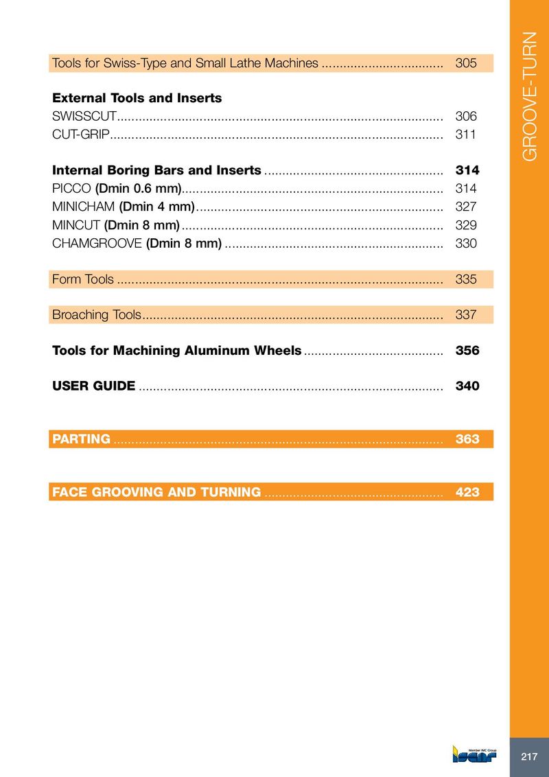 Tools for Swiss-Type and Small Lathe Machines .................................. 305 External Tools and Inserts SWISSCUT ........................................................................................... 306 CUT-GRIP ............................................................................................. 311 GROOVE-TURN Internal Boring Bars and Inserts .................................................. 314 PICCO (Dmin 0.6 mm)......................................................................... 314 MINICHAM (Dmin 4 mm) ..................................................................... 327 MINCUT (Dmin 8 mm) ......................................................................... 329 CHAMGROOVE (Dmin 8 mm) ............................................................. 330 Form Tools ........................................................................................... 335 Broaching Tools .................................................................................... 337 Tools for Machining Aluminum Wheels ....................................... 356 USER GUIDE ..................................................................................... 340 PARTING ............................................................................................ 363 FACE GROOVING AND TURNING .................................................. 423 217