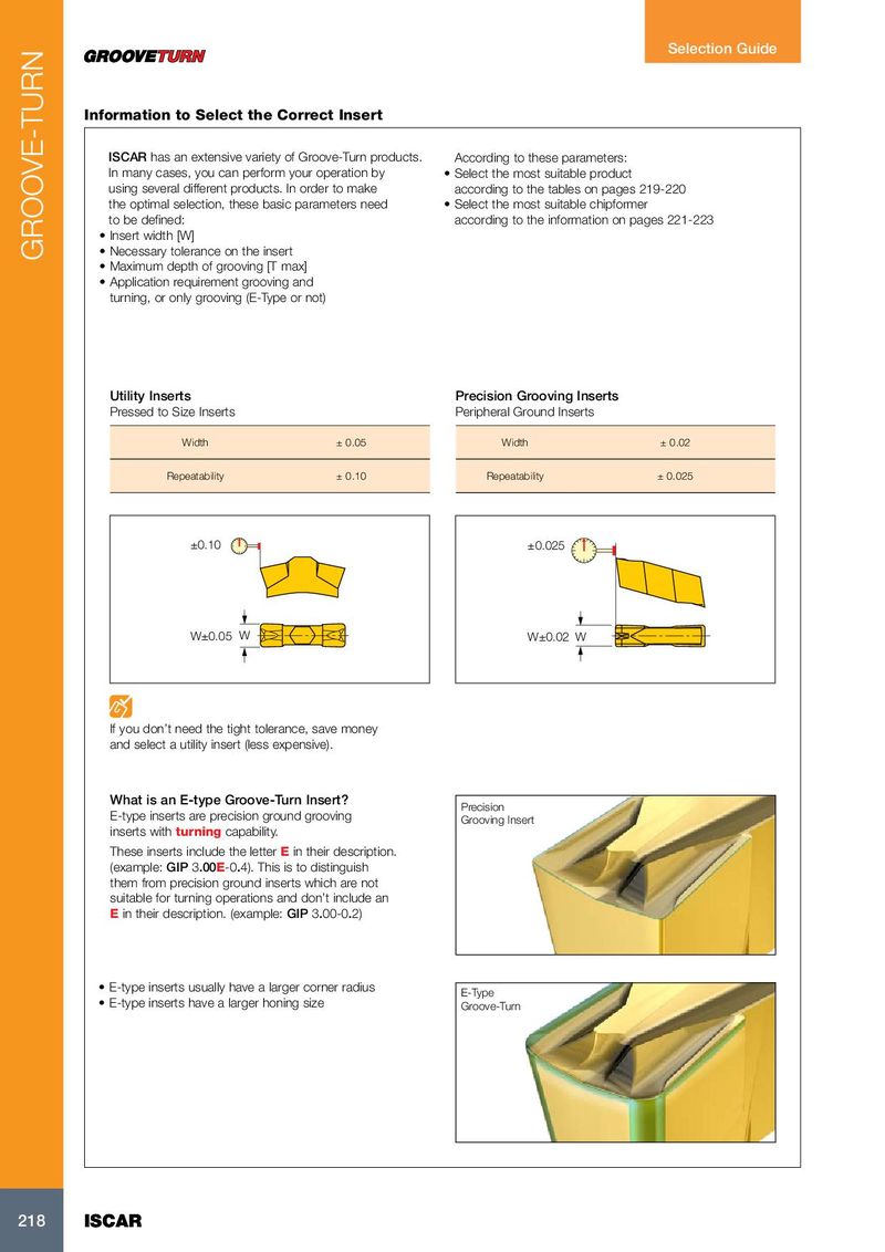 Selection Guide Information to Select the Correct Insert ISCAR has an extensive variety of Groove-Turn products. According to these parameters: In many cases, you can perform your operation by • Select the most suitable product using several different products. In order to make according to the tables on pages 219-220 the optimal selection, these basic parameters need • Select the most suitable chipformer to be defined: according to the information on pages 221-223 • Insert width [W] • Necessary tolerance on the insert GROOVE-TURN • Maximum depth of grooving [T max] • Application requirement grooving and turning, or only grooving (E-Type or not) Utility Inserts Precision Grooving Inserts Pressed to Size Inserts Peripheral Ground Inserts Width ± 0.05 Width ± 0.02 Repeatability ± 0.10 Repeatability ± 0.025 ±0.10 ±0.025 W±0.05 W W±0.02 W If you don’t need the tight tolerance, save money and select a utility insert (less expensive). What is an E-type Groove-Turn Insert? Precision E-type inserts are precision ground grooving Grooving Insert inserts with turning capability. These inserts include the letter E in their description. (example: GIP 3.00E-0.4). This is to distinguish them from precision ground inserts which are not suitable for turning operations and don’t include an E in their description. (example: GIP 3.00-0.2) • E-type inserts usually have a larger corner radius E-Type • E-type inserts have a larger honing size Groove-Turn 218 218 ISCAR ISCAR
