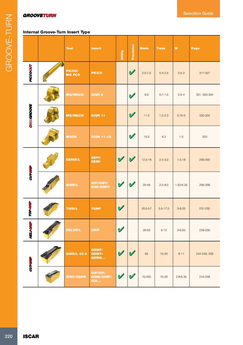 Selection Guide Internal Groove-Turn Insert Type Tool Insert Dmin Tmax W Page Utility Precision GROOVE-TURN PICCO/ PICCO 2.0-7.0 0.4-2.5 0.5-2 317-327 MG PCO MG/MGCH GIQR 8 8.0 0.7-1.5 0.5-4 331, 333-334 MG/MGCH GIQR 11 11.0 1.5-2.3 0.75-5 332-334 MGCH GIQR 11-15 15.0 6.3 1-3 333 GEPI/ GEHIR/L 12.5-16 2.4-3.0 1-3.18 290-293 GEMI GIFI/GIPI/ GHIR/L 20-49 2.5-8.0 1.53-6.35 295-299 GINI/GIMIY TGIR/L TGMF 20.5-57 5.5-17.5 3-6.35 231-232 HELIIR/L GRIP 26-53 5-12 3-6.35 229-230 GDMF/ GHIR/L 40-8 GDMY/ 65 15-20 8-11 244-249, 256 GDMN... GIP/GIF/ GHIC/CGHN GIMN/GIMF/ 70-250 10-26 2.8-6.35 244-258 GIA... 220 220 ISCAR ISCAR