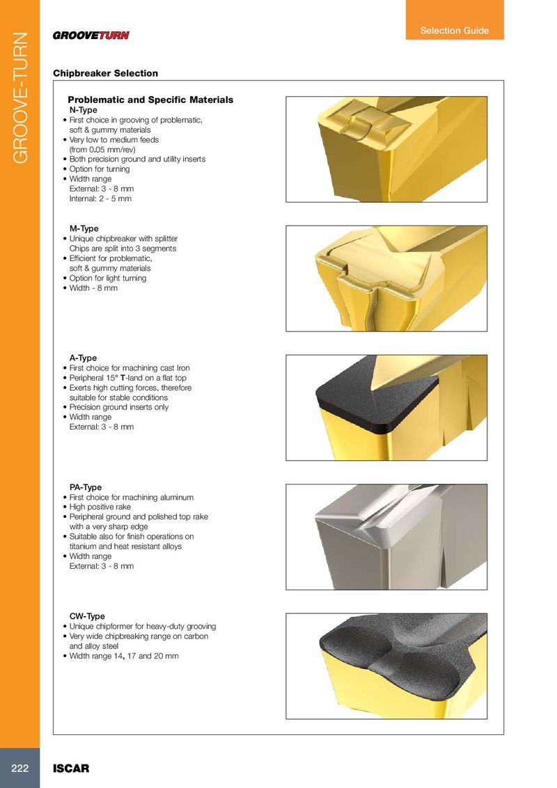 Selection Guide Chipbreaker Selection Problematic and Specific Materials N-Type • First choice in grooving of problematic, soft & gummy materials • Very low to medium feeds (from 0.05 mm/rev) GROOVE-TURN • Both precision ground and utility inserts • Option for turning • Width range External: 3 - 8 mm Internal: 2 - 5 mm M-Type • Unique chipbreaker with splitter Chips are split into 3 segments • Efficient for problematic, soft & gummy materials • Option for light turning • Width - 8 mm A-Type • First choice for machining cast Iron • Peripheral 15° T-land on a flat top • Exerts high cutting forces, therefore suitable for stable conditions • Precision ground inserts only • Width range External: 3 - 8 mm PA-Type • First choice for machining aluminum • High positive rake • Peripheral ground and polished top rake with a very sharp edge • Suitable also for finish operations on titanium and heat resistant alloys • Width range External: 3 - 8 mm CW-Type • Unique chipformer for heavy-duty grooving • Very wide chipbreaking range on carbon and alloy steel • Width range 14, 17 and 20 mm 222 222 ISCAR ISCAR
