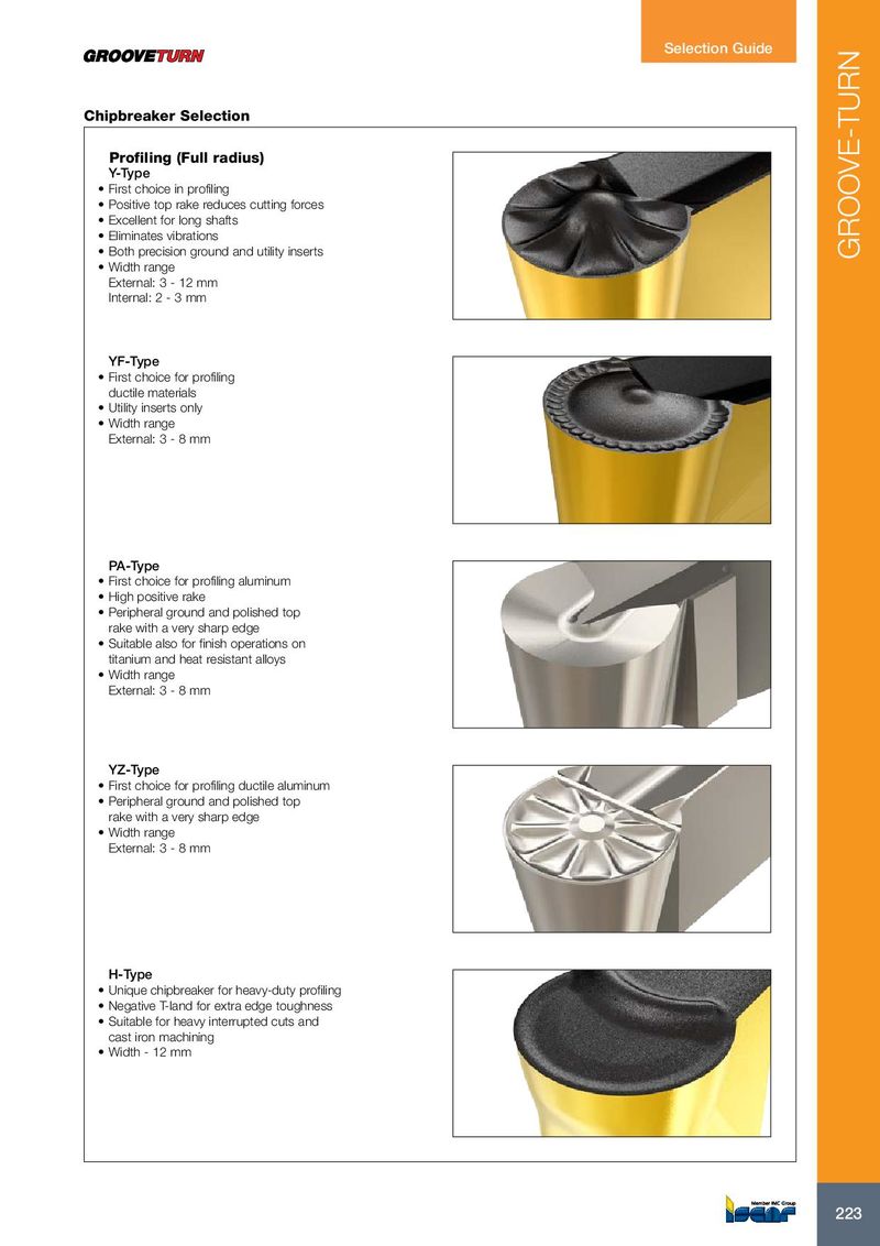 Selection Guide Chipbreaker Selection Profiling (Full radius) Y-Type • First choice in profiling • Positive top rake reduces cutting forces • Excellent for long shafts • Eliminates vibrations • Both precision ground and utility inserts GROOVE-TURN • Width range External: 3 - 12 mm Internal: 2 - 3 mm YF-Type • First choice for profiling ductile materials • Utility inserts only • Width range External: 3 - 8 mm PA-Type • First choice for profiling aluminum • High positive rake • Peripheral ground and polished top rake with a very sharp edge • Suitable also for finish operations on titanium and heat resistant alloys • Width range External: 3 - 8 mm YZ-Type • First choice for profiling ductile aluminum • Peripheral ground and polished top rake with a very sharp edge • Width range External: 3 - 8 mm H-Type • Unique chipbreaker for heavy-duty profiling • Negative T-land for extra edge toughness • Suitable for heavy interrupted cuts and cast iron machining • Width - 12 mm 223 223