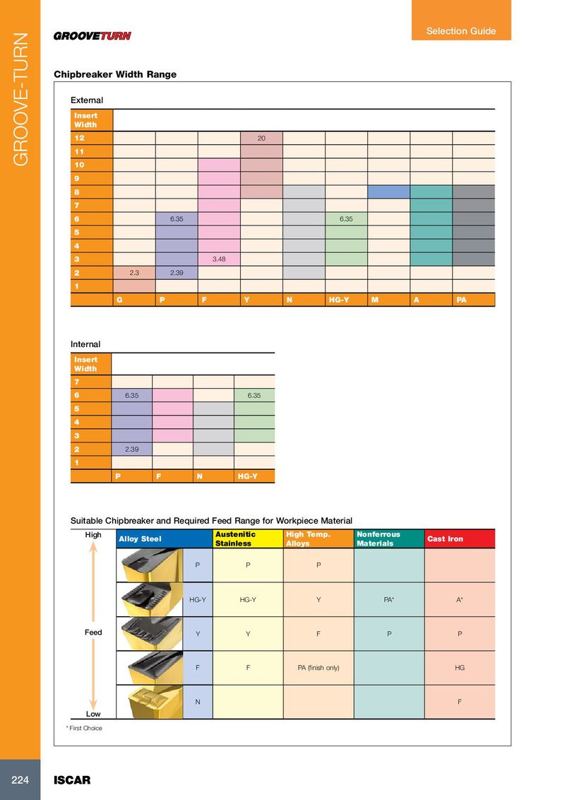 Selection Guide Chipbreaker Width Range External Insert Width 12 20 11 GROOVE-TURN 10 9 8 7 6 6.35 6.35 5 4 3 3.48 2 2.3 2.39 1 G P F Y N HG-Y M A PA Internal Insert Width 7 6 6.35 6.35 5 4 3 2 2.39 1 P F N HG-Y Suitable Chipbreaker and Required Feed Range for Workpiece Material High Austenitic High Temp. Nonferrous Alloy Steel Cast Iron Stainless Alloys Materials P P P HG-Y HG-Y Y PA* A* Feed Y Y F P P F F PA (finish only) HG N F Low * First Choice 224 224 ISCAR ISCAR