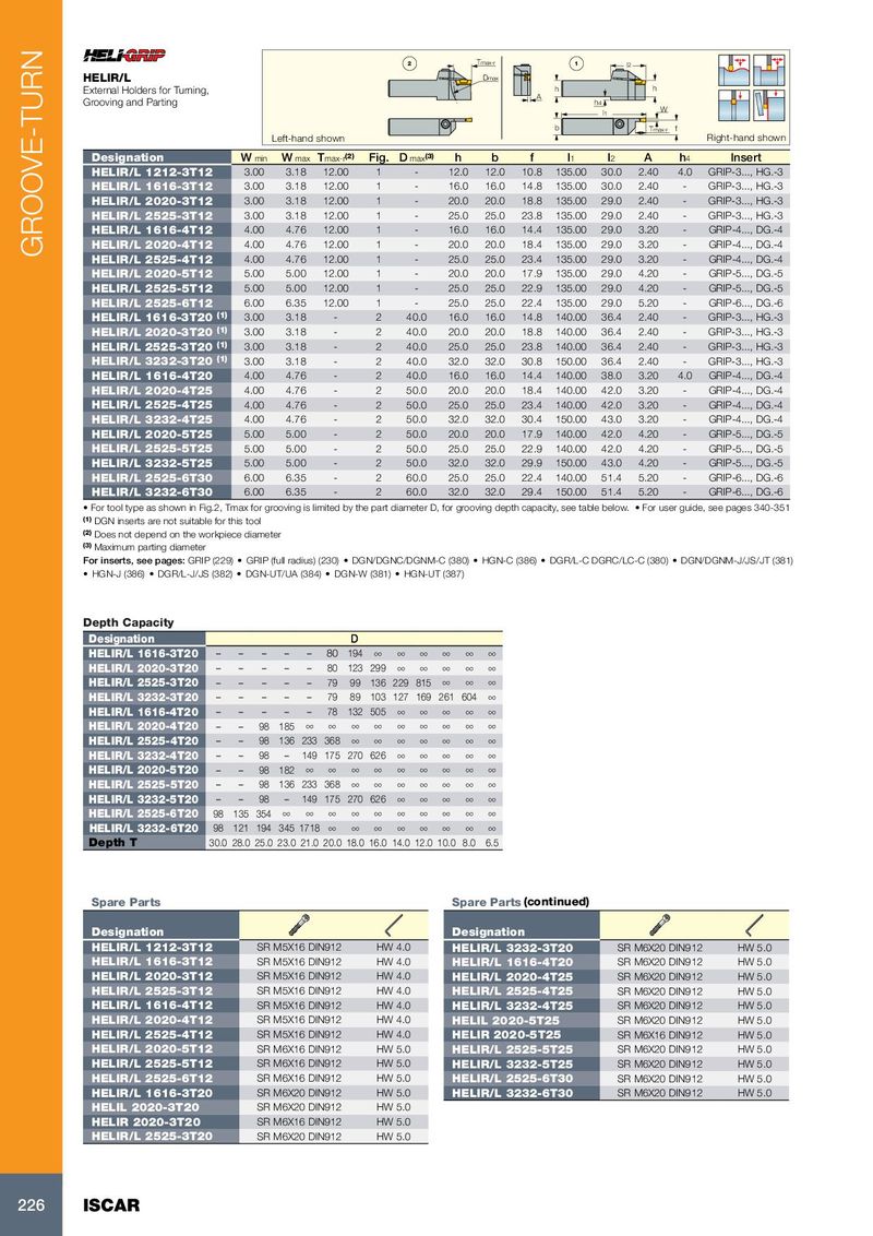 2 Tmax-r 1 l 2 HELIR/L Dmax External Holders for Turning, h h A Grooving and Parting h 4 l 1 W b Tmax-r f Left-hand shown Right-hand shown Designation W min W max T max-r (2) Fig. D max (3) h b f l 1 l 2 A h 4 Insert HELIR/L 1212-3T12 3.00 3.18 12.00 1 - 12.0 12.0 10.8 135.00 30.0 2.40 4.0 GRIP-3..., HG.-3 HELIR/L 1616-3T12 3.00 3.18 12.00 1 - 16.0 16.0 14.8 135.00 30.0 2.40 - GRIP-3..., HG.-3 HELIR/L 2020-3T12 3.00 3.18 12.00 1 - 20.0 20.0 18.8 135.00 29.0 2.40 - GRIP-3..., HG.-3 HELIR/L 2525-3T12 3.00 3.18 12.00 1 - 25.0 25.0 23.8 135.00 29.0 2.40 - GRIP-3..., HG.-3 HELIR/L 1616-4T12 4.00 4.76 12.00 1 - 16.0 16.0 14.4 135.00 29.0 3.20 - GRIP-4..., DG.-4 HELIR/L 2020-4T12 4.00 4.76 12.00 1 - 20.0 20.0 18.4 135.00 29.0 3.20 - GRIP-4..., DG.-4 GROOVE-TURN HELIR/L 2525-4T12 4.00 4.76 12.00 1 - 25.0 25.0 23.4 135.00 29.0 3.20 - GRIP-4..., DG.-4 HELIR/L 2020-5T12 5.00 5.00 12.00 1 - 20.0 20.0 17.9 135.00 29.0 4.20 - GRIP-5..., DG.-5 HELIR/L 2525-5T12 5.00 5.00 12.00 1 - 25.0 25.0 22.9 135.00 29.0 4.20 - GRIP-5..., DG.-5 HELIR/L 2525-6T12 6.00 6.35 12.00 1 - 25.0 25.0 22.4 135.00 29.0 5.20 - GRIP-6..., DG.-6 HELIR/L 1616-3T20 (1) 3.00 3.18 - 2 40.0 16.0 16.0 14.8 140.00 36.4 2.40 - GRIP-3..., HG.-3 HELIR/L 2020-3T20 (1) 3.00 3.18 - 2 40.0 20.0 20.0 18.8 140.00 36.4 2.40 - GRIP-3..., HG.-3 HELIR/L 2525-3T20 (1) 3.00 3.18 - 2 40.0 25.0 25.0 23.8 140.00 36.4 2.40 - GRIP-3..., HG.-3 HELIR/L 3232-3T20 (1) 3.00 3.18 - 2 40.0 32.0 32.0 30.8 150.00 36.4 2.40 - GRIP-3..., HG.-3 HELIR/L 1616-4T20 4.00 4.76 - 2 40.0 16.0 16.0 14.4 140.00 38.0 3.20 4.0 GRIP-4..., DG.-4 HELIR/L 2020-4T25 4.00 4.76 - 2 50.0 20.0 20.0 18.4 140.00 42.0 3.20 - GRIP-4..., DG.-4 HELIR/L 2525-4T25 4.00 4.76 - 2 50.0 25.0 25.0 23.4 140.00 42.0 3.20 - GRIP-4..., DG.-4 HELIR/L 3232-4T25 4.00 4.76 - 2 50.0 32.0 32.0 30.4 150.00 43.0 3.20 - GRIP-4..., DG.-4 HELIR/L 2020-5T25 5.00 5.00 - 2 50.0 20.0 20.0 17.9 140.00 42.0 4.20 - GRIP-5..., DG.-5 HELIR/L 2525-5T25 5.00 5.00 - 2 50.0 25.0 25.0 22.9 140.00 42.0 4.20 - GRIP-5..., DG.-5 HELIR/L 3232-5T25 5.00 5.00 - 2 50.0 32.0 32.0 29.9 150.00 43.0 4.20 - GRIP-5..., DG.-5 HELIR/L 2525-6T30 6.00 6.35 - 2 60.0 25.0 25.0 22.4 140.00 51.4 5.20 - GRIP-6..., DG.-6 HELIR/L 3232-6T30 6.00 6.35 - 2 60.0 32.0 32.0 29.4 150.00 51.4 5.20 - GRIP-6..., DG.-6 • For tool type as shown in Fig.2, Tmax for grooving is limited by the part diameter D, for grooving depth capacity, see table below. • For user guide, see pages 340-351 (1) DGN inserts are not suitable for this tool (2) Does not depend on the workpiece diameter (3) Maximum parting diameter For inserts, see pages: GRIP (229) • GRIP (full radius) (230) • DGN/DGNC/DGNM-C (380) • HGN-C (386) • DGR/L-C DGRC/LC-C (380) • DGN/DGNM-J/JS/JT (381) • HGN-J (386) • DGR/L-J/JS (382) • DGN-UT/UA (384) • DGN-W (381) • HGN-UT (387) Depth Capacity Designation D HELIR/L 1616-3T20 – – – – – 80 194 ∞ ∞ ∞ ∞ ∞ ∞ HELIR/L 2020-3T20 – – – – – 80 123 299 ∞ ∞ ∞ ∞ ∞ HELIR/L 2525-3T20 – – – – – 79 99 136 229 815 ∞ ∞ ∞ HELIR/L 3232-3T20 – – – – – 79 89 103 127 169 261 604 ∞ HELIR/L 1616-4T20 – – – – – 78 132 505 ∞ ∞ ∞ ∞ ∞ HELIR/L 2020-4T20 – – 98 185 ∞ ∞ ∞ ∞ ∞ ∞ ∞ ∞ ∞ HELIR/L 2525-4T20 – – 98 136 233 368 ∞ ∞ ∞ ∞ ∞ ∞ ∞ HELIR/L 3232-4T20 – – 98 – 149 175 270 626 ∞ ∞ ∞ ∞ ∞ HELIR/L 2020-5T20 – – 98 182 ∞ ∞ ∞ ∞ ∞ ∞ ∞ ∞ ∞ HELIR/L 2525-5T20 – – 98 136 233 368 ∞ ∞ ∞ ∞ ∞ ∞ ∞ HELIR/L 3232-5T20 – – 98 – 149 175 270 626 ∞ ∞ ∞ ∞ ∞ HELIR/L 2525-6T20 98 135 354 ∞ ∞ ∞ ∞ ∞ ∞ ∞ ∞ ∞ ∞ HELIR/L 3232-6T20 98 121 194 345 1718 ∞ ∞ ∞ ∞ ∞ ∞ ∞ ∞ Depth T 30.0 28.0 25.0 23.0 21.0 20.0 18.0 16.0 14.0 12.0 10.0 8.0 6.5 Spare Parts Spare Parts (continued) Designation Designation HELIR/L 1212-3T12 SR M5X16 DIN912 HW 4.0 HELIR/L 3232-3T20 SR M6X20 DIN912 HW 5.0 HELIR/L 1616-3T12 SR M5X16 DIN912 HW 4.0 HELIR/L 1616-4T20 SR M6X20 DIN912 HW 5.0 HELIR/L 2020-3T12 SR M5X16 DIN912 HW 4.0 HELIR/L 2020-4T25 SR M6X20 DIN912 HW 5.0 HELIR/L 2525-3T12 SR M5X16 DIN912 HW 4.0 HELIR/L 2525-4T25 SR M6X20 DIN912 HW 5.0 HELIR/L 1616-4T12 SR M5X16 DIN912 HW 4.0 HELIR/L 3232-4T25 SR M6X20 DIN912 HW 5.0 HELIR/L 2020-4T12 SR M5X16 DIN912 HW 4.0 HELIL 2020-5T25 SR M6X20 DIN912 HW 5.0 HELIR/L 2525-4T12 SR M5X16 DIN912 HW 4.0 HELIR 2020-5T25 SR M6X16 DIN912 HW 5.0 HELIR/L 2020-5T12 SR M6X16 DIN912 HW 5.0 HELIR/L 2525-5T25 SR M6X20 DIN912 HW 5.0 HELIR/L 2525-5T12 SR M6X16 DIN912 HW 5.0 HELIR/L 3232-5T25 SR M6X20 DIN912 HW 5.0 HELIR/L 2525-6T12 SR M6X16 DIN912 HW 5.0 HELIR/L 2525-6T30 SR M6X20 DIN912 HW 5.0 HELIR/L 1616-3T20 SR M6X20 DIN912 HW 5.0 HELIR/L 3232-6T30 SR M6X20 DIN912 HW 5.0 HELIL 2020-3T20 SR M6X20 DIN912 HW 5.0 HELIR 2020-3T20 SR M6X16 DIN912 HW 5.0 HELIR/L 2525-3T20 SR M6X20 DIN912 HW 5.0 226 ISCAR