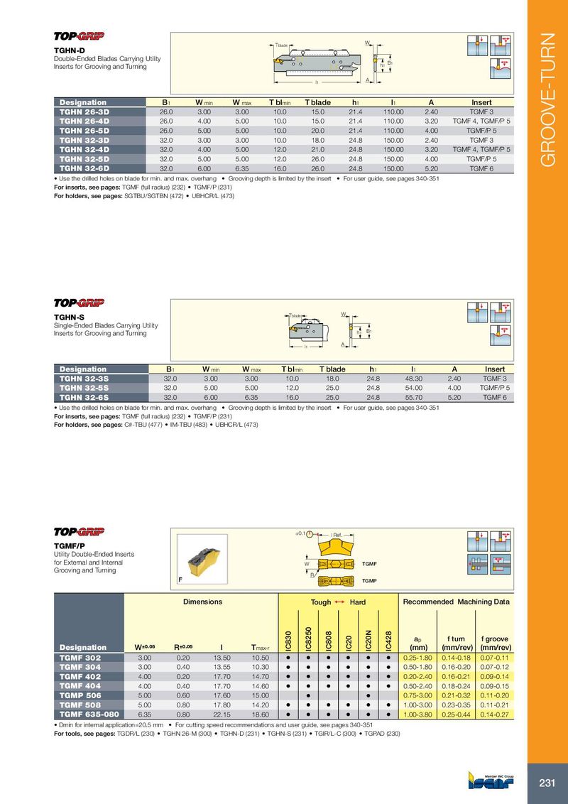 Tblade W TGHN-D Double-Ended Blades Carrying Utility Inserts for Grooving and Turning h1 B1 l1 A Designation B 1 W min W max T bl min T blade h 1 l 1 A Insert TGHN 26-3D 26.0 3.00 3.00 10.0 15.0 21.4 110.00 2.40 TGMF 3 TGHN 26-4D 26.0 4.00 5.00 10.0 15.0 21.4 110.00 3.20 TGMF 4, TGMF/P 5 TGHN 26-5D 26.0 5.00 5.00 10.0 20.0 21.4 110.00 4.00 TGMF/P 5 TGHN 32-3D 32.0 3.00 3.00 10.0 18.0 24.8 150.00 2.40 TGMF 3 TGHN 32-4D 32.0 4.00 5.00 12.0 21.0 24.8 150.00 3.20 TGMF 4, TGMF/P 5 TGHN 32-5D 32.0 5.00 5.00 12.0 26.0 24.8 150.00 4.00 TGMF/P 5 GROOVE-TURN TGHN 32-6D 32.0 6.00 6.35 16.0 26.0 24.8 150.00 5.20 TGMF 6 • Use the drilled holes on blade for min. and max. overhang • Grooving depth is limited by the insert • For user guide, see pages 340-351 For inserts, see pages: TGMF (full radius) (232) • TGMF/P (231) For holders, see pages: SGTBU/SGTBN (472) • UBHCR/L (473) TGHN-S Tblade W Single-Ended Blades Carrying Utility Inserts for Grooving and Turning h1 B1 l1 A Designation B 1 W min W max T bl min T blade h 1 l 1 A Insert TGHN 32-3S 32.0 3.00 3.00 10.0 18.0 24.8 48.30 2.40 TGMF 3 TGHN 32-5S 32.0 5.00 5.00 12.0 25.0 24.8 54.00 4.00 TGMF/P 5 TGHN 32-6S 32.0 6.00 6.35 16.0 25.0 24.8 55.70 5.20 TGMF 6 • Use the drilled holes on blade for min. and max. overhang • Grooving depth is limited by the insert • For user guide, see pages 340-351 For inserts, see pages: TGMF (full radius) (232) • TGMF/P (231) For holders, see pages: C#-TBU (477) • IM-TBU (483) • UBHCR/L (473) ±0.1 l Ref. TGMF/P Utility Double-Ended Inserts for External and Internal W TGMF Grooving and Turning R TGMP Dimensions Tough 1 Hard Recommended Machining Data a p f turn f groove Designation W ±0.05 R ±0.05 l T max-r IC830 IC8250 IC808 IC20 IC20N IC428 (mm) (mm/rev) (mm/rev) TGMF 302 3.00 0.20 13.50 10.50 • • • • • • 0.25-1.80 0.14-0.18 0.07-0.11 TGMF 304 3.00 0.40 13.55 10.30 • • • • • • 0.50-1.80 0.16-0.20 0.07-0.12 TGMF 402 4.00 0.20 17.70 14.70 • • • • • • 0.20-2.40 0.16-0.21 0.09-0.14 TGMF 404 4.00 0.40 17.70 14.60 • • • • • • 0.50-2.40 0.18-0.24 0.09-0.15 TGMP 506 5.00 0.60 17.60 15.00 • • 0.75-3.00 0.21-0.32 0.11-0.20 TGMF 508 5.00 0.80 17.80 14.20 • • • • • • 1.00-3.00 0.23-0.35 0.11-0.21 TGMF 635-080 6.35 0.80 22.15 18.60 • • • • • • 1.00-3.80 0.25-0.44 0.14-0.27 • Dmin for internal application=20.5 mm • For cutting speed recommendations and user guide, see pages 340-351 For tools, see pages: TGDR/L (230) • TGHN 26-M (300) • TGHN-D (231) • TGHN-S (231) • TGIR/L-C (300) • TGPAD (230) 231