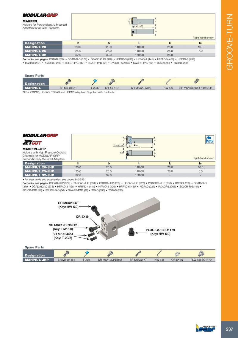 MAHPR/L h h Holders for Perpendicularly Mounted l2 h4 Adapters for all GRIP Systems l1 b Right-hand shown Designation h b l 1 l 2 h 4 MAHPR/L 20 20.0 20.0 140.00 25.0 10.0 MAHPR/L 25 25.0 25.0 140.00 25.0 5.0 MAHPR/L 32 32.0 32.0 150.00 25.0 - For tools, see pages: CGPAD (238) • DGAD-B-D (379) • DGAD/HGAD (378) • HFPAD-3 (438) • HFPAD-4 (441) • HFPAD-5 (439) • HFPAD-6 (439) • HGPAD (227) • PCADR/L (268) • SCLCR-PAD (47) • SDJCR-PAD (51) • SVJCR-PAD (56) • SWAPR-PAD (62) • TGAD (393) • TGPAD (230) GROOVE-TURN Spare Parts Designation MAHPR/L SR M5-04451 T-20/5 SR 14-519 SR M6X20-XT(a) HW 5.0 SR M6X6DIN551 14H/22H (a) For CGPAD, HGPAD, TGPAD and HFPAD adapters. Supplied with the tools. h h Bar Max G 1/8"-28 l2 h4 l1 MAHPR/L-JHP Holders with High Pressure Coolant 4.5 b Channels for MODULAR-GRIP Right-hand shown Perpendicularly Mounted Adapters Designation h b l 1 l 2 h 4 MAHPR/L 20-JHP 20.0 20.0 140.00 28.0 10.0 MAHPR/L 25-JHP 25.0 25.0 140.00 28.0 5.0 MAHPR/L 32-JHP 32.0 32.0 150.00 - - • For user guide and accessories, see pages 340-355 For tools, see pages: DGPAD-JHP (379) • TAGPAD-JHP (394) • CGPAD-JHP (238) • HGPAD-JHP (227) • PCADR/L-JHP (268) • CGPAD (238) • DGAD-B-D (379) • DGAD/HGAD (378) • HFPAD-3 (438) • HFPAD-4 (441) • HFPAD-5 (439) • HFPAD-6 (439) • HGPAD (227) • PCADR/L (268) • SCLCR-PAD (47) • SDJCR-PAD (51) • SVJCR-PAD (56) • SWAPR-PAD (62) • TGAD (393) • TGPAD (230) SR M6X20-XT (Key: HW 5.0) OR 5X1N SR M6X12DIN6912 (Key: HW 5.0) PLUG G1/8ISO1179 SR M5X04451 (Key: HW 5.0) (Key: T-20/5) Spare Parts Designation MAHPR/L-JHP SR M5-04451 T-20/5 SR M6X12DIN6912 SR M6X20-XT HW 5.0 OR 5X1N PLG 1/8ISO1179 237