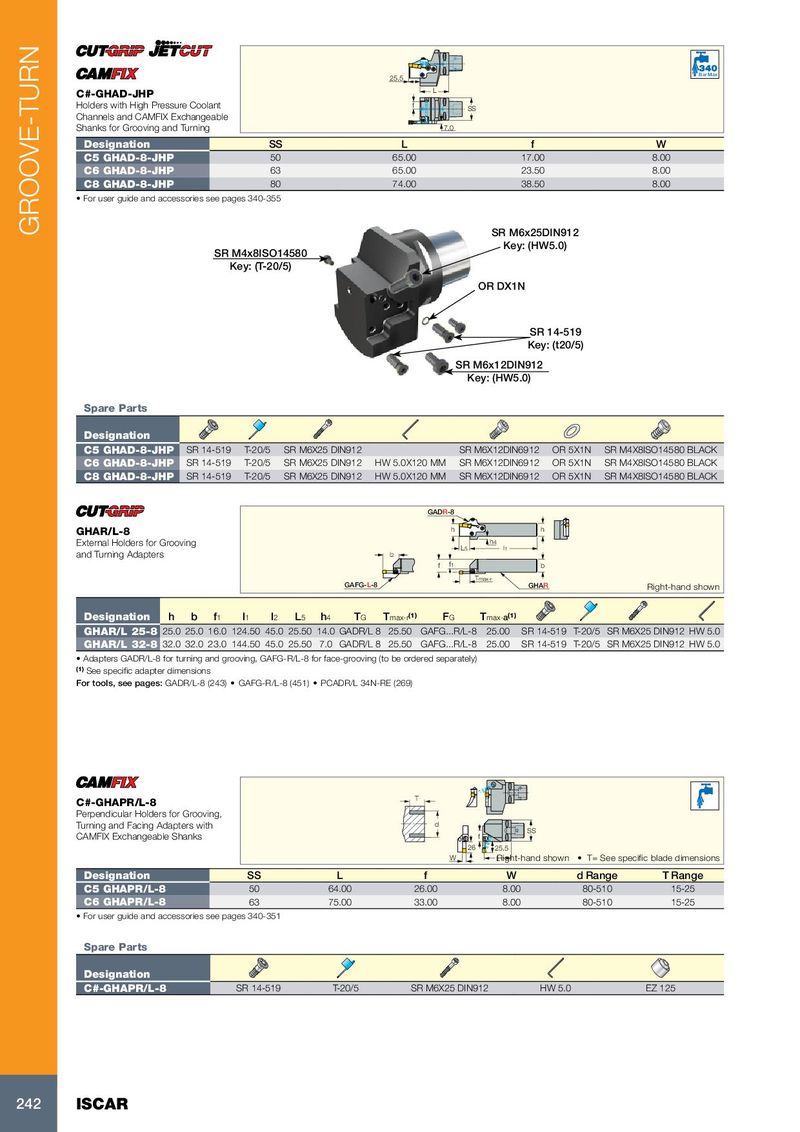 Bar Max 25.5 L C#-GHAD-JHP Holders with High Pressure Coolant f SS Channels and CAMFIX Exchangeable Shanks for Grooving and Turning 7.0 Designation SS L f W C5 GHAD-8-JHP 50 65.00 17.00 8.00 C6 GHAD-8-JHP 63 65.00 23.50 8.00 C8 GHAD-8-JHP 80 74.00 38.50 8.00 • For user guide and accessories see pages 340-355 GROOVE-TURN SR M6x25DIN912 Key: (HW5.0) SR M4x8ISO14580 Key: (T-20/5) OR DX1N SR 14-519 Key: (t20/5) SR M6x12DIN912 Key: (HW5.0) Spare Parts Designation C5 GHAD-8-JHP SR 14-519 T-20/5 SR M6X25 DIN912 SR M6X12DIN6912 OR 5X1N SR M4X8ISO14580 BLACK C6 GHAD-8-JHP SR 14-519 T-20/5 SR M6X25 DIN912 HW 5.0X120 MM SR M6X12DIN6912 OR 5X1N SR M4X8ISO14580 BLACK C8 GHAD-8-JHP SR 14-519 T-20/5 SR M6X25 DIN912 HW 5.0X120 MM SR M6X12DIN6912 OR 5X1N SR M4X8ISO14580 BLACK GADR-8 GHAR/L-8 h h External Holders for Grooving h4 L5 l1 and Turning Adapters l2 f f1 b Tmax-r GAFG-L-8 GHAR Right-hand shown Designation h b f 1 l 1 l 2 L 5 h 4 T G T max-r (1) F G T max- a (1) GHAR/L 25-8 25.0 25.0 16.0 124.50 45.0 25.50 14.0 GADR/L 8 25.50 GAFG...R/L-8 25.00 SR 14-519 T-20/5 SR M6X25 DIN912 HW 5.0 GHAR/L 32-8 32.0 32.0 23.0 144.50 45.0 25.50 7.0 GADR/L 8 25.50 GAFG...R/L-8 25.00 SR 14-519 T-20/5 SR M6X25 DIN912 HW 5.0 • Adapters GADR/L-8 for turning and grooving, GAFG-R/L-8 for face-grooving (to be ordered separately) (1) See specific adapter dimensions For tools, see pages: GADR/L-8 (243) • GAFG-R/L-8 (451) • PCADR/L 34N-RE (269) T C#-GHAPR/L-8 Perpendicular Holders for Grooving, Turning and Facing Adapters with d SS CAMFIX Exchangeable Shanks f 26 25.5 W L Right-hand shown • T= See specific blade dimensions Designation SS L f W d Range T Range C5 GHAPR/L-8 50 64.00 26.00 8.00 80-510 15-25 C6 GHAPR/L-8 63 75.00 33.00 8.00 80-510 15-25 • For user guide and accessories see pages 340-351 Spare Parts Designation C#-GHAPR/L-8 SR 14-519 T-20/5 SR M6X25 DIN912 HW 5.0 EZ 125 242 ISCAR
