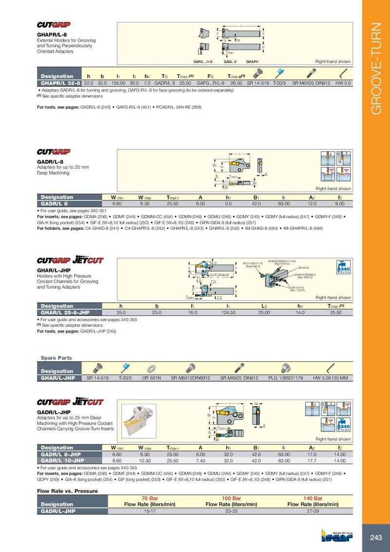 l1 GHAPR/L-8 h h External Holders for Grooving l2 h4 and Turning Perpendicularly b Oriented Adapters Tmax-r GAFG…R-8 GADL 8 GHAPR Right-hand shown Designation h b l 1 l 2 h 4 T G T max-r (1) F G T max- a (1) GHAPR/L 32-8 32.0 32.0 155.00 30.0 7.0 GADR/L 8 25.50 GAFG...R/L-8 26.00 SR 14-519 T-20/5 SR M6X25 DIN912 HW 5.0 • Adapters GADR/L-8 for turning and grooving, GAFG-R/L-8 for face-grooving (to be ordered separately) (1) See specific adapter dimensions For tools, see pages: GADR/L-8 (243) • GAFG-R/L-8 (451) • PCADR/L 34N-RE (269) GROOVE-TURN l1 GADR/L-8 B1 Adapters for up to 25 mm h1 Deep Machining f2 A Tmax-r A2 W Right-hand shown Designation W min W max T max-r A h 1 B 1 l 1 A 2 f 2 GADR/L 8 6.60 8.30 25.50 6.00 0.0 42.0 63.00 12.0 9.00 • For user guide, see pages 340-351 For inserts, see pages: GDMA (256) • GDMF (244) • GDMM-CC (454) • GDMN (246) • GDMU (246) • GDMY (245) • GDMY (full radius) (247) • GDMY-F (248) • GIA-K (long pocket) (254) • GIF-E (W=8,10 full radius) (250) • GIF-E (W=8,10) (248) • GIPA/GIDA 8 (full radius) (257) For holders, see pages: C#-GHAD-8 (241) • C#-GHAPR/L-8 (242) • GHAPR/L-8 (243) • GHAR/L-8 (242) • IM-GHAD-8 (484) • IM-GHAPR/L-8 (484) SR M6X25DIN912 12.9U 14.0 PLG 1/8ISO1179 (Key: HW5.0) (Key:HW5.0) h h OR 5X1N GHAR/L-JHP h4 Bar Max G 1/8"-28 typ.x2 Holders with High Pressure SR M6X12DIN6912 L5 l 1 (Key: HW5.0) Coolant Channels for Grooving 4.5 7.0 and Turning Adapters SR 14-519 f1 b (Key: T-20/5) Tmax-r 7.0 Right-hand shown Designation h b f 1 l 1 L 5 h 4 T max-r (1) GHAR/L 25-8-JHP 25.0 25.0 16.0 124.50 25.00 14.0 25.50 • For user guide and accessories see pages 340-355 (1) See specific adapter dimensions For tools, see pages: GADR/L-JHP (243) Spare Parts Designation GHAR/L-JHP SR 14-519 T-20/5 OR 5X1N SR M6X12DIN6912 SR M6X25 DIN912 PLG 1/8ISO1179 HW 5.0X120 MM l1 A2 GADR/L-JHP B1 Adapters for up to 25 mm Deep h1 Machining with High Pressure Coolant A Channels Carrying Groove-Turn Inserts Tmax-r Bar Max f2 W Right-hand shown Designation W min W max T max-r A h 1 B 1 l 1 A 2 f 2 GADR/L 8-JHP 6.60 8.30 25.50 6.00 32.0 42.0 63.00 17.0 14.00 GADR/L 10-JHP 8.60 10.30 25.50 7.40 32.0 42.0 63.00 17.7 14.00 • For user guide and accessories see pages 340-355 For inserts, see pages: GDMA (256) • GDMF (244) • GDMM-CC (454) • GDMN (246) • GDMU (246) • GDMY (245) • GDMY (full radius) (247) • GDMY-F (248) • GDPY (249) • GIA-K (long pocket) (254) • GIF (long pocket) (253) • GIF-E (W=8,10 full radius) (250) • GIF-E (W=8,10) (248) • GIPA/GIDA 8 (full radius) (257) Flow Rate vs. Pressure 70 Bar 100 Bar 140 Bar Designation Flow Rate (liters/min) Flow Rate (liters/min) Flow Rate (liters/min) GADR/L-JHP 15-17 23-25 27-29 243