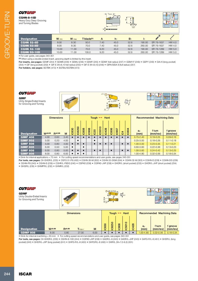 Tblade CGHN-8-10D Heavy Duty Deep Grooving B1 h1 and Turning Blades A l1 150˚ W Designation W min W max T blade (1) A h 1 B 1 l 1 CGHN 52-8D 8.00 8.30 50.0 7.40 45.0 52.6 190.00 SR 76-1637 HW 4.0 CGHN 53-8D 8.00 8.30 70.0 7.40 45.0 52.6 260.00 SR 76-1637 HW 4.0 CGHN 52-10D 10.00 11.00 70.0 9.20 45.0 52.6 190.00 SR 76-1289 HW 5.0 CGHN 53-10D 10.00 11.00 100.0 9.20 45.0 52.6 260.00 SR 76-1289 HW 5.0 • For user guide, see pages 340-351 GROOVE-TURN (1) When using a double-ended insert, grooving depth is limited by the insert. For inserts, see pages: GDMF (244) • GDMN (246) • GDMU (246) • GDMY (245) • GDMY (full radius) (247) • GDMY-F (248) • GDPY (249) • GIA-K (long pocket) (254) • GIF (long pocket) (253) • GIF-E (W=8,10 full radius) (250) • GIF-E (W=8,10) (248) • GIPA/GIDA 8 (full radius) (257) For holders, see pages: SGTBK (473) • SGTBU/SGTBN (472) ±0.1 GIMF 7º Utility Single-Ended Inserts 15.3Ref 5 for Grooving and Turning W M R Dimensions Tough 1 Hard Recommended Machining Data a p f turn f groove Designation W ±0.05 R ±0.05 M IC830 IC8250 IC808 IC908 IC20 IC5010 IC428 IC806 IC907 IC4 IC804 (mm) (mm/rev) (mm/rev) GIMF 406 4.00 0.60 3.40 • • • • • • • • • • • 0.75-2.40 0.19-0.25 0.09-0.16 GIMF 502 5.00 0.20 4.00 • • 0.25-3.00 0.18-0.26 0.11-0.18 GIMF 508 5.00 0.80 4.00 • • • • • • • • • 1.00-3.00 0.23-0.35 0.11-0.21 GIMF 605 6.00 0.50 5.00 • • 0.60-3.60 0.22-0.36 0.13-0.23 GIMF 608 6.00 0.80 5.00 • • • • • • • • 1.00-3.60 0.24-0.42 0.13-0.25 GIMF 808 8.00 0.80 6.00 • • • 1.00-4.80 0.32-0.56 0.18-0.34 • Dmin for internal applications = 70 mm • For cutting speed recommendations and user guide, see pages 340-351 For tools, see pages: C#-GHDR/L (233) • CGFG 51-P8 (452) • CGHN 26-M (302) • CGHN 32-DGM (304) • CGHN 32-M (303) • CGHN-D (239) • CGHN-DG (239) • CGHN-P8 (240) • CGHN-S (239) • CGHR/L-P8DG (240) • CGPAD (238) • CGPAD-JHP (238) • GHDR/L (short pocket) (233) • GHDR/L-JHP (short pocket) (234) • GHGR/L (235) • GHMPR/L (232) • GHMR/L (232) 30 Ref. GDMF 7 6.4 Utility Double-Ended Inserts M for Grooving and Turning W R Dimensions Tough 1 Hard Recommended Machining Data a p f turn f groove Designation W ±0.05 R ±0.05 T max-r M IC830 IC8250 IC808 IC5010 IC428 (mm) (mm/rev) (mm/rev) GDMF 808 8.00 0.80 27.00 6.00 • • • • • 1.00-4.80 0.32-0.56 0.18-0.34 • Dmin for internal machining = 65 mm • For cutting speed recommendations and user guide, see pages 340-351 For tools, see pages: C#-GHDR/L (233) • CGHN-8-10D (244) • CGPAD-JHP (238) • GADR/L-8 (243) • GADR/L-JHP (243) • GAFG-R/L-8 (451) • GHDR/L (long pocket) (240) • GHDR/L-JHP (long pocket) (241) • GHFG-R/L-8 (450) • GHFGR/L-8 (450) • GHIR/L (W=7.0-8.3) (301) 244 ISCAR