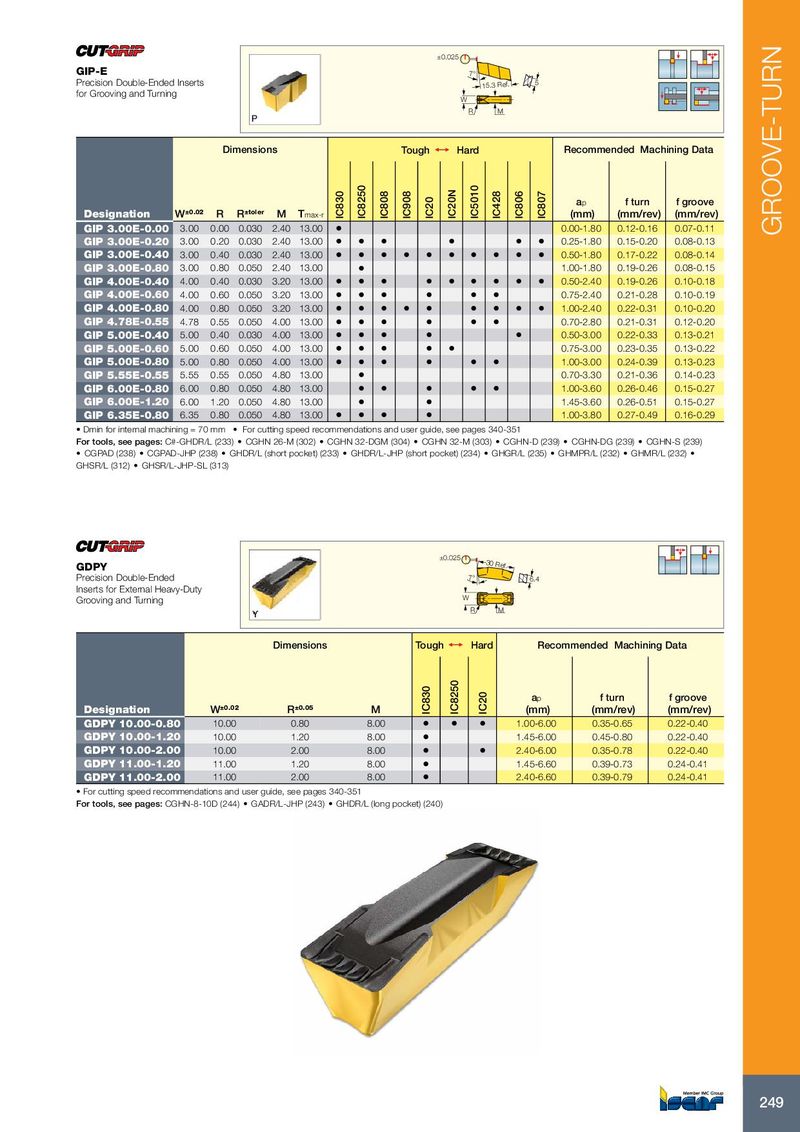 ±0.025 GIP-E 7° Precision Double-Ended Inserts 15.3 Ref. 5 for Grooving and Turning W R M Dimensions Tough 1 Hard Recommended Machining Data a p f turn f groove Designation W ±0.02 R R ±toler M T max-r IC830 IC8250 IC808 IC908 IC20 IC20N IC5010 IC428 IC806 IC807 (mm) (mm/rev) (mm/rev) GIP 3.00E-0.00 3.00 0.00 0.030 2.40 13.00 • 0.00-1.80 0.12-0.16 0.07-0.11 GROOVE-TURN GIP 3.00E-0.20 3.00 0.20 0.030 2.40 13.00 • • • • • • 0.25-1.80 0.15-0.20 0.08-0.13 GIP 3.00E-0.40 3.00 0.40 0.030 2.40 13.00 • • • • • • • • • • 0.50-1.80 0.17-0.22 0.08-0.14 GIP 3.00E-0.80 3.00 0.80 0.050 2.40 13.00 • 1.00-1.80 0.19-0.26 0.08-0.15 GIP 4.00E-0.40 4.00 0.40 0.030 3.20 13.00 • • • • • • • • • 0.50-2.40 0.19-0.26 0.10-0.18 GIP 4.00E-0.60 4.00 0.60 0.050 3.20 13.00 • • • • • • 0.75-2.40 0.21-0.28 0.10-0.19 GIP 4.00E-0.80 4.00 0.80 0.050 3.20 13.00 • • • • • • • • • 1.00-2.40 0.22-0.31 0.10-0.20 GIP 4.78E-0.55 4.78 0.55 0.050 4.00 13.00 • • • • • • 0.70-2.80 0.21-0.31 0.12-0.20 GIP 5.00E-0.40 5.00 0.40 0.030 4.00 13.00 • • • • • 0.50-3.00 0.22-0.33 0.13-0.21 GIP 5.00E-0.60 5.00 0.60 0.050 4.00 13.00 • • • • • 0.75-3.00 0.23-0.35 0.13-0.22 GIP 5.00E-0.80 5.00 0.80 0.050 4.00 13.00 • • • • • • 1.00-3.00 0.24-0.39 0.13-0.23 GIP 5.55E-0.55 5.55 0.55 0.050 4.80 13.00 • 0.70-3.30 0.21-0.36 0.14-0.23 GIP 6.00E-0.80 6.00 0.80 0.050 4.80 13.00 • • • • • 1.00-3.60 0.26-0.46 0.15-0.27 GIP 6.00E-1.20 6.00 1.20 0.050 4.80 13.00 • • 1.45-3.60 0.26-0.51 0.15-0.27 GIP 6.35E-0.80 6.35 0.80 0.050 4.80 13.00 • • • • 1.00-3.80 0.27-0.49 0.16-0.29 • Dmin for internal machining = 70 mm • For cutting speed recommendations and user guide, see pages 340-351 For tools, see pages: C#-GHDR/L (233) • CGHN 26-M (302) • CGHN 32-DGM (304) • CGHN 32-M (303) • CGHN-D (239) • CGHN-DG (239) • CGHN-S (239) • CGPAD (238) • CGPAD-JHP (238) • GHDR/L (short pocket) (233) • GHDR/L-JHP (short pocket) (234) • GHGR/L (235) • GHMPR/L (232) • GHMR/L (232) • GHSR/L (312) • GHSR/L-JHP-SL (313) ±0.025 30 Ref. GDPY Precision Double-Ended 7° 6.4 Inserts for External Heavy-Duty Grooving and Turning W R M Dimensions Tough 1 Hard Recommended Machining Data a p f turn f groove Designation W ±0.02 R ±0.05 M IC830 IC8250 IC20 (mm) (mm/rev) (mm/rev) GDPY 10.00-0.80 10.00 0.80 8.00 • • • 1.00-6.00 0.35-0.65 0.22-0.40 GDPY 10.00-1.20 10.00 1.20 8.00 • 1.45-6.00 0.45-0.80 0.22-0.40 GDPY 10.00-2.00 10.00 2.00 8.00 • • 2.40-6.00 0.35-0.78 0.22-0.40 GDPY 11.00-1.20 11.00 1.20 8.00 • 1.45-6.60 0.39-0.73 0.24-0.41 GDPY 11.00-2.00 11.00 2.00 8.00 • 2.40-6.60 0.39-0.79 0.24-0.41 • For cutting speed recommendations and user guide, see pages 340-351 For tools, see pages: CGHN-8-10D (244) • GADR/L-JHP (243) • GHDR/L (long pocket) (240) 249