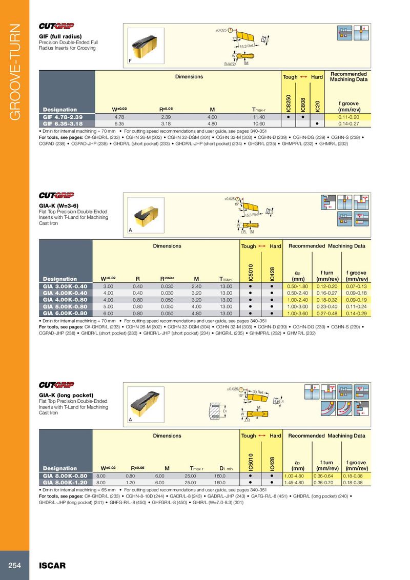 ±0.025 GIF (full radius) 7° 5 Precision Double-Ended Full Radius Inserts for Grooving 15.3 Ref. W R=W/2 M Recommended Dimensions Tough 1 Hard Machining Data f groove Designation W ±0.02 R ±0.05 M T max-r IC8250 IC808 IC20 (mm/rev) GROOVE-TURN GIF 4.78-2.39 4.78 2.39 4.00 11.40 • • 0.11-0.20 GIF 6.35-3.18 6.35 3.18 4.80 10.60 • 0.14-0.27 • Dmin for internal machining = 70 mm • For cutting speed recommendations and user guide, see pages 340-351 For tools, see pages: C#-GHDR/L (233) • CGHN 26-M (302) • CGHN 32-DGM (304) • CGHN 32-M (303) • CGHN-D (239) • CGHN-DG (239) • CGHN-S (239) • CGPAD (238) • CGPAD-JHP (238) • GHDR/L (short pocket) (233) • GHDR/L-JHP (short pocket) (234) • GHGR/L (235) • GHMPR/L (232) • GHMR/L (232) ±0.025 15° GIA-K (W=3-6) 7° Flat Top Precision Double-Ended 5 Inserts with T-Land for Machining 15.3 Ref. Cast Iron W R M Dimensions Tough 1 Hard Recommended Machining Data a p f turn f groove Designation W ±0.02 R R ±toler M T max-r IC5010 IC428 (mm) (mm/rev) (mm/rev) GIA 3.00K-0.40 3.00 0.40 0.030 2.40 13.00 • • 0.50-1.80 0.12-0.20 0.07-0.13 GIA 4.00K-0.40 4.00 0.40 0.030 3.20 13.00 • • 0.50-2.40 0.16-0.27 0.09-0.18 GIA 4.00K-0.80 4.00 0.80 0.050 3.20 13.00 • • 1.00-2.40 0.18-0.32 0.09-0.19 GIA 5.00K-0.80 5.00 0.80 0.050 4.00 13.00 • • 1.00-3.00 0.23-0.40 0.11-0.24 GIA 6.00K-0.80 6.00 0.80 0.050 4.80 13.00 • • 1.00-3.60 0.27-0.48 0.14-0.29 • Dmin for internal machining = 70 mm • For cutting speed recommendations and user guide, see pages 340-351 For tools, see pages: C#-GHDR/L (233) • CGHN 26-M (302) • CGHN 32-DGM (304) • CGHN 32-M (303) • CGHN-D (239) • CGHN-DG (239) • CGHN-S (239) • CGPAD-JHP (238) • GHDR/L (short pocket) (233) • GHDR/L-JHP (short pocket) (234) • GHGR/L (235) • GHMPR/L (232) • GHMR/L (232) ±0.025 30 Ref. GIA-K (long pocket) 15° Flat Top Precision Double-Ended 7° 6.4 Inserts with T-Land for Machining M Cast Iron D 1 W R Dimensions Tough 1 Hard Recommended Machining Data a p f turn f groove Designation W ±0.02 R ±0.05 M T max-r D 1 min IC5010 IC428 (mm) (mm/rev) (mm/rev) GIA 8.00K-0.80 8.00 0.80 6.00 25.00 160.0 • • 1.00-4.80 0.36-0.64 0.18-0.38 GIA 8.00K-1.20 8.00 1.20 6.00 25.00 160.0 • • 1.45-4.80 0.36-0.70 0.18-0.38 • Dmin for internal machining = 65 mm • For cutting speed recommendations and user guide, see pages 340-351 For tools, see pages: C#-GHDR/L (233) • CGHN-8-10D (244) • GADR/L-8 (243) • GADR/L-JHP (243) • GAFG-R/L-8 (451) • GHDR/L (long pocket) (240) • GHDR/L-JHP (long pocket) (241) • GHFG-R/L-8 (450) • GHFGR/L-8 (450) • GHIR/L (W=7.0-8.3) (301) 254 ISCAR