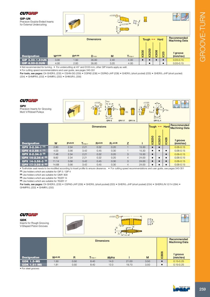 ±0.025 GIP-UN 7° Precision Double-Ended Inserts 5 for External Undercutting 15.3 Ref. W R Recommended Dimensions Tough 1 Hard Machining Data f groove Designation W ±0.05 R ±0.05 D min M T max-r IC830 IC8250 IC808 IC20 (mm/rev) GIP 3.00-1.50UN 3.00 1.50 35.00 2.40 4.00 • • • • 0.05-0.15 GROOVE-TURN GIP 4.00-2.0UN 4.00 2.00 35.00 3.20 4.00 • • 0.05-0.15 • Not recommended for turning. • For undercutting at 45° and D100 mm, other GIP inserts apply as well. • For cutting speed recommendations and user guide, see pages 340-351 For tools, see pages: C#-GHDR/L (233) • CGHN-DG (239) • CGPAD (238) • CGPAD-JHP (238) • GHDR/L (short pocket) (233) • GHDR/L-JHP (short pocket) (234) • GHMPR/L (232) • GHMR/L (232) • GHMUR/L (258) Tmax-r ±0.025 ±0.025 W W GPV 5˚ R P 5˚ R R 1 Precision Inserts for Grooving 7˚ 7˚ 5˚ Typ. l Ref 5˚ Typ. Multi V-Ribbed Pulleys R 1 l Ref Tmax-r 40˚ ±30´ Typ. 40˚ ±30´ Typ GPV 8 GPV 17 GPV 14 GPV 3, 4 Recommended Dimensions Tough 1 Hard Machining Data f groove Designation W P ±0.03 T max-r R ±0.05 R 1 ±0.05 Z l IC8250 IC5010 IC428 (mm/rev) GPV 3-2.34-1 (1) 2.80 2.34 2.21 0.32 0.20 1 15.30 • • 0.06-0.15 GPV 4-3.56-1 (1) 4.03 3.56 3.42 0.45 0.30 1 15.30 • • • 0.06-0.15 GPV 8-2.34-3 (2) 7.48 2.34 2.21 0.32 0.20 3 15.30 • • 0.06-0.15 GPV 14-2.34-4 (3) 9.82 2.34 2.21 0.32 0.20 4 24.00 • • • 0.06-0.15 GPV 14-3.56-3 (3) 11.14 3.56 3.42 0.45 0.30 3 24.00 • • • 0.06-0.15 GPV 17-3.56-4 (4) 14.68 3.56 3.42 0.45 0.30 4 24.00 • • • 0.06-0.15 • Toolholder seat needs to be modified according to insert profile to ensure clearance. • For cutting speed recommendations and user guide, see pages 340-351 (1) Use holders which are suitable for GIP 3 / GIP 4 (2) Use holders which are suitable for GIMY 808 (3) Use holders which are suitable for TIGER 14 (4) Use holders which are suitable for TIGER 17 For tools, see pages: C#-GHDR/L (233) • CGPAD-JHP (238) • GHDR/L (short pocket) (233) • GHDR/L-JHP (short pocket) (234) • GHDR/L/N 12/14 (284) • GHMPR/L (232) • GHMR/L (232) ±0.025 l GDK 5.5 Inserts for Rough Grooving 7° V-Shaped Piston Grooves W alpha° M R Tmax-r Recommended Dimensions Machining Data f groove Designation W ±0.02 R T max-r alpha l M IC808 (mm/rev) GDK 1.5-MS 1.50 0.50 8.40 14.0 21.00 3.50 • 0.15-0.25 GDK 1.81-MS 1.81 0.50 8.40 12.0 19.70 3.50 • 0.15-0.25 • For steel grooves 259