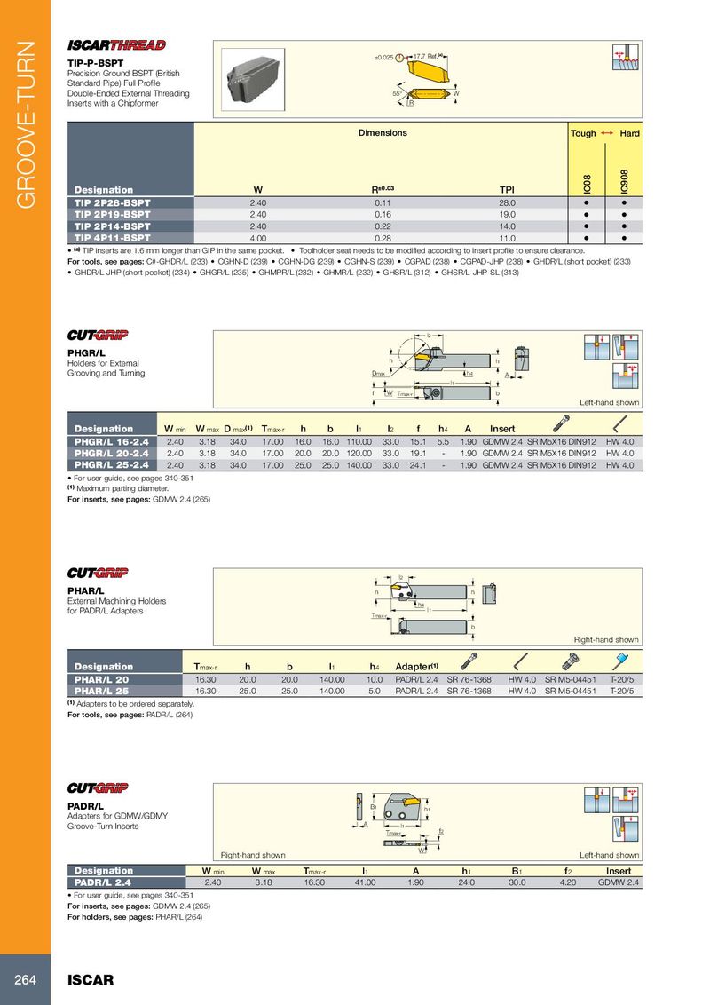 17.7 Ref. (a) ±0.025 TIP-P-BSPT Precision Ground BSPT (British Standard Pipe) Full Profile Double-Ended External Threading 55° W Inserts with a Chipformer R Dimensions Tough 1 Hard Designation W R ±0.03 TPI IC08 IC908 GROOVE-TURN TIP 2P28-BSPT 2.40 0.11 28.0 • • TIP 2P19-BSPT 2.40 0.16 19.0 • • TIP 2P14-BSPT 2.40 0.22 14.0 • • TIP 4P11-BSPT 4.00 0.28 11.0 • • • (a) TIP inserts are 1.6 mm longer than GIP in the same pocket. • Toolholder seat needs to be modified according to insert profile to ensure clearance. For tools, see pages: C#-GHDR/L (233) • CGHN-D (239) • CGHN-DG (239) • CGHN-S (239) • CGPAD (238) • CGPAD-JHP (238) • GHDR/L (short pocket) (233) • GHDR/L-JHP (short pocket) (234) • GHGR/L (235) • GHMPR/L (232) • GHMR/L (232) • GHSR/L (312) • GHSR/L-JHP-SL (313) l2 PHGR/L Holders for External h h Grooving and Turning Dmax h4 A l1 f W Tmax-r b Left-hand shown Designation W min W max D max (1) T max-r h b l 1 l 2 f h 4 A Insert PHGR/L 16-2.4 2.40 3.18 34.0 17.00 16.0 16.0 110.00 33.0 15.1 5.5 1.90 GDMW 2.4 SR M5X16 DIN912 HW 4.0 PHGR/L 20-2.4 2.40 3.18 34.0 17.00 20.0 20.0 120.00 33.0 19.1 - 1.90 GDMW 2.4 SR M5X16 DIN912 HW 4.0 PHGR/L 25-2.4 2.40 3.18 34.0 17.00 25.0 25.0 140.00 33.0 24.1 - 1.90 GDMW 2.4 SR M5X16 DIN912 HW 4.0 • For user guide, see pages 340-351 (1) Maximum parting diameter. For inserts, see pages: GDMW 2.4 (265) l2 PHAR/L h h External Machining Holders h4 for PADR/L Adapters l1 Tmax-r b Right-hand shown Designation T max-r h b l 1 h 4 Adapter (1) PHAR/L 20 16.30 20.0 20.0 140.00 10.0 PADR/L 2.4 SR 76-1368 HW 4.0 SR M5-04451 T-20/5 PHAR/L 25 16.30 25.0 25.0 140.00 5.0 PADR/L 2.4 SR 76-1368 HW 4.0 SR M5-04451 T-20/5 (1) Adapters to be ordered separately. For tools, see pages: PADR/L (264) PADR/L B1 h1 Adapters for GDMW/GDMY Groove-Turn Inserts A l1 Tmax-r f2 W Right-hand shown Left-hand shown Designation W min W max T max-r l 1 A h 1 B 1 f 2 Insert PADR/L 2.4 2.40 3.18 16.30 41.00 1.90 24.0 30.0 4.20 GDMW 2.4 • For user guide, see pages 340-351 For inserts, see pages: GDMW 2.4 (265) For holders, see pages: PHAR/L (264) 264 ISCAR
