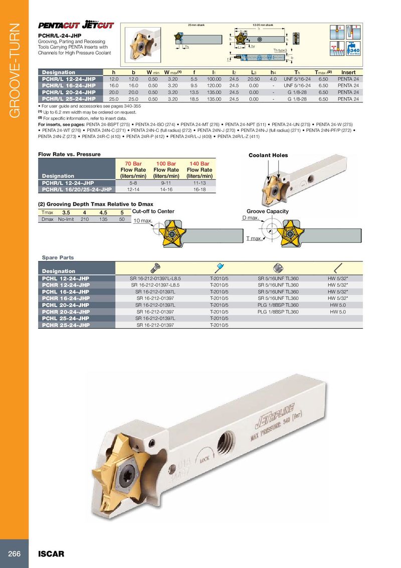 25 mm shank 12-20 mm shank l1 l2 PCHR/L-24-JHP h h Grooving, Parting and Recessing Tools Carrying PENTA Inserts with Th L3 h4 Th typx3 Channels for High Pressure Coolant Bar Max f b Designation h b W min W max (1) f l 1 l 2 L 3 h 4 T h T max-r (2) Insert PCHR/L 12-24-JHP 12.0 12.0 0.50 3.20 5.5 100.00 24.5 20.50 4.0 UNF 5/16-24 6.50 PENTA 24 PCHR/L 16-24-JHP 16.0 16.0 0.50 3.20 9.5 120.00 24.5 0.00 - UNF 5/16-24 6.50 PENTA 24 PCHR/L 20-24-JHP 20.0 20.0 0.50 3.20 13.5 135.00 24.5 0.00 - G 1/8-28 6.50 PENTA 24 PCHR/L 25-24-JHP 25.0 25.0 0.50 3.20 18.5 135.00 24.5 0.00 - G 1/8-28 6.50 PENTA 24 • For user guide and accessories see pages 340-355 (1) Up to 6.2 mm width may be ordered on request. GROOVE-TURN (2) For specific information, refer to insert data. For inserts, see pages: PENTA 24-BSPT (275) • PENTA 24-ISO (274) • PENTA 24-MT (276) • PENTA 24-NPT (511) • PENTA 24-UN (275) • PENTA 24-W (275) • PENTA 24-WT (276) • PENTA 24N-C (271) • PENTA 24N-C (full radius) (272) • PENTA 24N-J (270) • PENTA 24N-J (full radius) (271) • PENTA 24N-PF/P (272) • PENTA 24N-Z (273) • PENTA 24R-C (410) • PENTA 24R-P (412) • PENTA 24R/L-J (409) • PENTA 24R/L-Z (411) Flow Rate vs. Pressure Coolant Holes 70 Bar 100 Bar 140 Bar Flow Rate Flow Rate Flow Rate Designation (liters/min) (liters/min) (liters/min) PCHR/L 12-24-JHP 5-8 9-11 11-13 PCHR/L 16/20/25-24-JHP 12-14 14-16 16-18 (2) Grooving Depth Tmax Relative to Dmax Tmax 3.5 4 4.5 5 Cut-off to Center Groove Capacity Dmax No-limit 210 135 50 D max. 10 max. T max. Spare Parts Designation PCHL 12-24-JHP SR 16-212-01397L-L8.5 T-2010/5 SR 5/16UNF TL360 HW 5/32" PCHR 12-24-JHP SR 16-212-01397-L8.5 T-2010/5 SR 5/16UNF TL360 HW 5/32" PCHL 16-24-JHP SR 16-212-01397L T-2010/5 SR 5/16UNF TL360 HW 5/32" PCHR 16-24-JHP SR 16-212-01397 T-2010/5 SR 5/16UNF TL360 HW 5/32" PCHL 20-24-JHP SR 16-212-01397L T-2010/5 PLG 1/8BSP TL360 HW 5.0 PCHR 20-24-JHP SR 16-212-01397 T-2010/5 PLG 1/8BSP TL360 HW 5.0 PCHL 25-24-JHP SR 16-212-01397L T-2010/5 PCHR 25-24-JHP SR 16-212-01397 T-2010/5 266 ISCAR