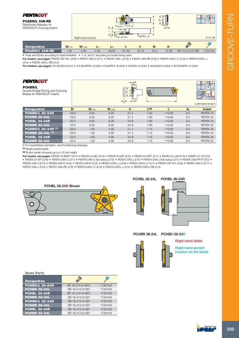 h h B1 PCADR/L 34N-RE Reinforced Adapters for L3 l1 PENTACUT Grooving Inserts A1 L5 f f1 b f2 W Tmax-r GHAR ...-8 Right-hand shown F=f1+f2 Designation W min W max L 3 L 5 l 1 f 2 B 1 A 1 PCADR/L 34N-RE 1.50 4.00 5.50 29.50 61.50 10.15 42.0 12.00 SR 16-212-01397 T-2010/5 • Tmax and Dmax according to insert limitation • h, b, and f1 according to holder being used For inserts, see pages: PENTA 34F-R/L (458) • PENTA 34N-C (277) • PENTA 34N-J (278) • PENTA 34N-PB (276) • PENTA 34R/L-C (413) • PENTA 34R/L-J (414) • PENTA 34R/L-PB (414) For holders, see pages: C#-GHAD-8 (241) • C#-GHAPR/L-8 (242) • GHAPR/L-8 (243) • GHAR/L-8 (242) • IM-GHAD-8 (484) • IM-GHAPR/L-8 (484) GROOVE-TURN W PCHBR/L Double-Ended Parting and Grooving B1 h1 Blades for PENTACUT Inserts f2 A2 l1 Left-hand shown Designation B 1 W min W max h 1 f 2 (2) l 1 A 2 Insert PCHBR/L 26-24R 26.0 0.50 6.20 21.4 7.00 110.00 8.5 PENTA 24 PCHBR 26-24L 26.0 0.50 6.20 21.4 7.00 110.00 8.5 PENTA 24 PCHBL 32-24R 32.0 0.50 6.20 24.8 7.00 110.00 8.5 PENTA 24 PCHBR 32-24L 32.0 0.50 6.20 24.8 7.00 110.00 8.5 PENTA 24 PCHBR/L 26-34R (1) 26.0 1.50 4.00 21.4 7.15 110.00 8.5 PENTA 34 PCHBR 26-34L (1) 26.0 1.50 4.00 21.4 7.15 110.00 8.5 PENTA 34 PCHBL 32-34R 32.0 1.50 4.00 24.8 7.15 110.00 8.5 PENTA 34 PCHBR 32-34L 32.0 1.50 4.00 24.8 7.15 110.00 8.5 PENTA 34 • For insert/blade orientation, see the following drawings (1) Single pocket blade (2) To the center of inserts up to 4.15 mm width For inserts, see pages: PENTA 24-BSPT (275) • PENTA 24-ISO (274) • PENTA 24-MT (276) • PENTA 24-NPT (511) • PENTA 24-UN (275) • PENTA 24-W (275) • PENTA 24-WT (276) • PENTA 24N-C (271) • PENTA 24N-C (full radius) (272) • PENTA 24N-J (270) • PENTA 24N-J (full radius) (271) • PENTA 24N-PF/P (272) • PENTA 24N-Z (273) • PENTA 24R-C (410) • PENTA 24R-P (412) • PENTA 24R/L-J (409) • PENTA 24R/L-Z (411) • PENTA 34F-R/L (458) • PENTA 34N-C (277) • PENTA 34N-J (278) • PENTA 34N-PB (276) • PENTA 34R/L-C (413) • PENTA 34R/L-J (414) • PENTA 34R/L-PB (414) PCHBL 26-24L PCHBL 26-24R PCHBL 26-24R Shown Lock Lock PCHBR 26-24L PCHBR 26-24R Right-hand blade Right-hand pocket location on the blade Spare Parts Designation PCHBR/L 26-24R SR 16-212-01397L T-2010/5 PCHBR 26-24L SR 16-212-01397 T-2010/5 PCHBL 32-24R SR 16-212-01397L T-2010/5 PCHBR 32-24L SR 16-212-01397 T-2010/5 PCHBR/L 26-34R SR 16-212-01397 T-2010/5 PCHBR 26-34L SR 16-212-01397 T-2010/5 PCHBL 32-34R SR 16-212-01397 T-2010/5 PCHBR 32-34L SR 16-212-01397 T-2010/5 269