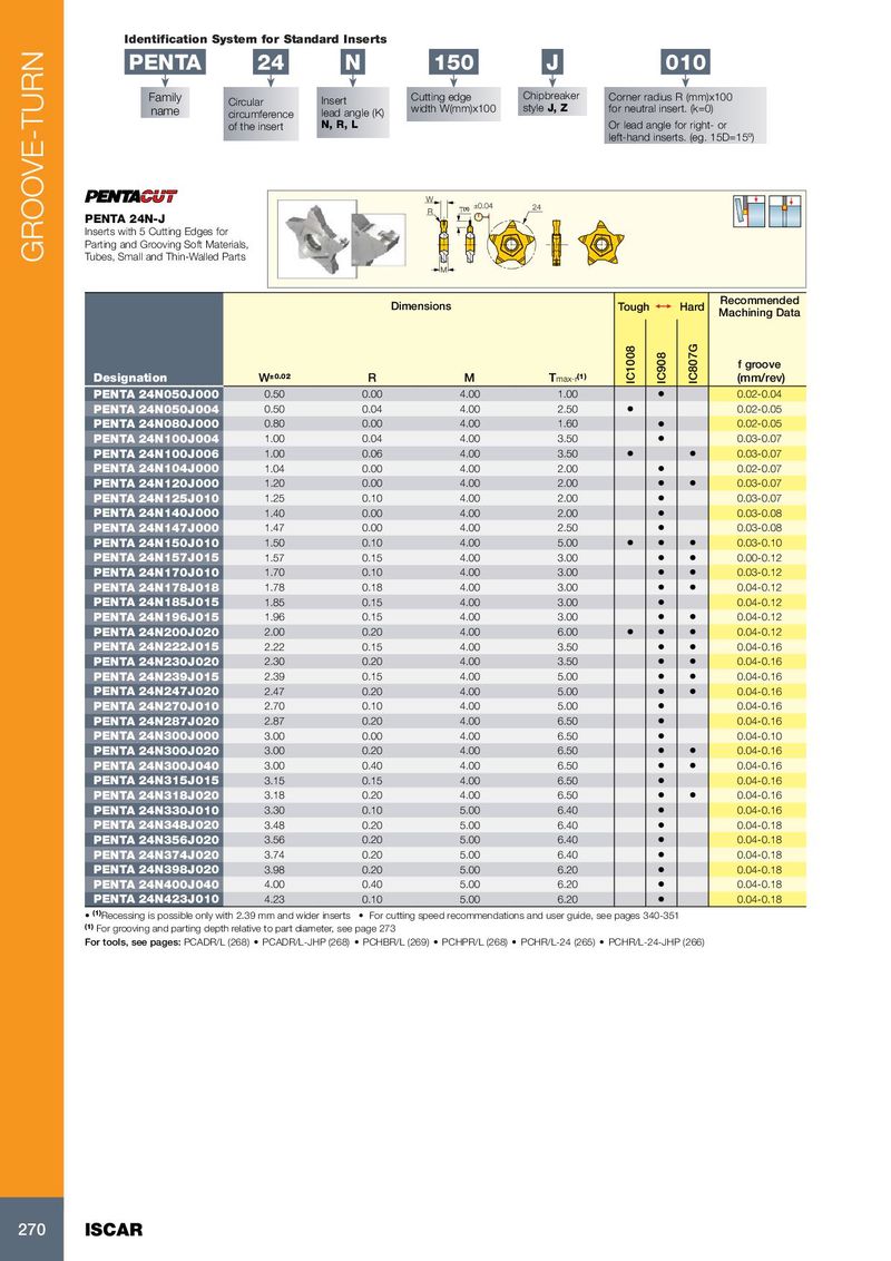 Identification System for Standard Inserts PENTA 24 N 150 J 010 Family Circular Insert Cutting edge Chipbreaker Corner radius R (mm)x100 name circumference lead angle (K) width W(mm)x100 style J, Z for neutral insert. (k=0) of the insert N, R, L Or lead angle for right- or left-hand inserts. (eg. 15D=15º) W ±0.04 R T (1) 24 PENTA 24N-J Inserts with 5 Cutting Edges for Parting and Grooving Soft Materials, GROOVE-TURN Tubes, Small and Thin-Walled Parts M Recommended Dimensions Tough 1 Hard Machining Data f groove Designation W ±0.02 R M T max-r (1) IC1008 IC908 IC807G (mm/rev) PENTA 24N050J000 0.50 0.00 4.00 1.00 • 0.02-0.04 PENTA 24N050J004 0.50 0.04 4.00 2.50 • 0.02-0.05 PENTA 24N080J000 0.80 0.00 4.00 1.60 • 0.02-0.05 PENTA 24N100J004 1.00 0.04 4.00 3.50 • 0.03-0.07 PENTA 24N100J006 1.00 0.06 4.00 3.50 • • 0.03-0.07 PENTA 24N104J000 1.04 0.00 4.00 2.00 • 0.02-0.07 PENTA 24N120J000 1.20 0.00 4.00 2.00 • • 0.03-0.07 PENTA 24N125J010 1.25 0.10 4.00 2.00 • 0.03-0.07 PENTA 24N140J000 1.40 0.00 4.00 2.00 • 0.03-0.08 PENTA 24N147J000 1.47 0.00 4.00 2.50 • 0.03-0.08 PENTA 24N150J010 1.50 0.10 4.00 5.00 • • • 0.03-0.10 PENTA 24N157J015 1.57 0.15 4.00 3.00 • • 0.00-0.12 PENTA 24N170J010 1.70 0.10 4.00 3.00 • • 0.03-0.12 PENTA 24N178J018 1.78 0.18 4.00 3.00 • • 0.04-0.12 PENTA 24N185J015 1.85 0.15 4.00 3.00 • 0.04-0.12 PENTA 24N196J015 1.96 0.15 4.00 3.00 • • 0.04-0.12 PENTA 24N200J020 2.00 0.20 4.00 6.00 • • • 0.04-0.12 PENTA 24N222J015 2.22 0.15 4.00 3.50 • • 0.04-0.16 PENTA 24N230J020 2.30 0.20 4.00 3.50 • • 0.04-0.16 PENTA 24N239J015 2.39 0.15 4.00 5.00 • • 0.04-0.16 PENTA 24N247J020 2.47 0.20 4.00 5.00 • • 0.04-0.16 PENTA 24N270J010 2.70 0.10 4.00 5.00 • 0.04-0.16 PENTA 24N287J020 2.87 0.20 4.00 6.50 • 0.04-0.16 PENTA 24N300J000 3.00 0.00 4.00 6.50 • 0.04-0.10 PENTA 24N300J020 3.00 0.20 4.00 6.50 • • 0.04-0.16 PENTA 24N300J040 3.00 0.40 4.00 6.50 • • 0.04-0.16 PENTA 24N315J015 3.15 0.15 4.00 6.50 • 0.04-0.16 PENTA 24N318J020 3.18 0.20 4.00 6.50 • • 0.04-0.16 PENTA 24N330J010 3.30 0.10 5.00 6.40 • 0.04-0.16 PENTA 24N348J020 3.48 0.20 5.00 6.40 • 0.04-0.18 PENTA 24N356J020 3.56 0.20 5.00 6.40 • 0.04-0.18 PENTA 24N374J020 3.74 0.20 5.00 6.40 • 0.04-0.18 PENTA 24N398J020 3.98 0.20 5.00 6.20 • 0.04-0.18 PENTA 24N400J040 4.00 0.40 5.00 6.20 • 0.04-0.18 PENTA 24N423J010 4.23 0.10 5.00 6.20 • 0.04-0.18 • (1) Recessing is possible only with 2.39 mm and wider inserts • For cutting speed recommendations and user guide, see pages 340-351 (1) For grooving and parting depth relative to part diameter, see page 273 For tools, see pages: PCADR/L (268) • PCADR/L-JHP (268) • PCHBR/L (269) • PCHPR/L (268) • PCHR/L-24 (265) • PCHR/L-24-JHP (266) 270 ISCAR