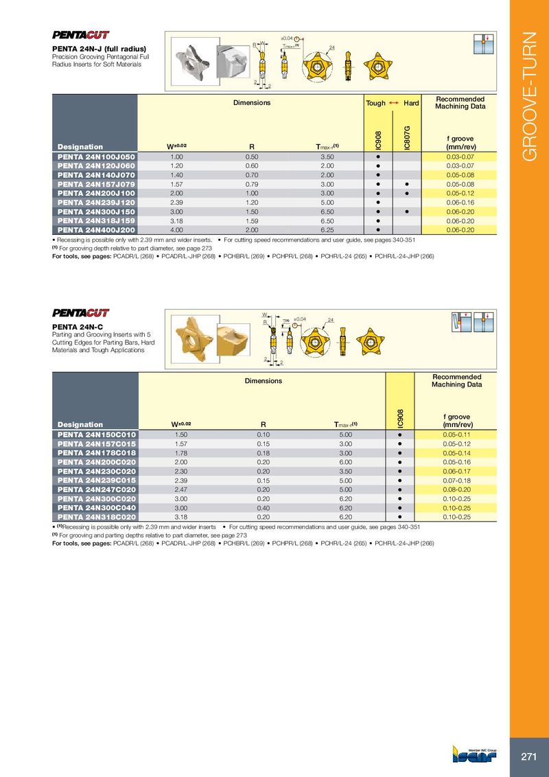 ±0.04 R W Tmax-r (1) PENTA 24N-J (full radius) 24 Precision Grooving Pentagonal Full Radius Inserts for Soft Materials 2 2 Recommended Dimensions Tough 1 Hard Machining Data f groove Designation W ±0.02 R T max-r (1) IC908 IC807G (mm/rev) PENTA 24N100J050 1.00 0.50 3.50 • 0.03-0.07 GROOVE-TURN PENTA 24N120J060 1.20 0.60 2.00 • 0.03-0.07 PENTA 24N140J070 1.40 0.70 2.00 • 0.05-0.08 PENTA 24N157J079 1.57 0.79 3.00 • • 0.05-0.08 PENTA 24N200J100 2.00 1.00 3.00 • • 0.05-0.12 PENTA 24N239J120 2.39 1.20 5.00 • 0.06-0.16 PENTA 24N300J150 3.00 1.50 6.50 • • 0.06-0.20 PENTA 24N318J159 3.18 1.59 6.50 • 0.06-0.20 PENTA 24N400J200 4.00 2.00 6.25 • 0.06-0.20 • Recessing is possible only with 2.39 mm and wider inserts. • For cutting speed recommendations and user guide, see pages 340-351 (1) For grooving depth relative to part diameter, see page 273 For tools, see pages: PCADR/L (268) • PCADR/L-JHP (268) • PCHBR/L (269) • PCHPR/L (268) • PCHR/L-24 (265) • PCHR/L-24-JHP (266) W R T (1) ±0.04 24 PENTA 24N-C Parting and Grooving Inserts with 5 Cutting Edges for Parting Bars, Hard Materials and Tough Applications 2 2 Recommended Dimensions Machining Data f groove Designation W ±0.02 R T max-r (1) IC908 (mm/rev) PENTA 24N150C010 1.50 0.10 5.00 • 0.05-0.11 PENTA 24N157C015 1.57 0.15 3.00 • 0.05-0.12 PENTA 24N178C018 1.78 0.18 3.00 • 0.05-0.14 PENTA 24N200C020 2.00 0.20 6.00 • 0.05-0.16 PENTA 24N230C020 2.30 0.20 3.50 • 0.06-0.17 PENTA 24N239C015 2.39 0.15 5.00 • 0.07-0.18 PENTA 24N247C020 2.47 0.20 5.00 • 0.08-0.20 PENTA 24N300C020 3.00 0.20 6.20 • 0.10-0.25 PENTA 24N300C040 3.00 0.40 6.20 • 0.10-0.25 PENTA 24N318C020 3.18 0.20 6.20 • 0.10-0.25 • (1) Recessing is possible only with 2.39 mm and wider inserts • For cutting speed recommendations and user guide, see pages 340-351 (1) For grooving and parting depths relative to part diameter, see page 273 For tools, see pages: PCADR/L (268) • PCADR/L-JHP (268) • PCHBR/L (269) • PCHPR/L (268) • PCHR/L-24 (265) • PCHR/L-24-JHP (266) 271