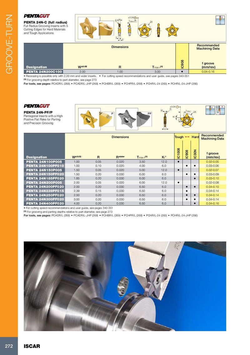 ±0.04 R W Tmax-r (1) PENTA 24N-C (full radius) 24 Full Radius Grooving Inserts with 5 Cutting Edges for Hard Materials and Tough Applications 2 2 Recommended Dimensions Machining Data f groove Designation W ±0.02 R T max-r (1) IC908 (mm/rev) GROOVE-TURN PENTA 24N200C100 2.00 1.00 3.00 • 0.04-0.16 • Recessing is possible only with 2.39 mm and wider inserts. • For cutting speed recommendations and user guide, see pages 340-351 (1) For grooving depth relative to part diameter, see page 273 For tools, see pages: PCADR/L (268) • PCADR/L-JHP (268) • PCHBR/L (269) • PCHPR/L (268) • PCHR/L-24 (265) • PCHR/L-24-JHP (266) ±0.04 W R Tmax-r PENTA 24N-PF/P 24 Pentagonal Inserts with a High Kr° Positive Flat Rake for Parting 7º and Precision Grooving 4 Recommended Dimensions Tough 1 Hard Machining Data f groove Designation W ±0.02 R R ±toler T max-r (1) K r ° IC1008 IC908 IC30N (mm/rev) PENTA 24N100P005 1.00 0.05 0.020 3.50 12.0 • 0.02-0.05 PENTA 24N100PF010 1.00 0.10 0.020 4.00 6.0 • • 0.03-0.06 PENTA 24N150P005 1.50 0.05 0.020 5.00 12.0 • 0.02-0.07 PENTA 24N150PF020 1.50 0.20 0.030 6.00 6.0 • • 0.03-0.09 PENTA 24N185PF020 1.85 0.20 0.030 6.00 6.0 • 0.03-0.10 PENTA 24N200P005 2.00 0.05 0.020 6.00 12.0 • 0.02-0.08 PENTA 24N200PF020 2.00 0.20 0.030 6.50 6.0 • • 0.04-0.10 PENTA 24N239PF015 2.39 0.15 0.030 6.50 6.0 • 0.04-0.14 PENTA 24N250PF020 2.50 0.20 0.030 6.50 6.0 • • 0.04-0.14 PENTA 24N300PF020 3.00 0.20 0.030 6.50 6.0 • • 0.04-0.14 PENTA 24N400PF020 4.00 0.20 0.030 6.50 6.0 • 0.04-0.16 • For cutting speed recommendations and user guide, see pages 340-351 (1) For grooving and parting depths relative to part diameter, see page 273 For tools, see pages: PCADR/L (268) • PCADR/L-JHP (268) • PCHBR/L (269) • PCHPR/L (268) • PCHR/L-24 (265) • PCHR/L-24-JHP (266) 272 ISCAR