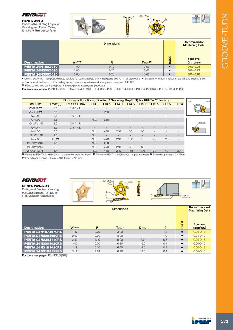 W R ±0.04 T 24 PENTA 24N-Z Inserts with 5 Cutting Edges for Grooving and Parting Tubes, Small and Thin-Walled Parts 4 Recommended Dimensions Machining Data f groove Designation W ±0.02 R T max-r (1) IC908 (mm/rev) PENTA 24N150Z010 1.50 0.10 5.00 • 0.05-0.08 GROOVE-TURN PENTA 24N200Z020 2.00 0.20 6.40 • 0.04-0.12 PENTA 24N300Z020 3.00 0.20 6.40 • 0.04-0.16 • Cutting edge with high positive rake, suitable for parting tubes, thin walled parts and for small diameters • Suitable for machining soft materials and bearing steel at low to medium feeds • For cutting speed recommendations and user guide, see pages 340-351 (1) For grooving and parting depths relative to part diameter, see page 273 For tools, see pages: PCADR/L (268) • PCADR/L-JHP (268) • PCHBR/L (269) • PCHPR/L (268) • PCHR/L-24 (265) • PCHR/L-24-JHP (266) Dmax as a Function of Parting / Grooving Depth (T) for PENTA 24 Inserts Tmax ÿ Dmax W±0.02 Tmax(3) Tmax / Dmax T≤3.0 T≤3.5 T≤4.0 T≤4.5 T≤5.0 T≤5.5 T≤6.5 T≤6.4 W=0.50 (1) 1.0 1.0 / N.L. - - - - - - - - W=0.50 (2) 2.5 250 W=0.80 1.6 1.6 / N.L. - - - - - - - - W=1.00 3.5 N.L. 250 - - - - - - ØDmax 1.04≤W≤1.40 2.0 2.0 / N.L. - - - - - - - - W=1.47 2.5 2.5 / N.L. - - - - - - - - W=1.50 5.0 N.L. 470 210 70 30 - - - 1.57≤W≤1.96 3.0 N.L. - - - - - - - W=2.00 6.0 (4) N.L. 470 210 130 75 45 20 - 2.22≤W≤2.30 3.5 N.L. 250 - - - - - - 2.39≤W≤2.50 5.0 N.L. 470 210 70 30 - - - 2.70≤W≤3.18 6.4 N.L. 470 210 135 100 70 40 20 (1) Refers to PENTA 24N050J000 - a precision grooving insert (2) Refers to PENTA 24N050J004 - a parting insert (3) Dmax for parting = 2 x Tmax (4) For full radius insert, Tmax = 3.0, Dmax = No limit ±0.025 24.2 Tmax PENTA 24N-J-RS Parting and Precision Grooving Pentagonal Inserts for Next to Dmax High Shoulder Applications W 3° pocket f inclination R Recommended Dimensions Machining Data f groove Designation W ±0.02 R T max-r D max f IC908 (mm/rev) PENTA 24N157J079RS 1.57 0.79 3.00 - 1.2 • 0.04-0.12 PENTA 24N200J020RS 2.00 0.20 3.00 - 1.0 • 0.04-0.12 PENTA 24N239J119RS 2.39 1.19 5.00 3.0 0.8 • 0.04-0.16 PENTA 24N300J020RS 3.00 0.20 6.20 16.0 0.4 • 0.04-0.16 PENTA 24N318J020RS 3.18 0.20 6.20 16.0 0.4 • 0.04-0.16 PENTA 24N318J159RS 3.18 1.59 6.20 16.0 0.4 • 0.04-0.16 For tools, see pages: PCHRS/LS (267) 273