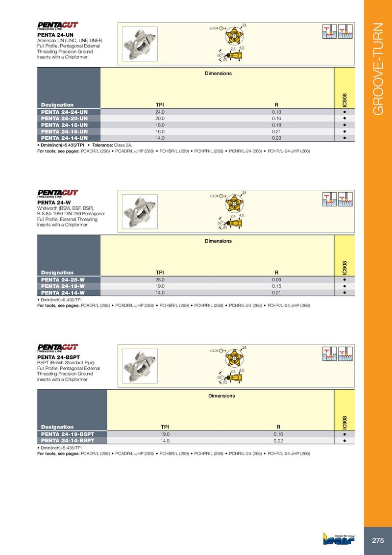 24 ±0.04 PENTA 24-UN American UN (UNC, UNF, UNEF) Full Profile, Pentagonal External 2.4 4.0 Threading Precision Ground 60° Inserts with a Chipformer R Dimensions Designation TPI R IC908 PENTA 24-24-UN 24.0 0.13 • GROOVE-TURN PENTA 24-20-UN 20.0 0.16 • PENTA 24-18-UN 18.0 0.18 • PENTA 24-16-UN 16.0 0.21 • PENTA 24-14-UN 14.0 0.23 • • Dmin(inch)=5.435/TPI • Tolerance: Class 2A. For tools, see pages: PCADR/L (268) • PCADR/L-JHP (268) • PCHBR/L (269) • PCHPR/L (268) • PCHR/L-24 (265) • PCHR/L-24-JHP (266) 24 ±0.04 PENTA 24-W Whitworth (BSW, BSF, BSP), B.S.84-1956 DIN 259 Pentagonal 2.4 4.0 Full Profile, External Threading 55° Inserts with a Chipformer R Dimensions Designation TPI R IC908 PENTA 24-28-W 28.0 0.09 • PENTA 24-19-W 19.0 0.15 • PENTA 24-14-W 14.0 0.21 • • Dmin(inch)=5.435/TPI For tools, see pages: PCADR/L (268) • PCADR/L-JHP (268) • PCHBR/L (269) • PCHPR/L (268) • PCHR/L-24 (265) • PCHR/L-24-JHP (266) 24 ±0.04 PENTA 24-BSPT BSPT (British Standard Pipe) Full Profile, Pentagonal External 2.4 4.0 Threading Precision Ground 55° Inserts with a Chipformer R Dimensions Designation TPI R IC908 PENTA 24-19-BSPT 19.0 0.16 • PENTA 24-14-BSPT 14.0 0.22 • • Dmin(inch)=5.435/TPI For tools, see pages: PCADR/L (268) • PCADR/L-JHP (268) • PCHBR/L (269) • PCHPR/L (268) • PCHR/L-24 (265) • PCHR/L-24-JHP (266) 275