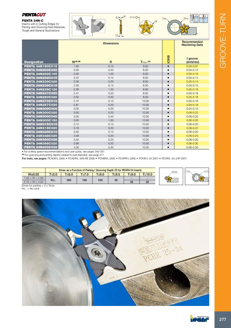 R W ±0.04 Tmax Dmax PENTA 34N-C 34 Inserts with 5 Cutting Edges for Parting and Grooving Hard Materials, Tough and General Applications 4.3 Recommended Dimensions Machining Data f groove Designation W ±0.02 R T max-r (1) IC908 (mm/rev) PENTA 34N150C015 1.50 0.15 8.00 • 0.03-0.07 GROOVE-TURN PENTA 34N200C020 2.00 0.20 8.00 • 0.04-0.14 PENTA 34N200C100 2.00 1.00 8.00 • 0.05-0.16 PENTA 34N222C015 2.22 0.15 8.00 • 0.05-0.14 PENTA 34N230C020 2.30 0.20 8.00 • 0.05-0.14 PENTA 34N239C015 2.39 0.15 8.00 • 0.05-0.15 PENTA 34N239C120 2.39 1.20 8.00 • 0.05-0.18 PENTA 34N247C020 2.47 0.20 8.00 • 0.05-0.18 PENTA 34N250C020 2.50 0.20 8.00 • 0.05-0.18 PENTA 34N270C010 2.70 0.10 10.00 • 0.05-0.18 PENTA 34N287C020 2.87 0.20 10.00 • 0.05-0.18 PENTA 34N300C000 3.00 0.00 10.00 • 0.04-0.10 PENTA 34N300C020 3.00 0.20 10.00 • 0.06-0.22 PENTA 34N300C040 3.00 0.40 10.00 • 0.06-0.25 PENTA 34N300C150 3.00 1.50 10.00 • 0.06-0.20 PENTA 34N315C015 3.15 0.15 10.00 • 0.06-0.20 PENTA 34N318C020 3.18 0.20 10.00 • 0.06-0.22 PENTA 34N330C010 3.30 0.10 10.00 • 0.06-0.20 PENTA 34N348C020 3.48 0.20 10.00 • 0.06-0.25 PENTA 34N350C025 3.50 0.25 10.00 • 0.06-0.30 PENTA 34N398C020 3.98 0.20 10.00 • 0.06-0.30 PENTA 34N400C030 4.00 0.30 10.00 • 0.06-0.30 • For cutting speed recommendations and user guide, see pages 340-351 (1) For grooving and parting depths relative to part diameter, see page 277 For tools, see pages: PCADR/L (268) • PCADR/L 34N-RE (269) • PCHBR/L (269) • PCHPR/L (268) • PCHR/L-34 (267) • PCHR/L-34-JHP (267) Dmax as a Function of Parting / Grooving Depth (T) for PENTA 34 Inserts ØDmax Tmax ÿ Dmax W±0.02 T≤5.0 T≤6.0 T≤7.0 T≤8.0 T≤8.5 T≤9.0 T≤10.0 1.50 ≤ W ≤ 2.69 - - N.L. 350 165 100 55 2.70 ≤ W ≤ 4.00 55 20 Dmax for parting = 2 x Tmax N.L. = No Limit 277