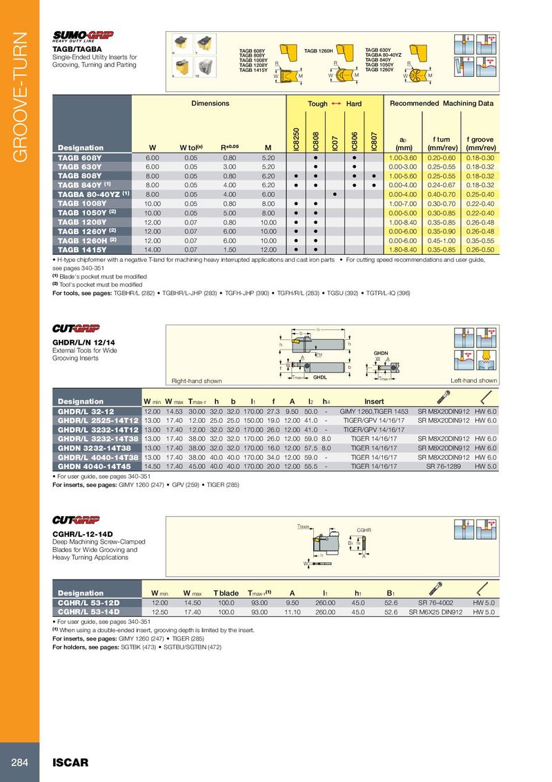 TAGB/TAGBA TAGB 608Y TAGB 1260H TAGB 630Y Single-Ended Utility Inserts for TAGB 808Y TAGBA 80-40YZ TAGB 1008Y TAGB 840Y Grooving, Turning and Parting TAGB 1208Y R R TAGB 1050Y R TAGB 1415Y TAGB 1260Y W M W M W M Dimensions Tough 1 Hard Recommended Machining Data a p f turn f groove Designation W W tol (±) R ±0.05 M IC8250 IC808 IC07 IC806 IC807 (mm) (mm/rev) (mm/rev) GROOVE-TURN TAGB 608Y 6.00 0.05 0.80 5.20 • • 1.00-3.60 0.20-0.60 0.18-0.30 TAGB 630Y 6.00 0.05 3.00 5.20 • • 0.00-3.00 0.25-0.55 0.18-0.32 TAGB 808Y 8.00 0.05 0.80 6.20 • • • • 1.00-5.60 0.25-0.55 0.18-0.32 TAGB 840Y (1) 8.00 0.05 4.00 6.20 • • • • 0.00-4.00 0.24-0.67 0.18-0.32 TAGBA 80-40YZ (1) 8.00 0.05 4.00 6.00 • 0.00-4.00 0.40-0.70 0.25-0.40 TAGB 1008Y 10.00 0.05 0.80 8.00 • • 1.00-7.00 0.30-0.70 0.22-0.40 TAGB 1050Y (2) 10.00 0.05 5.00 8.00 • • 0.00-5.00 0.30-0.85 0.22-0.40 TAGB 1208Y 12.00 0.07 0.80 10.00 • • 1.00-8.40 0.35-0.85 0.26-0.48 TAGB 1260Y (2) 12.00 0.07 6.00 10.00 • • 0.00-6.00 0.35-0.90 0.26-0.48 TAGB 1260H (2) 12.00 0.07 6.00 10.00 • • 0.00-6.00 0.45-1.00 0.35-0.55 TAGB 1415Y 14.00 0.07 1.50 12.00 • • 1.80-8.40 0.35-0.85 0.26-0.50 • H-type chipformer with a negative T-land for machining heavy interrupted applications and cast iron parts • For cutting speed recommendations and user guide, see pages 340-351 (1) Blade's pocket must be modified (2) Tool's pocket must be modified For tools, see pages: TGBHR/L (282) • TGBHR/L-JHP (283) • TGFH-JHP (390) • TGFH/R/L (283) • TGSU (392) • TGTR/L-IQ (396) l1 l2 GHDR/L/N 12/14 h h External Tools for Wide h4 GHDN Grooving Inserts A W A W f b f Tmax-r GHDL Tmax-r Right-hand shown Left-hand shown Designation W min W max T max-r h b l 1 f A l 2 h 4 Insert GHDR/L 32-12 12.00 14.53 30.00 32.0 32.0 170.00 27.3 9.50 50.0 - GIMY 1260,TIGER 1453 SR M8X20DIN912 HW 6.0 GHDR/L 2525-14T12 13.00 17.40 12.00 25.0 25.0 150.00 19.0 12.00 41.0 - TIGER/GPV 14/16/17 SR M8X20DIN912 HW 6.0 GHDR/L 3232-14T12 13.00 17.40 12.00 32.0 32.0 170.00 26.0 12.00 41.0 - TIGER/GPV 14/16/17 GHDR/L 3232-14T38 13.00 17.40 38.00 32.0 32.0 170.00 26.0 12.00 59.0 8.0 TIGER 14/16/17 SR M8X20DIN912 HW 6.0 GHDN 3232-14T38 13.00 17.40 38.00 32.0 32.0 170.00 16.0 12.00 57.5 8.0 TIGER 14/16/17 SR M8X20DIN912 HW 6.0 GHDR/L 4040-14T38 13.00 17.40 38.00 40.0 40.0 170.00 34.0 12.00 59.0 - TIGER 14/16/17 SR M8X20DIN912 HW 6.0 GHDN 4040-14T45 14.50 17.40 45.00 40.0 40.0 170.00 20.0 12.00 55.5 - TIGER 14/16/17 SR 76-1289 HW 5.0 • For user guide, see pages 340-351 For inserts, see pages: GIMY 1260 (247) • GPV (259) • TIGER (285) Tblade CGHR CGHR/L-12-14D Deep Machining Screw-Clamped B1 h1 Blades for Wide Grooving and Heavy Turning Applications l1 A W Designation W min W max T blade T max-r (1) A l 1 h 1 B 1 CGHR/L 53-12D 12.00 14.50 100.0 93.00 9.50 260.00 45.0 52.6 SR 76-4002 HW 5.0 CGHR/L 53-14D 12.50 17.40 100.0 93.00 11.10 260.00 45.0 52.6 SR M6X25 DIN912 HW 5.0 • For user guide, see pages 340-351 (1) When using a double-ended insert, grooving depth is limited by the insert. For inserts, see pages: GIMY 1260 (247) • TIGER (285) For holders, see pages: SGTBK (473) • SGTBU/SGTBN (472) 284 ISCAR