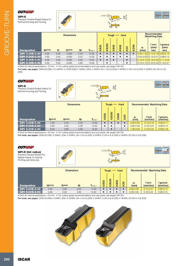 ±0.025 GIPI-E 5 8° Precision Double-Ended Inserts for 15.7 Ref. Internal Grooving and Turning W R M Recommended Dimensions Tough 1 Hard Machining Data f turn f groove a p (mm/ (mm/ Designation W ±0.02 R R ±toler M T max-r IC830 IC8250 IC808 IC908 IC20 IC20N (mm) rev) rev) GROOVE-TURN GIPI 3.00E-0.40 3.00 0.40 0.030 2.40 15.50 • • • • • • 0.50-1.50 0.14-0.18 0.06-0.12 GIPI 4.00E-0.40 4.00 0.40 0.030 3.20 15.50 • • • • • 0.50-2.00 0.15-0.21 0.08-0.15 GIPI 5.00E-0.50 5.00 0.50 0.050 4.00 15.50 • • • • 0.70-3.10 0.19-0.33 0.11-0.20 GIPI 6.35E-0.55 6.35 0.55 0.050 4.80 15.50 • • 0.70-3.10 0.23-0.30 0.13-0.21 • Dmin for internal applications = 20 mm • For cutting speed recommendations and user guide, see pages 340-351 For tools, see pages: CGIN 26 (295) • E-GEHIR / E-GHIR (289) • GAIR/L (294) • GHIR/L (W=1.9-6.4) (293) • GHIR/L-C (W=4-6.4) (293) • GHIR/L-SC (W=2-4.8) (293) GIFI-E ±0.025 5 Precision Double-Ended Inserts for 8° Internal Grooving and Turning W 15.7 Ref. R Dimensions Tough 1 Hard Recommended Machining Data a p f turn f groove Designation W ±0.02 R ±0.05 M T max-r IC830 IC8250 IC808 IC20 (mm) (mm/rev) (mm/rev) GIFI 4.00E-0.40 4.00 0.40 3.20 15.50 • • • • 0.50-2.00 0.13-0.19 0.06-0.11 GIFI 5.00E-0.50 5.00 0.50 4.00 15.50 • • • 0.60-2.50 0.16-0.24 0.08-0.14 GIFI 6.00E-0.80 6.00 0.80 4.80 15.50 • 1.00-3.00 0.19-0.34 0.09-0.18 • Dmin for internal applications = 20 mm • For cutting speed recommendations and user guide, see pages 340-351 For tools, see pages: CGIN 26 (295) • GAIR/L (294) • GHIR/L (W=1.9-6.4) (293) • GHIR/L-C (W=4-6.4) (293) • GHIR/L-SC (W=2-4.8) (293) ±0.025 GIFI-E (full radius) 5 Precision Double-Ended Full 8° 15.7 Ref. Radius Inserts for Internal M Profiling and Grooving W R Dimensions Tough 1 Hard Recommended Machining Data a p f turn f groove Designation W ±0.02 R ±0.05 M T max-r IC830 IC8250 IC808 IC20 (mm) (mm/rev) (mm/rev) GIFI 4.00E-2.00 4.00 2.00 3.20 14.00 • • • • 0.00-2.00 0.14-0.27 0.06-0.12 GIFI 5.00E-2.50 5.00 2.50 4.00 13.50 • • • • 0.00-2.50 0.18-0.34 0.08-0.15 • Dmin for internal applications = 20 mm • For cutting speed recommendations and user guide, see pages 340-351 For tools, see pages: CGIN 26 (295) • GAIR/L (294) • GHIR/L (W=1.9-6.4) (293) • GHIR/L-C (W=4-6.4) (293) • GHIR/L-SC (W=2-4.8) (293) 296 ISCAR