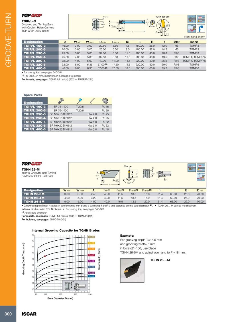 Tmax-r TGMF 635-080 TGIR/L-C dg 7 Grooving and Turning Bars Dmin f 0.5 Tmax-r h 1 19° with Coolant Holes Carrying W TOP-GRIP Utility Inserts l 2 l 1 1.6 5.5 Right-hand shown Designation d W min W max D min T max-r h 1 l 1 l 2 f Inlet Insert TGIR/L 16C-3 16.00 3.00 3.00 20.50 5.50 7.5 150.00 25.0 12.0 M6 TGMF 3 TGIR/L 20C-3 20.00 3.00 3.00 25.00 5.50 9.0 180.00 32.0 14.2 M6 TGMF 3 TGIR/L 25C-3 25.00 3.00 3.00 32.00 8.00 11.5 200.00 40.0 18.8 R1/8 TGMF 3 TGIR/L 25C-4 25.00 4.00 5.00 32.50 8.50 11.5 200.00 40.0 19.5 R1/8 TGMF 4, TGMF/P 5 TGIR/L 32C-4 32.00 4.00 5.00 42.00 11.00 14.5 220.00 50.0 25.5 R1/8 TGMF 4, TGMF/P 5 TGIR/L 32C-6 32.00 6.00 6.35 57.00 (1) 17.50 14.5 220.00 50.0 29.0 R1/8 TGMF 6 GROOVE-TURN TGIR/L 40C-6 40.00 6.00 6.35 57.00 (1) 17.50 18.0 300.00 60.0 35.2 R1/8 TGMF 6 • For user guide, see pages 340-351 (1) For Dmin 47 mm, modify insert according to sketch For inserts, see pages: TGMF (full radius) (232) • TGMF/P (231) Spare Parts Designation TGIR/L 16C-3 SR 76-1400 T-20/5 PL 16 TGIR/L 20C-3 SR 76-1400 T-20/5 PL 20 TGIR/L 25C-3 SR M5X16 DIN912 HW 4.0 PL 25 TGIR/L 25C-4 SR M5X16 DIN912 HW 4.0 PL 25 TGIR/L 32C-4 SR M6X20 DIN912 HW 5.0 PL 32 TGIR/L 32C-6 SR M6X20 DIN912 HW 5.0 PL 32 TGIR/L 40C-6 SR M6X25 DIN912 HW 5.0 PL 40 W F1 TGHN 26-M Internal Grooving and Turning h1 B1 Dmin Blades for GHIC...-70 Bars 14.5 f 35° A F1 25° 150° l1 Designation W min W max A f min (1) f max (1) F 1min (1) F 1max (1) h 1 l 1 B 1 D min TGHN 26-3M 3.00 3.00 2.40 40.0 41.5 13.5 15.0 21.4 63.00 26.0 70.00 TGHN 26-4M 4.00 5.00 3.20 40.0 41.5 13.5 15.0 21.4 63.00 26.0 70.00 TGHN 26-5M 5.00 5.00 4.00 40.0 46.5 13.5 20.0 21.4 63.00 26.0 70.00 • Grooving depth (Tmax-r) varies in conformance with blade's overhang (f andF1) and depends on the bore diameter (D) . • TGHN 26...-M can be modifiedfrom external double-sided TGHN blades • For user guide, see pages 340-351 (1) Adjustable extension For inserts, see pages: TGMF (full radius) (232) • TGMF/P (231) For holders, see pages: GHIC-70 (301) Internal Grooving Capacity for TGHN Blades 19 F1=20 Example: 18 For grooving depth T=15.5 mm F1=19 and grooving width=5 mm 17 F1=18 in bore øD=100, use blade 16 TGHN 26-5M and adjust overhang to F F1=17 , (mm) 1 =18 mm. 1 15 F1=16 TGHN 26-...M 14 F1=15 Overhang F 13 Grooving Depth Tmax (mm) F1=14 12 F1=13 Tmax 11 D f1 10 T (1) 70 100 150 200 250 Bore Diameter D (mm) 300 ISCAR