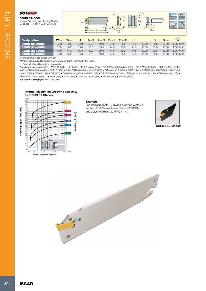 W Tmax-r CGHN 32-DGM Internal Grooving and Turning Blades B 1 17.5 h 1 Dmin for GHIC...-85 Bars (self-clamping) f 15° 25° A 83 F1 l 1 150° Designation W min W max A f min (1) f max (1) F 1min (1) F 1max (1) h 1 l 1 B 1 D min CGHN 32-3DGM 2.80 4.00 2.40 53.0 59.0 24.0 30.0 24.8 90.00 32.0 93.00 EDG 44A* CGHN 32-4DGM 3.50 5.00 3.20 53.0 59.0 24.0 30.0 24.8 90.00 32.0 93.00 EDG 44A* CGHN 32-5DGM 4.40 6.40 4.00 53.0 59.0 24.0 30.0 24.8 90.00 32.0 98.00 EDG 44A* CGHN 32-6DGM 5.60 6.40 5.20 53.0 59.0 24.0 30.0 24.8 90.00 32.0 98.00 EDG 44A* • For user guide, see pages 340-351 GROOVE-TURN (1) When using a double-ended insert, grooving depth is limited by the insert. * Optional, should be ordered separately For inserts, see pages: GIA-K (W=3-6) (254) • GIF (253) • GIF (full radius) (254) • GIF-E (W=4-6 full radius) (250) • GIF-E (W=4-6) (248) • GIM-C (402) • GIM-J (403) • GIM-J-RA/LA (403) • GIM-UT (404) • GIM-UT-RA/LA (404) • GIM-W (403) • GIM-W-RA/LA (404) • GIMF (244) • GIMN (245) • GIMY (245) • GIMY (full radius) (246) • GIMY-F (247) • GIP (252) • GIP (full radius) (253) • GIP-E (249) • GIP-E (full radius) (250) • GIPA (full radius W=3-6) (257) • GIPA (W=3-6) (256) • GIPM-A46 / GIP-1250 (313) • GIPY (255) • GITM (255) • GITM (full radius) (255) • TIP-MT (261) • TIP-WT (261) For holders, see pages: GHIC-85 (301) Internal Machining Grooving Capacity for CGHN 32 Blades T max 27 26 F1=30 Example: 25 For grooving depth T=16 and grooving width= 4 24 23 in bore øD=180, use blade CGHN-32-4DGM 22 F1=26 and adjust overhang to F1=21 mm. 21 20 F1=24 19 (mm) 18 1 17 F1=21 16 15 F1=19 14 CGHN 32-...M/DGM 13 Overhang F 12 11 F1=15 Grooving Depth Tmax (mm) 10 9 8 Tmax 7 6 5 D 4 f1 3 T (1) 80 100 150 200 250 ØD Bore Diameter D (mm) 304 ISCAR