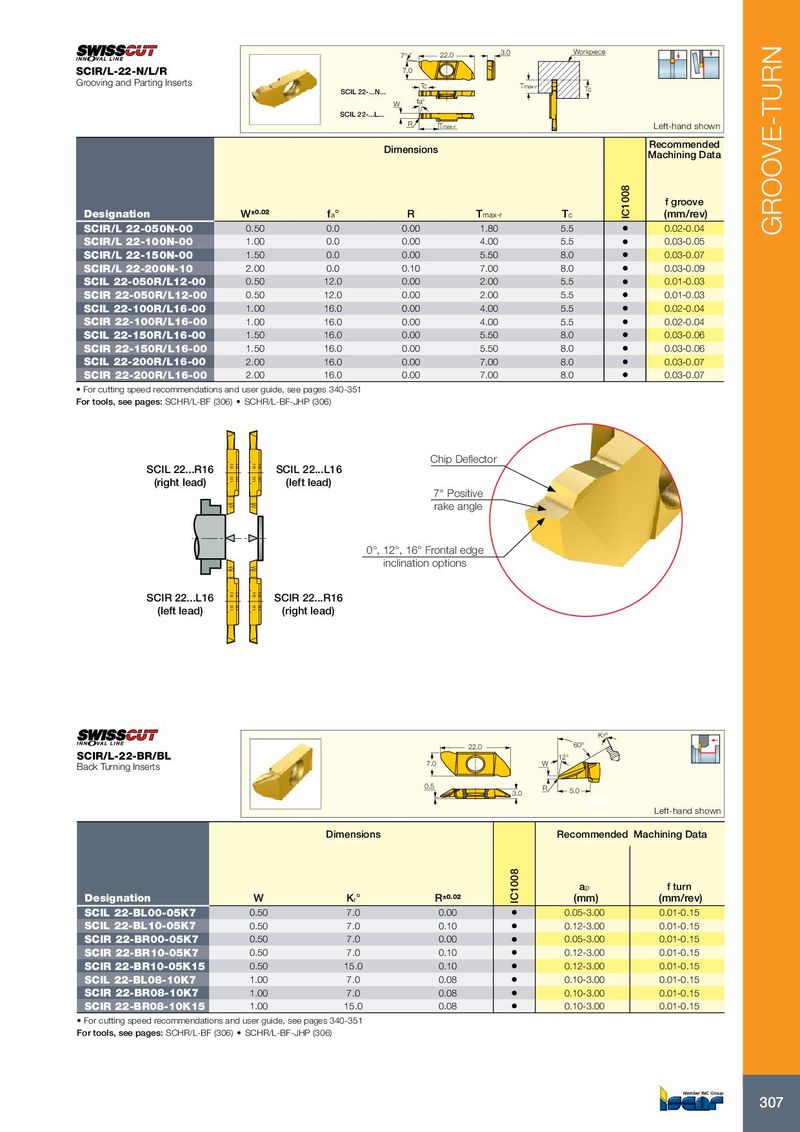 7° 22.0 3.0 Workpiece SCIR/L-22-N/L/R 7.0 Grooving and Parting Inserts Tc Tmax-r SCIL 22-...N... Tc W fa° SCIL 22-...L... R Tmax-r Left-hand shown Recommended Dimensions Machining Data f groove Designation W ±0.02 f a ° R T max-r T c IC1008 (mm/rev) SCIR/L 22-050N-00 0.50 0.0 0.00 1.80 5.5 • 0.02-0.04 GROOVE-TURN SCIR/L 22-100N-00 1.00 0.0 0.00 4.00 5.5 • 0.03-0.05 SCIR/L 22-150N-00 1.50 0.0 0.00 5.50 8.0 • 0.03-0.07 SCIR/L 22-200N-10 2.00 0.0 0.10 7.00 8.0 • 0.03-0.09 SCIL 22-050R/L12-00 0.50 12.0 0.00 2.00 5.5 • 0.01-0.03 SCIR 22-050R/L12-00 0.50 12.0 0.00 2.00 5.5 • 0.01-0.03 SCIL 22-100R/L16-00 1.00 16.0 0.00 4.00 5.5 • 0.02-0.04 SCIR 22-100R/L16-00 1.00 16.0 0.00 4.00 5.5 • 0.02-0.04 SCIL 22-150R/L16-00 1.50 16.0 0.00 5.50 8.0 • 0.03-0.06 SCIR 22-150R/L16-00 1.50 16.0 0.00 5.50 8.0 • 0.03-0.06 SCIL 22-200R/L16-00 2.00 16.0 0.00 7.00 8.0 • 0.03-0.07 SCIR 22-200R/L16-00 2.00 16.0 0.00 7.00 8.0 • 0.03-0.07 • For cutting speed recommendations and user guide, see pages 340-351 For tools, see pages: SCHR/L-BF (306) • SCHR/L-BF-JHP (306) Chip Deflector SCIL 22...R16 SCIL 22...L16 (right lead) (left lead) 7° Positive rake angle 0°, 12°, 16° Frontal edge inclination options SCIR 22...L16 SCIR 22...R16 (left lead) (right lead) Kr° 22.0 60° SCIR/L-22-BR/BL 12° 7.0 Back Turning Inserts W 0.5 R 3.0 5.0 Left-hand shown Dimensions Recommended Machining Data a p f turn Designation W K r ° R ±0.02 IC1008 (mm) (mm/rev) SCIL 22-BL00-05K7 0.50 7.0 0.00 • 0.05-3.00 0.01-0.15 SCIL 22-BL10-05K7 0.50 7.0 0.10 • 0.12-3.00 0.01-0.15 SCIR 22-BR00-05K7 0.50 7.0 0.00 • 0.05-3.00 0.01-0.15 SCIR 22-BR10-05K7 0.50 7.0 0.10 • 0.12-3.00 0.01-0.15 SCIR 22-BR10-05K15 0.50 15.0 0.10 • 0.12-3.00 0.01-0.15 SCIL 22-BL08-10K7 1.00 7.0 0.08 • 0.10-3.00 0.01-0.15 SCIR 22-BR08-10K7 1.00 7.0 0.08 • 0.10-3.00 0.01-0.15 SCIR 22-BR08-10K15 1.00 15.0 0.08 • 0.10-3.00 0.01-0.15 • For cutting speed recommendations and user guide, see pages 340-351 For tools, see pages: SCHR/L-BF (306) • SCHR/L-BF-JHP (306) 307