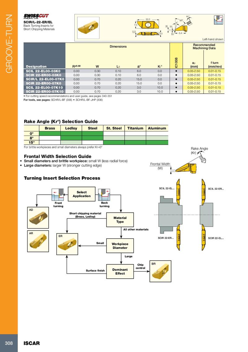 Kr° 22.0 60° SCIR/L-22-ER/EL a° Back Turning Inserts for 7.0 W L5 Short Chipping Materials 0.5 3.0 R 5.4 Left-hand shown Recommended Dimensions Machining Data a p f turn Designation R ±0.02 W L 5 a° K r ° IC1008 (mm) (mm/rev) GROOVE-TURN SCIL 22-EL00-03K0 0.00 0.30 0.10 6.0 0.0 • 0.05-2.50 0.01-0.15 SCIR 22-ER00-03K0 0.00 0.30 0.10 6.0 0.0 • 0.05-2.50 0.01-0.15 SCIR/L 22-EL00-07K0 0.00 0.70 0.20 15.0 0.0 • 0.05-2.50 0.01-0.15 SCIR 22-ER00-07K0 0.00 0.70 0.20 15.0 0.0 • 0.05-2.50 0.01-0.15 SCIL 22-EL00-07K10 0.00 0.70 0.20 3.0 10.0 • 0.05-2.50 0.01-0.15 SCIR 22-ER00-07K10 0.00 0.70 0.20 3.0 10.0 • 0.05-2.50 0.01-0.15 • For cutting speed recommendations and user guide, see pages 340-351 For tools, see pages: SCHR/L-BF (306) • SCHR/L-BF-JHP (306) Rake Angle (Kr°) Selection Guide Brass Ledloy Steel St. Steel Titanium Aluminum 0° 8° 15° For brittle workpieces and small diameters always prefer Kr=0° Rake Angle (Kr) Frontal Width Selection Guide • Small diameters and brittle workpiece: small W (less radial force) Frontal Width • Large diameters: larger W (stronger cutting edge) (W) Turning Insert Selection Process SCIL 22-EL... SCIL 22-ER... Select Application Front Back turning turning AD Short chipping material (Brass, Ledloy) Material Type All other materials AR ER SCIR 22-ER... SCIR 22-EL... Small Workpiece Diameter Large Chip BR control Surface finish Dominant Effect 308 ISCAR